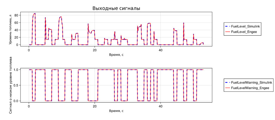Для сравнения результатов расчета моделей Engee и Simulink был подготовлен набор тестовых сценариев, представляющих собой сигналы режимов работы блока управления и показания датчиков уровня топлива. В тесты вошли как стандартные сценарии компонентного тестирования, так и варианты со случайными входными воздействиями.Сравнение результатов выполнения моделей в Engee и Simulink проводилось по ключевым критериям: временные характеристики, переходные процессы, установившиеся значения уровня топлива и формируемые сигналы предупреждения. Результаты показали полное совпадение расчетов в обеих средах, что подтверждает корректность переноса модели и высокую точность реализации алгоритмов в Engee Выполненные тесты подтвердили сходимость результатов моделирования алгоритмов в Engee и Simulink. Engee может быть использована для разработки математических моделей алгоритмов и переноса моделей из Simulink без изменения логики и структуры систем в существующих проектах. В целях дальнейшего развития среды Engee, мы рекомендуем расширить поддержку типов данных с фиксированной точкой и обеспечить автоматическую генерацию кода под целевые контроллеры электронных блоков управления.