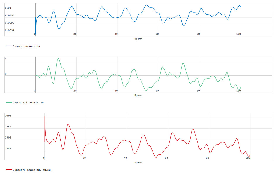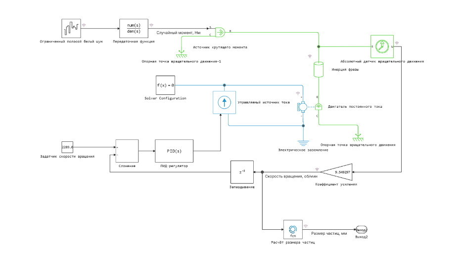 Модель учитывала нелинейные характеристики электромеханических преобразований и переменную нагрузку на фрезерный измельчитель, описываемую как стационарный эргодический процесс.