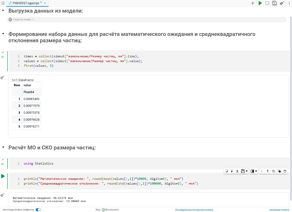 С помощью библиотеки механики и электричества была реализована модель электропривода и воздействий на него в процессе измельчения мясного сырья. Также был разработан интерактивный скрипт, в котором рассчитываются математическое ожидание и среднеквадратическое отклонение размеров мясных частиц (кусочков фарша). Ниже представлены результаты вычислений, полученные в Engee: математическое ожидание и среднеквадратическое отклонение 98 и 13 мкм соответственно. Полученные результаты сравнивали с результатами исследований, проводимых ФНЦ пищевых систем им. В.М. Горбатова на говядине 2-го сорта с использованием измельчителя консольного типа с мелкозубчатой фрезой. Зафиксированные расхождения между результатами находились в пределах допустимой нормы. Результаты проекта были представлены на секции Ученого совета «Биотехнологии, процессы и оборудование для мясных систем» ФНЦ пищевых систем им. В.М. Горбатова и получили высокую оценку экспертов. Это не первый опыт сотрудничества с ФНЦ пищевых систем им. В.М. Горбатова РАН. В соавторстве с инженерами ЦИТМ «Экспонента», были опубликованы научные статьи о применение Engee в журнале «Мясная индустрия»: Плодотворная работа по цифровизации пищевого производства в российской среде Engee успешно продолжается, и мы уверены, что это далеко не последний наш совместный проект!