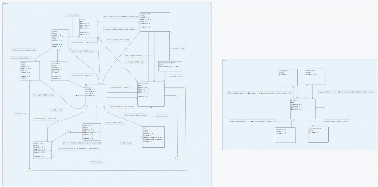 1. Успешная реализация сложной логики: Используя мощные возможности Engee, включая библиотеку базовых блоков, инструменты создания Конечных автоматов и непосредственную интеграцию стороннего Си-кода в модели, специалисты ГосНИИАС реализовали требования к поведению важных виджетов: Scroll List (Прокручиваемый список) и ComboBox (Раскрывающийся список).Эти элементы являются неотъемлемой частью человеко-машинного интерфейса (HMI), особенно в системах навигации и самолетовождения.