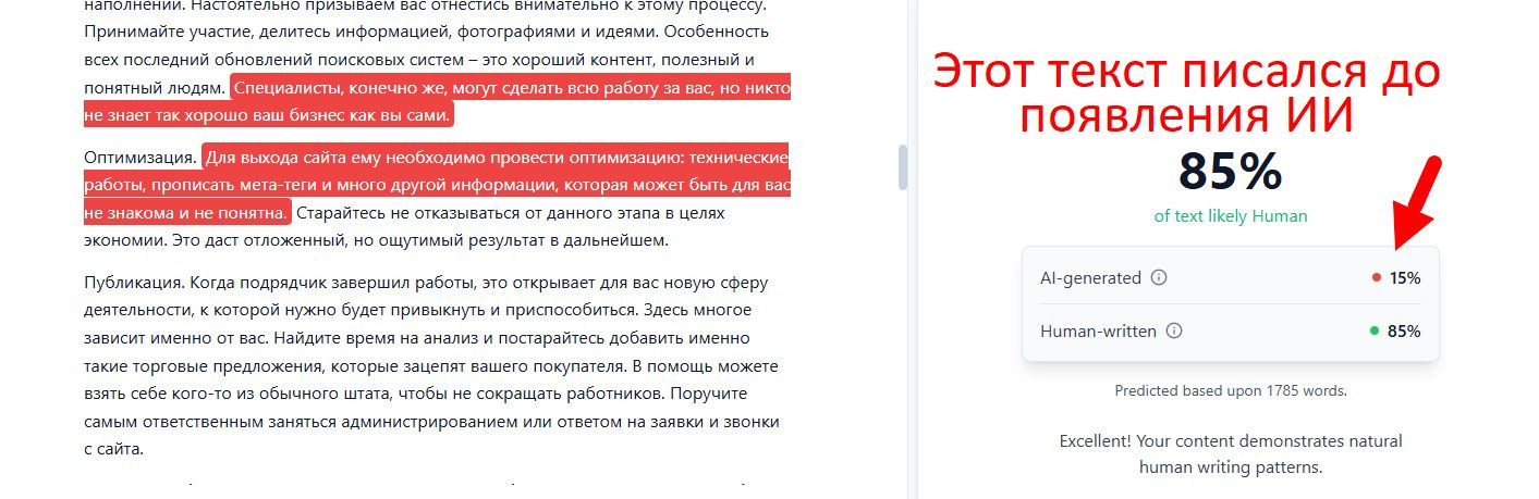Уже на первом этапе становится очевидно: ИИ-детекторы не могут объективно определить происхождение текста, а тем более — не влияют на видимость сайта в поиске.