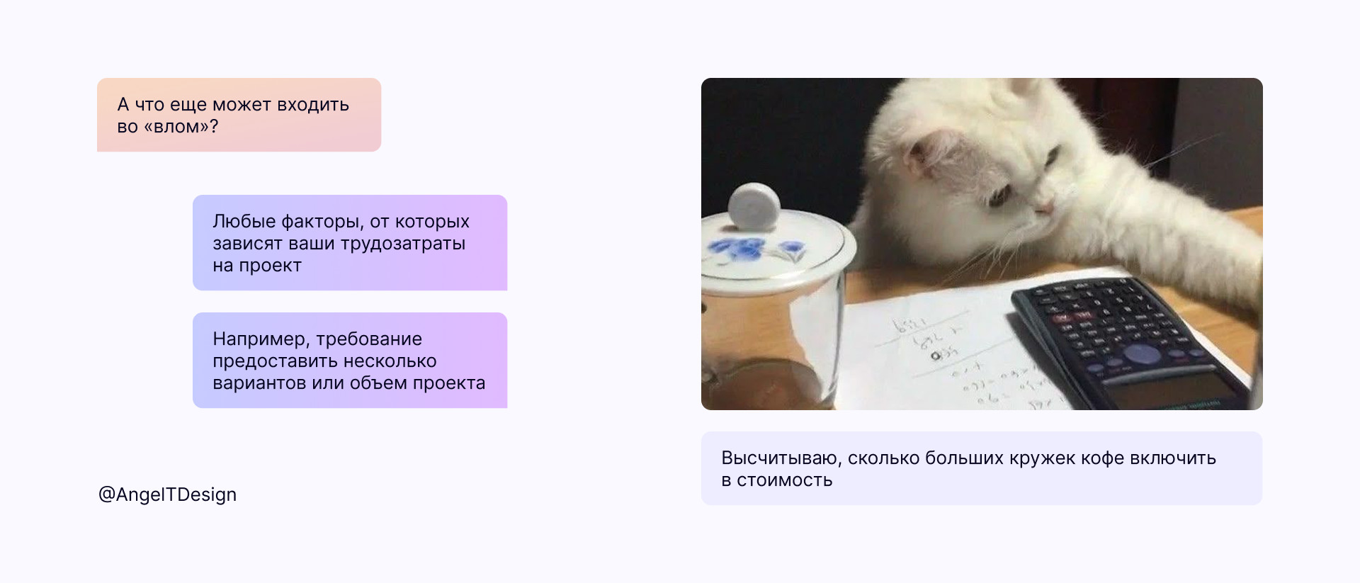 *влом в данном случае — это параметр, который учитывает загруженность, сложность проекта, заинтересованность и другие важные вам факторы Такой способ может понравиться более опытным товарищам, которые знают какие задачи откликаются, а какие для них более сложные. Мой опыт подсказывает, что это самый удобный метод, потому что цена получается индивидуальной под проект, а оттого становится более выгодной и для вас, и для клиента. С цифрами разобрались, теперь приступаем к тем самым страшным мыслям:
