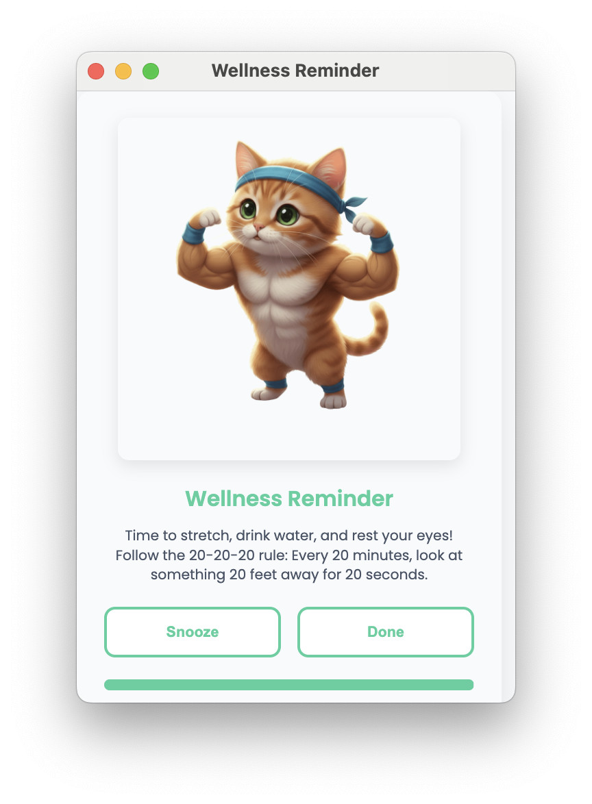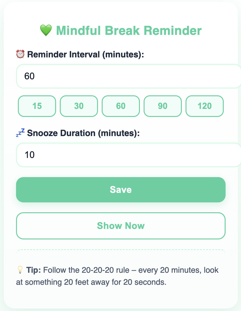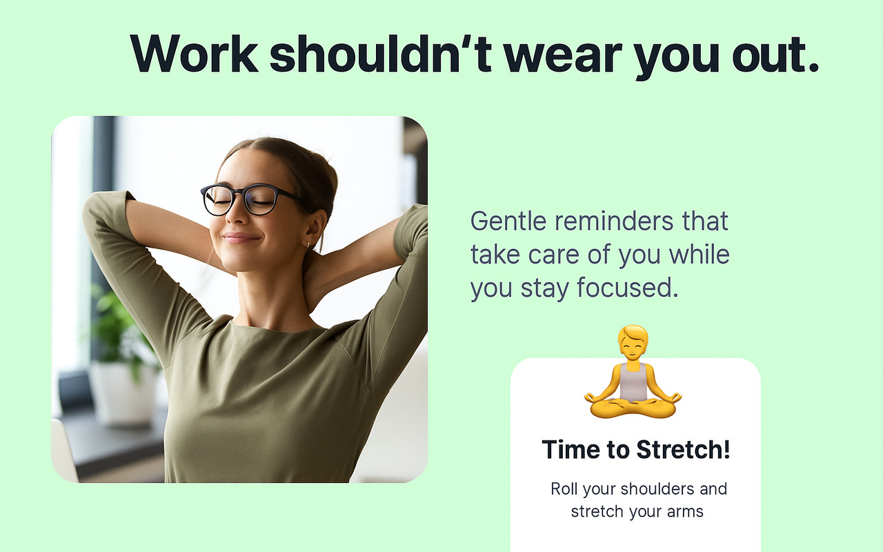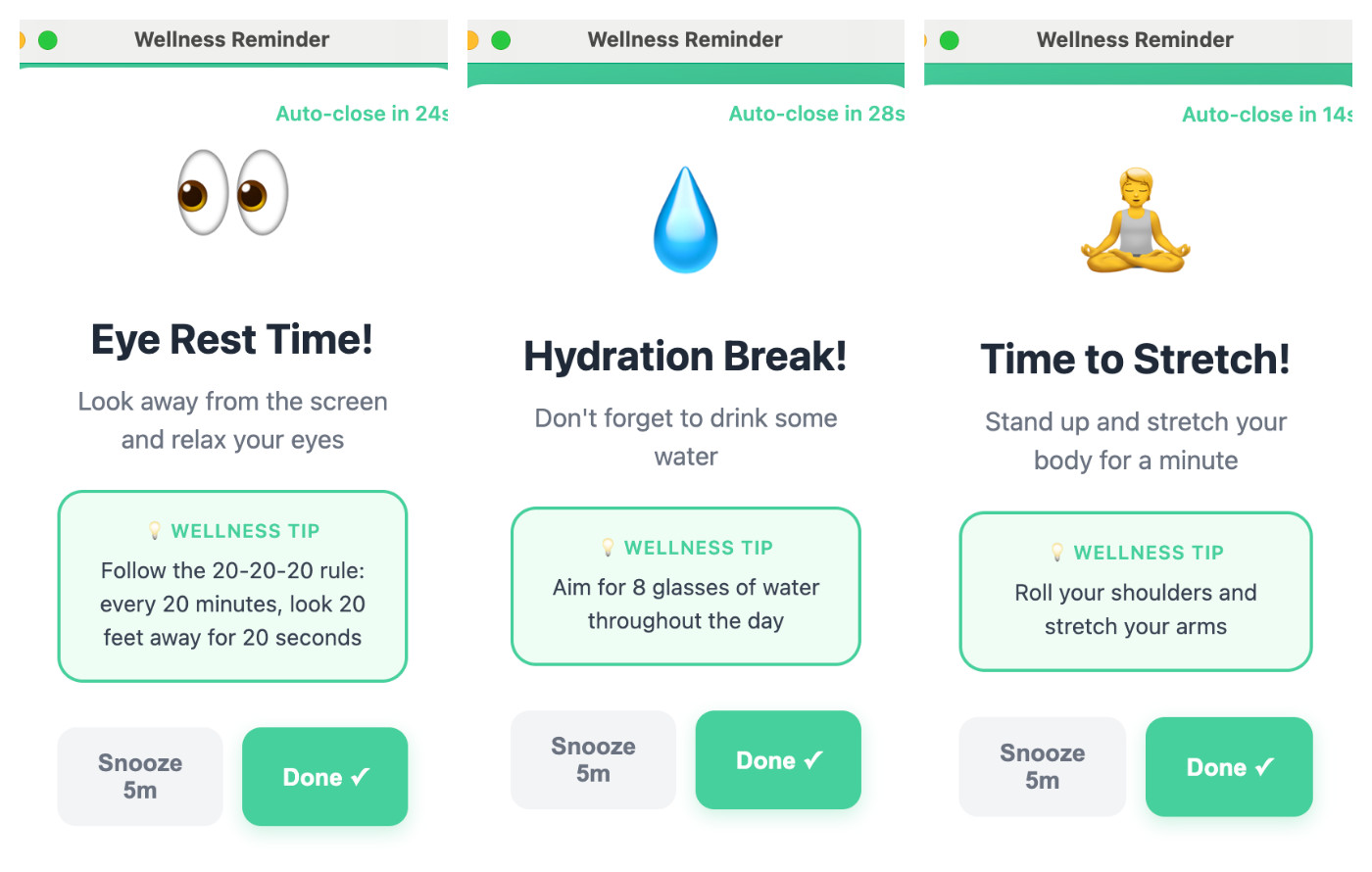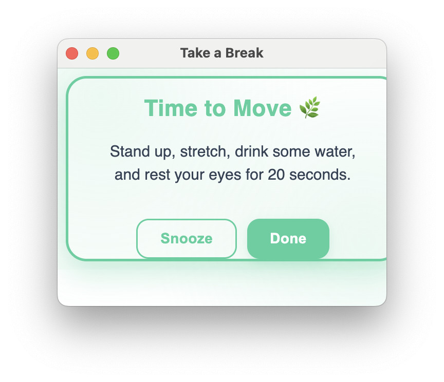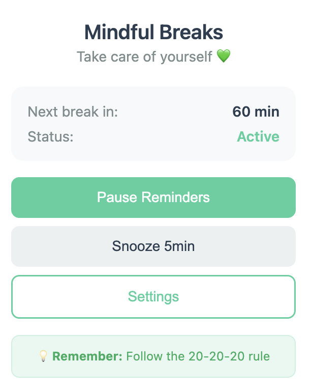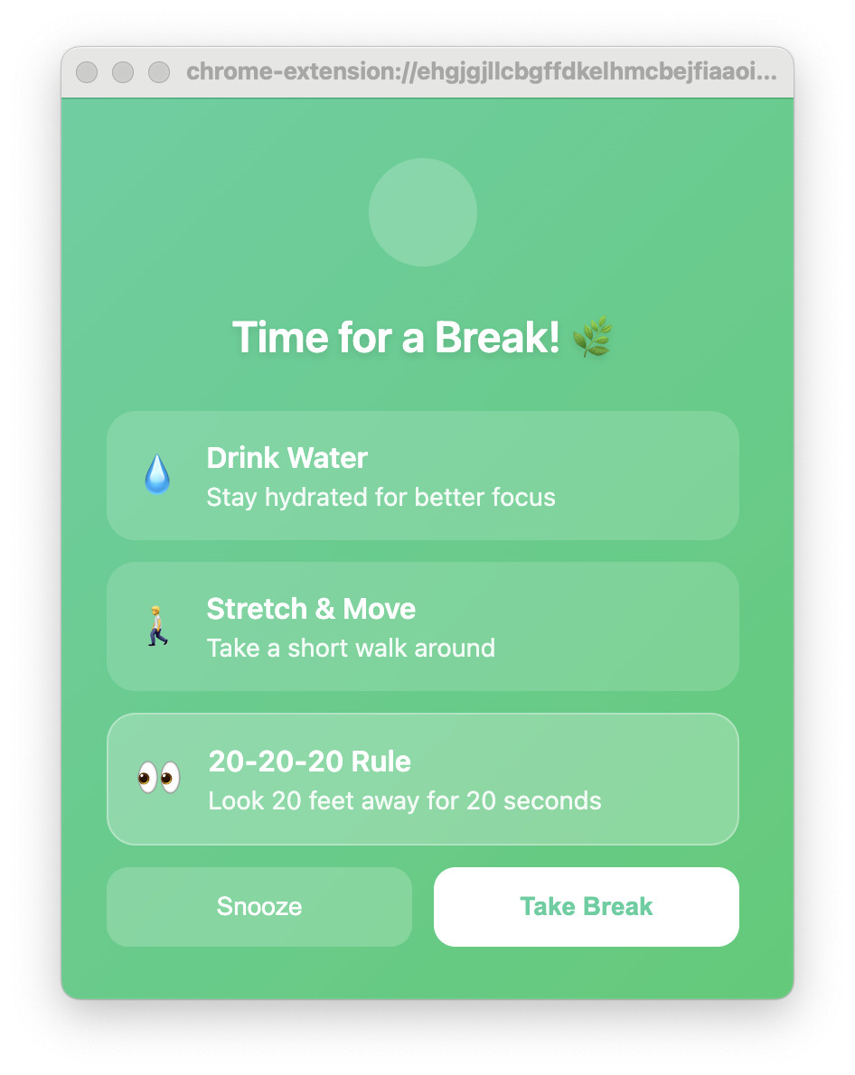 Можешь написать код: стильное минималистичное расширение для хром задача которого бы была каждые 60 минут показывать милую красивую всплывашку о том что пора размяться, выпить воды и сделать отдых для глаз. Расширение полностью на английском языке. Цветовой дизайн в этом цвете #45D09E