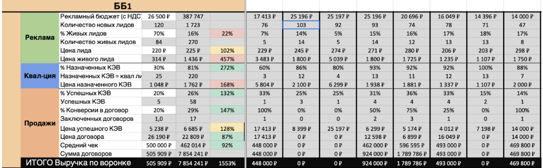 - Отслеживаем все ключевые метрики через сводную таблицу: стоимость живой заявки, стоимость лида, который пришел на ключевой этап воронки и стоимость продажи