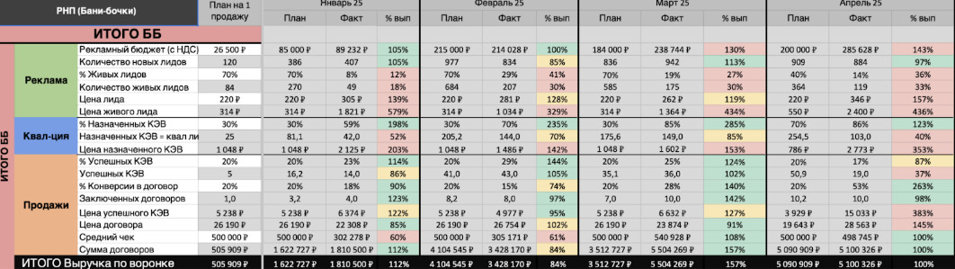 Мы заходим на рынок не только по каркасным баням, но и по альтернативным вариантам. Основной конкурент для нас — это бани-бочки, поэтому основная рекламная атака идет на них. Кроме того, мы берем семантику всех остальных типов бань и даже смежные запросы, например, фундаменты под баню. На этом этапе можно поймать потенциальных клиентов, которые позже переориентируются на каркасные или готовые банные конструкции. Сайт был подготовлен нашими партнерами — это лендинг со встроенным квизом, который сразу фильтрует реальных покупателей. Рекламу мы настраивали сами, используя и поиск, и РСЯ. Основной принцип работы — квалифицированный лид, который реально заинтересован в покупке, подходит по среднему чеку и готов к сделке в течение цикла продаж. Воронка выглядит так: Лид → Назначенная встреча → Встреча → Договор Каждый этап оцифрован. Мы понимаем, сколько лидов прошло фильтр, сколько встреч назначено и состоялось, сколько договоров заключено. Это позволяет планировать результаты на месяц, квартал, год и контролировать KPI. Для запуска мы рассчитываем ТЗ на закупку трафика: чтобы получить одну продажу стоимостью 26 500 ₽, нужно примерно 5 проведенных встреч, 25 назначенных встреч и 84 живых лида. На месяц это 453 заявки с ценой 221 ₽, из которых 317 — живые. Рекламный бюджет 100 000 ₽ дает прогнозируемую выручку 1,9 млн ₽, Для РСЯ мы применили интересную стратегию «ручной разгон»: сразу запустили кампании на максимум кликов с ручными ставками. В первый же день получили 12 лидов и быстро перевели кампании на автоматическую стратегию. После этого система быстро «раскачалась» и начала давать стабильные результаты. Бюджеты были небольшие, а заказчик пополнял кабинет частями, но даже в таких условиях за первый месяц работы удалось получить: По данным РНП видно, что даже при значительных колебаниях живых лидов и стоимости КЭВ система стабильно приносила качественные заявки. За период с конца декабря по май получили 3 567 новых лидов, из которых 636 оказались живыми Стоимость лида варьировалась от 130 ₽ до 798 ₽, а средняя цена живого лида составила 1 599 ₽, что почти в 5 раз выше базового планового показателя 314 ₽, но при этом поток заявок оставался стабильным и главное — окупаемым. Главное в работе с Яндекс Директом — не дешевая, а качественная заявка, которая в итоге окупит рекламный бюджет. Назначенных КЭВ за этот период было 513, при этом успешных КЭВ — 130, что дало 39 заключенных договоров. Цена успешного КЭВ колебалась от 404 ₽ до 16 376 ₽, а средняя цена договора составила 26 079 ₽, даже дешевле, чем плановые 26 500 ₽. Общая выручка по воронке достигла 18,97 млн ₽, при среднем чеке около 486 000 ₽. Основная сложность заключалась в конверсии лидов в продажи: часть заявок нуждалась в квалификации и обработке, что напрямую влияло на итоговую выручку. Но даже с ограниченным бюджетом система показывала стабильный поток качественных лидов, а грамотно построенная стратегия обеспечивала прогнозируемые продажи и выручку. Частая проблема — менеджеры универсалы, которые умеют заключать сделки, но не занимаются дожимом холодных лидов и прогревом клиентов. Это ломает воронку и снижает эффективность рекламы. Наше решение — удаленный лид-менеджер, который: Такой сотрудник разгружает менеджера универсала и повышает конверсию встреч и договоров в 2–5 раз. Рекламный бюджет при этом ра