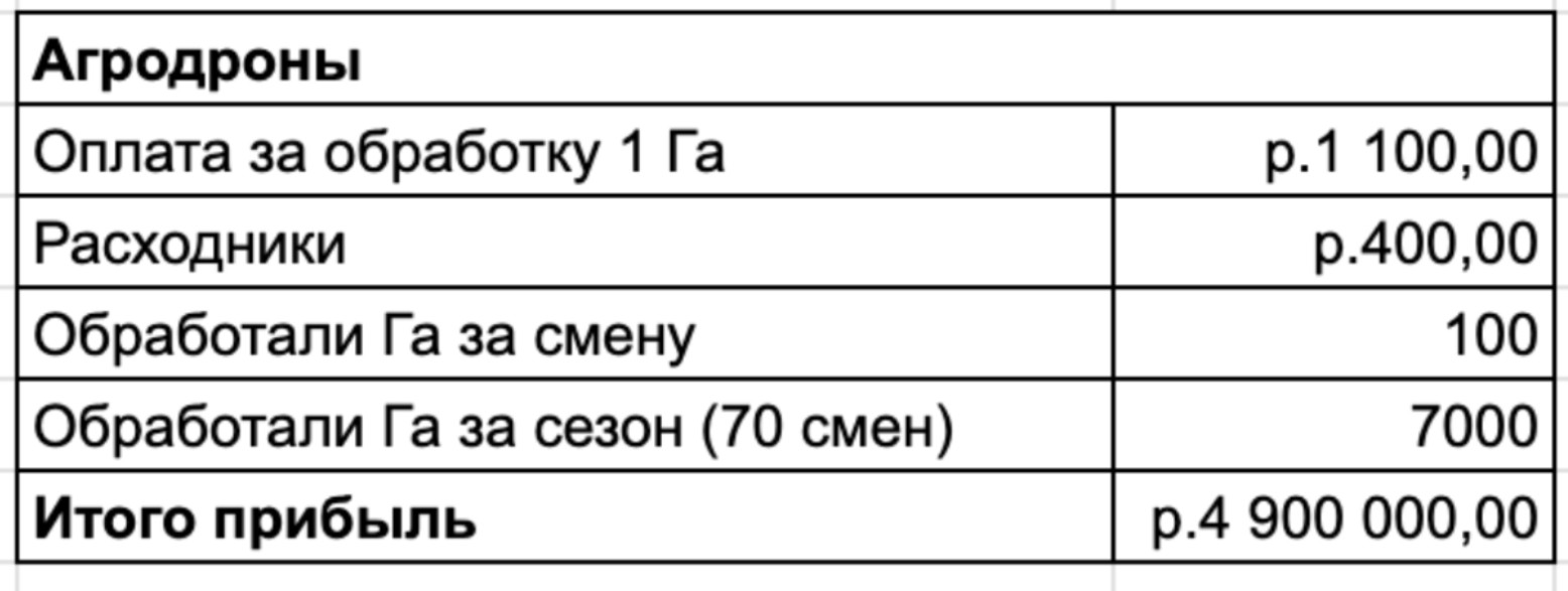 Это валовый доход. Из него вычитаются расходы на топливо для генератора, амортизацию батарей и транспортировку. Обычно на обработку одного гектара уходит 400 рублей, то есть, если вы выкупили дрон, используете свой автомобиль, не платите обработчикам и в целом тратитесь только на расходники, чистыми будете зарабатывать 600-800 рублей/Га. А это 90 000-120 000 рублей за смену.