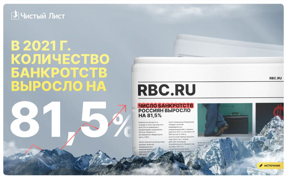 Здесь появляются юридические компании, которые помогают пройти процедуру за деньги. Одна из крупнейших — Чистый Лист. Компания работает с 2014 года, провела через банкротство более 20 000 клиентов.