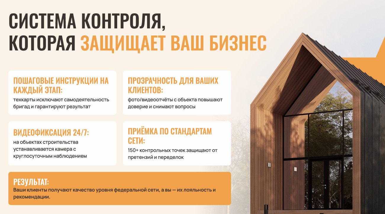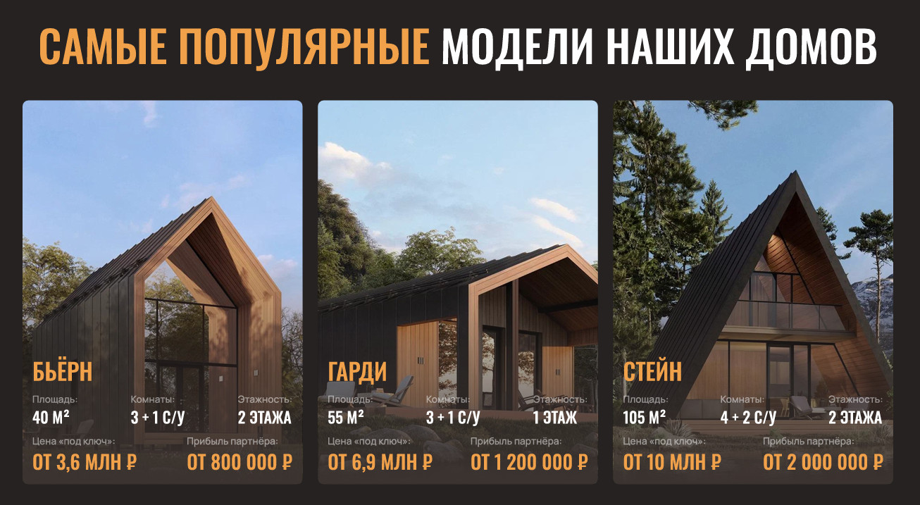 ФАКТ: Компания построила более 50 объектов различного формата — от A-frame домов до барн-хаусов, которые эксплуатируются от 1 до 5 лет без серьезных проблем.
