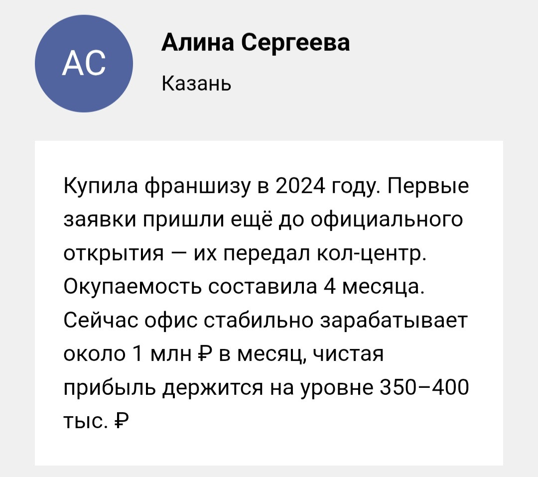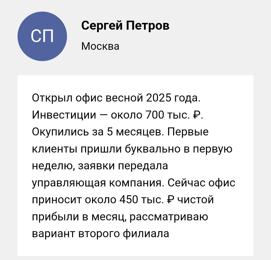 Простые услуги стоят недорого — это привлекает. Сложные документы и долгосрочные программы дороже. Клиент платит за результат и экономию своего времени. Франчайзи получает справедливую комиссию.