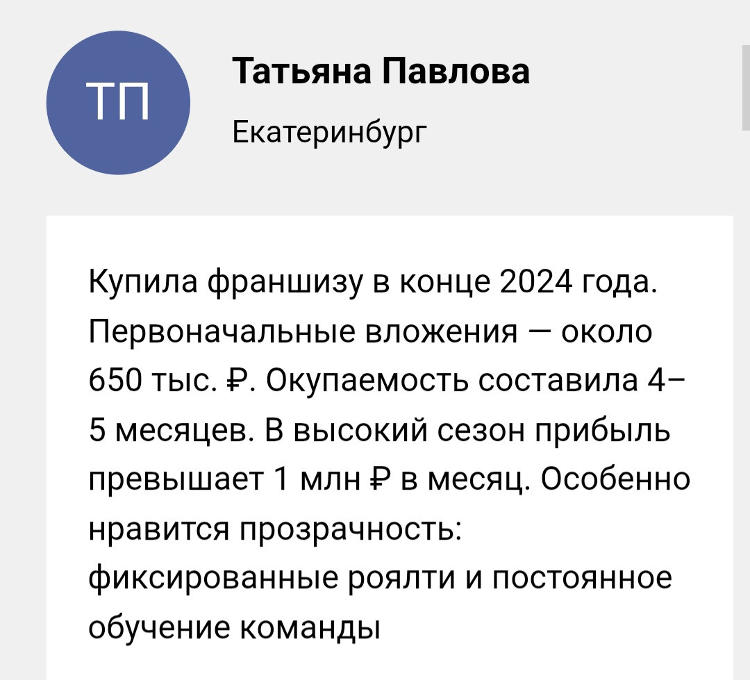 Поэтому франшиза «Центр Путешествий № 1» сейчас на слуху у предпринимателей. Компания предлагает модель с семью источниками заработка — от классических путёвок до гражданства ЕС. И заявленная окупаемость в 4 месяца звучит намного привлекательнее, чем у большинства конкурентов.