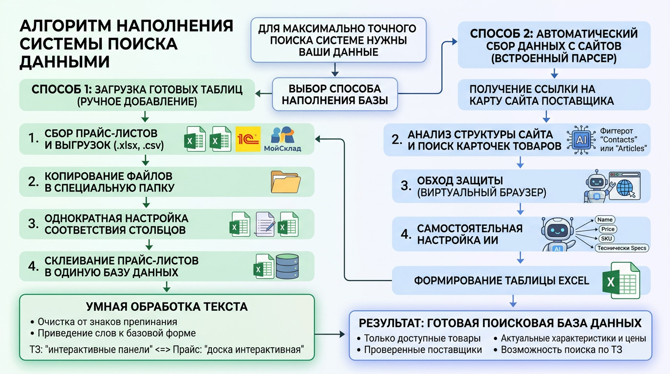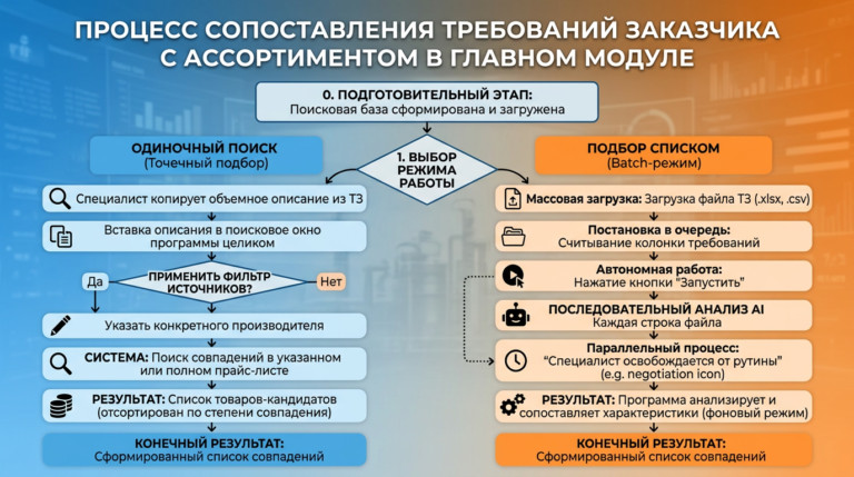 Задача специалиста — найти под эти пространные требования подходящие товары в своей базе или в прайс-листах дистрибьюторов (где могут быть десятки тысяч строк), сопоставить их и просчитать экономику. А если человек новый в нише? А если специфика сложная? Обычно это решается вычленением ключевых слов и бесконечным нажатием Ctrl+F по вкладкам Excel. Это долго, дорого и ведет к ошибкам из-за банальной усталости.