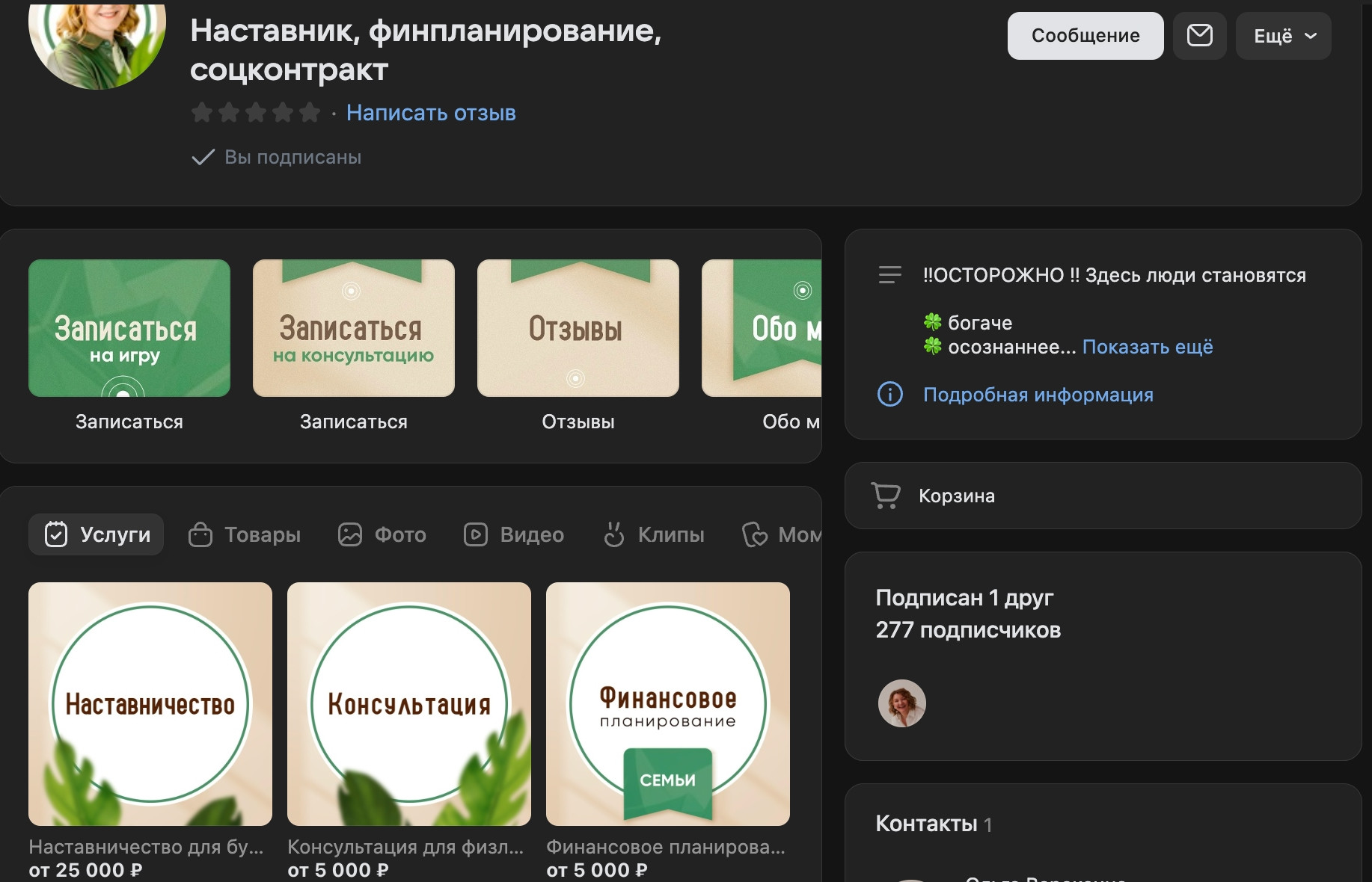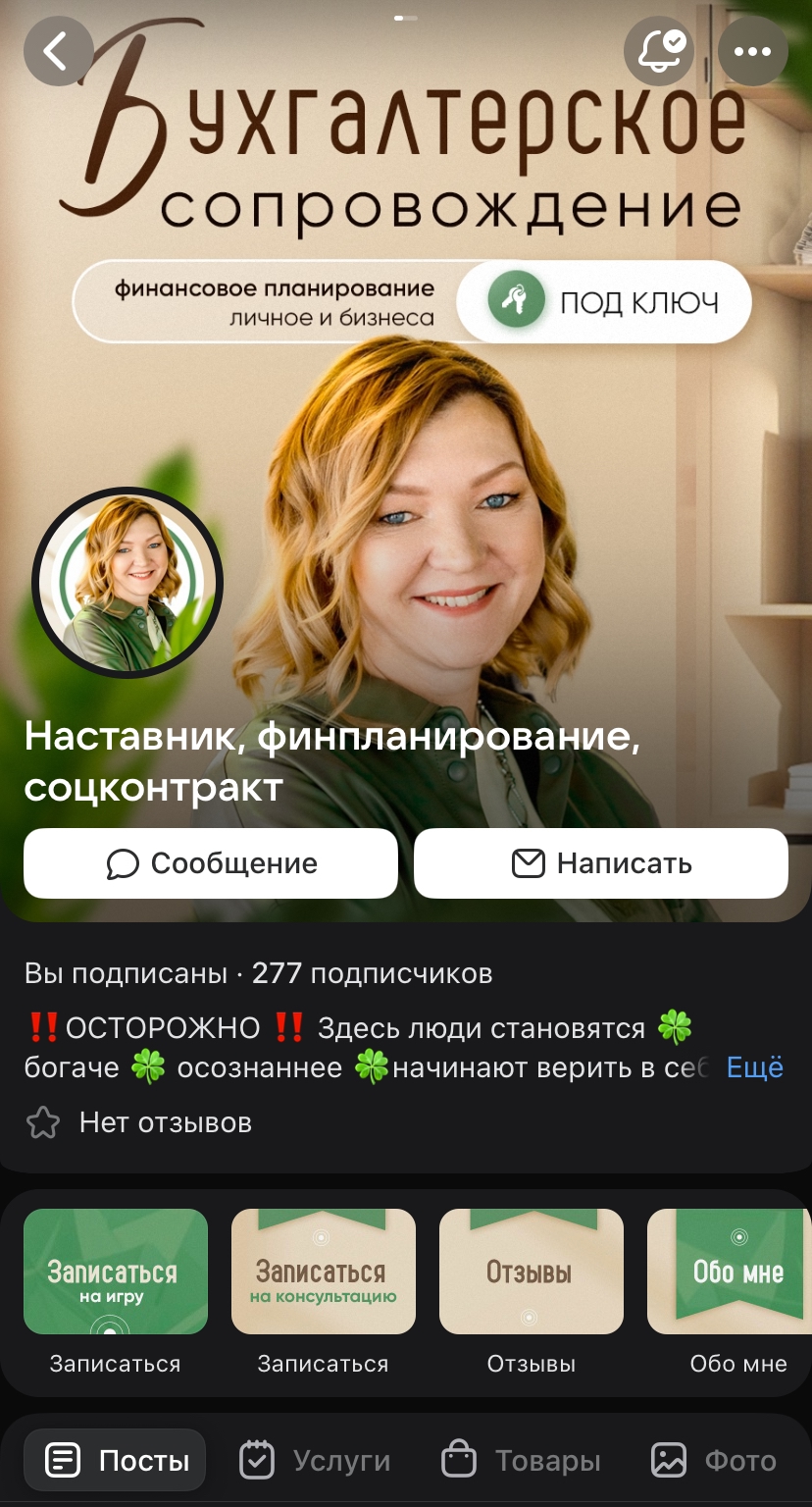 При создании нового сообщества, ВКонтакте предложит вам пригласить в нее своих друзей (смотрите скриншот выше). Так вот. Ни в коем случае не стоит добавлять туда именно друзей! Дело в том, что если вы планируете запускать рекламу во ВКонтакте и привлекать себе подписчиков и клиентов, то рекламные алгоритмы при выборе кому показывать вашу рекламу, будут ориентироваться на ваших подписчиков в группе. А какие из ваших друзей клиенты?— Никакие, они с вами дружат бесплатно (будем думать позитивно 😂) Поэтому, чтобы реклама работала эффективно и привлекала вам в группу людей, похожих на ваших клиентов, а не на ваших друзей. То последних в группу не добавляем! А вот клиентов можно :) Как видите, новоиспеченная группа во ВКонтакте выглядит уныло. Но даже оформленная группа без понимания нюансов может навредить продажам. — Вызывает доверие; — За 5 секунд объясняет клиенту, куда он попал и чем здесь могут помочь; — Помогает быстро найти любую интересующую информацию; — Направляет и мотивирует потенциального клиента сразу оставить заявку. Давай разберем из каких элементов стоит группа, которые требуется оформить. Здесь показываем скриншот пустой группы. На котором визуально показываем, что, где и как называется: обложка, аватарка, меню. Как говорят: «Встречают по одежке». Обложка— первое, что видит клиент при переходе в группу. Именно из информации, что будет написано на обложке, клиент за 5 секунд должен понять: куда он попал и что здесь нахрен происходит предлагают? Поэтому на хорошей обложке обычно указывают: — Название бухгалтерского бюро и / или фамилия и имя бухгалтера — Логотип бухгалтерии и / или фотография бухгалтера (🔥 вариант для доверия) — Чем вы занимаетесь и для кого. Например: «Бухгалтерское сопровождение для онлайн-школ и частных экспертов» — Призыв к действию. Например: «Запишитесь на бесплатную консультацию» ➕ Правильная визуализация. Нам же не нужно на фото пирамиды подписывать, что это пирамида. Итак понятно 🇪🇬 Так и с дизайном для обложки для бухгалтера. Есть визуальные образы, ассоциирующееся с профессией: полки с папками документов, калькулятор, таблицы, логотип налоговой или 1С. Добавив такие элементы на обложку, мы помогаем потенциальному клиенту понять куда он попал, даже не вчитываясь в текст. Что НЕ стоит указывать на обложке: — Адрес офиса / Ссылку на сайт. Для этого есть разделы ниже; — Писать много текста. ВКонтакте используют с телефонов, чтобы уместить весь текст потребуется его так сильно сжать, что он станет не читабелен; — Вставлять туда первое понравившееся изображение из интернета 👇 Во-первых. Ай-яй-яй и авторское право. А во-вторых, размеры, КАРЛ! Важно, чтобы изображение одновременно хорошо смотрелось и на телефонах, и на компьютерах! Ольга — бухгалтер, финансист и наставник в одном лице. Обратилась ко мне за оформлением сообщества VK «с нуля». Мы с Ольгой вместе определили, как она видит будущее оформление. Главные пожелания: деловой стиль, подчеркивающий экспертность. В сочетании с легкостью, которую излучает сама Ольга) При оформлении обложки я использовала: — Приятно бежевые и зеленые цвета. Ассоциирующиеся со спокойствием, теплом и деньгами; — На заднем фоне добавила типичные папки с документами, которые так же визуально ориентируют человека, куда он попал; — Главное место и акцент в обложке о