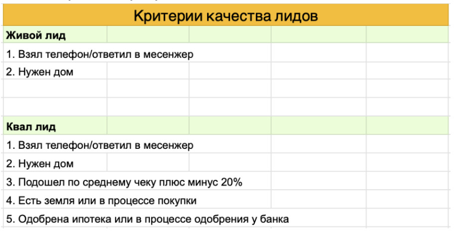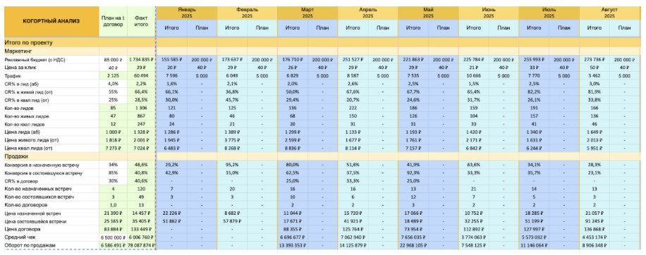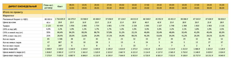 Остановлюсь подробнее на доле рекламных расходов. Её высчитывали таким образом: Путь клиента по воронке продаж выглядит так: Каждую неделю мы готовим таблицу-отчет, которая показывает весь путь клиента и эффективность воронки. В данном случае мы собирали статистику каждый день и подбивали её по месяцам: Перед запуском рекламной кампании мы провели анализ конкурентов в нише строительства домов из газобетона. Сначала собрали компании, которые конкурируют с клиентом по ключевым запросам вроде: «построить дом из газобетона», «дом под ключ цена», «строительство домов Москва и область» и т.д. Каждый сайт оценивали по этим критериям: качество и уникальность оффера; наличие квиза и насколько удобно оставить заявку; уровень доверия (отзывы, фото построенных объектов, процесс стройки, видео и сертификаты); упаковка преимуществ и прозрачность цен. Каждому конкуренту присваивался рейтинг от 1 до 5, и за эталон мы брали сайты с оценкой 4 и выше. Так определили, какие элементы необходимо улучшить на нашем сайте. Отдельно проанализировали рекламу конкурентов в Директе — в поиске и в РСЯ. Мы собрали все баннеры, заголовки и тексты, чтобы понять, какие офферы действительно работают. На основе этого мы выстроили собственную стратегию, чтобы выделиться среди типовых объявлений, усилить креативы и привлечь качественный трафик уже с первых дней запуска. На сайте были выделены ключевые блоки, которые закрывают основные боли и сомнения клиентов: В проекте особое внимание уделили работе отдела продаж. Менеджеров обучили грамотно выявлять потребности клиента — понимать, какой дом он хочет построить, в какие сроки и с каким бюджетом. Также отработали умение доносить преимущества фиксированной цены и прозрачных расчетов. Для удобства общения мы разработали короткие, понятные скрипты, которые помогают легко назначить встречу с инженером и перевести клиента на следующий этап без давления. Кроме того, внедрили систему контроля назначенных встреч, которая позволяет отслеживать, кто действительно дошел до встречи, и вовремя корректировать работу менеджеров. Благодаря этому, конверсия оставалась на стабильно высоком уровне. Мы также определили критерии качества заявок: Это очень важно, чтобы детально отслеживать всю статистику. Мы выстраиваем процесс по принципу РНП (рука на пульсе), что подразумевает еженедельную проверку всех ключевых показателей с сопоставлением с плановой декомпозицией. Все результаты фиксируются в таблице когортного анализа, которая позволяет видеть, как клиенты проходят путь от первого обращения до заключения договора, а также отслеживать реальную окупаемость рекламных вложений. Не все сделки закрываются мгновенно, поэтому отдел продаж сопровождает часть клиентов и доводит их до подписания договора. В нише строительства домов цикл сделки может растягиваться на 2–3 месяца. Общая статистика за 8 месяцев: Итого за период: заключили 13 договоров и сделали клиенту оборот в 78,09 млн ₽.Сохранили сверхнизкую долю маркетинговых затрат: рекламный бюджет в 1,73 млн ₽ составляет чуть более 2% от полученного оборота. Но и это не главное — стоимость привлечения одного клиента оказалась всего 133 тыс. ₽, что составляет примерно 0,002% от среднего чека (6 млн ₽). Это не просто выполнение KPI — это результат, который многократно превосходит ста