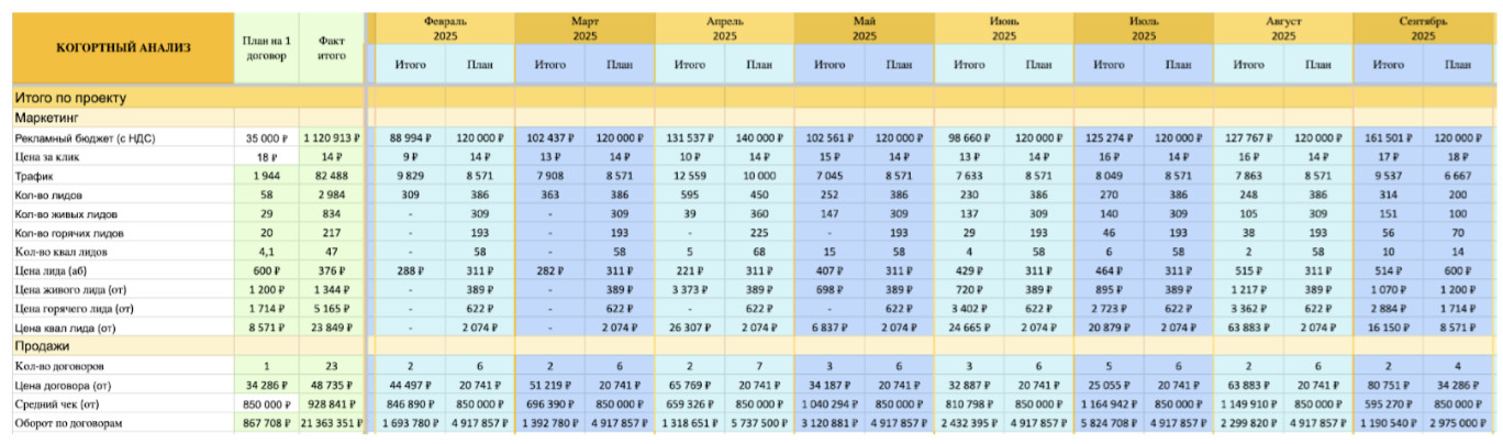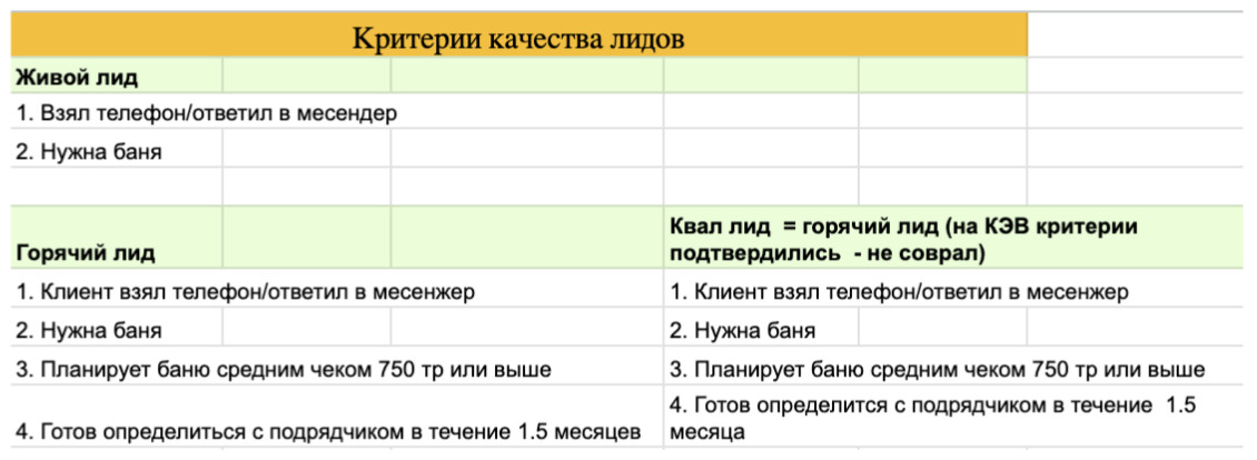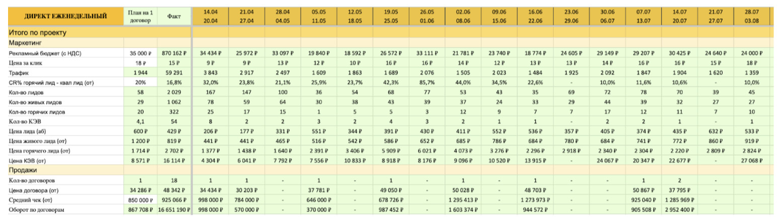 Основные показатели, которых мы хотели достичь: Мы построили путь клиента по всей воронке, чтобы видеть каждый шаг. Его можно увидеть на скрине декомпозиции выше. Мы еженедельно собираем информацию о пути клиента и работе воронки в таблицу, чтобы отследить эффективность решений. Вот так выглядит еженедельный отчет по нашей работе: Здесь часть данных, полную статистику вы увидите в конце статьи Перед запуском проекта мы провели детальный анализ рынка строительства и установки каркасных бань. Сначала собрали рекламные кампании по основным поисковым запросам: «каркасная баня под ключ», «баня с установкой цена» и так далее. Затем оценили сайты конкурентов по ряду критериев: качество оффера, наличие калькулятора стоимости или квиза, фото и видео готовых объектов, реальные отзывы, демонстрация этапов строительства. Каждому ресурсу присваивался рейтинг от 1 до 5 баллов. Для ориентира в своей стратегии мы брали сайты с оценкой не ниже 4. Далее мы детально разобрали ключевые тезисы и УТП конкурентов, выявили их сильные и слабые стороны, после чего сформировали собственные уникальные предложения и офферы, которые выгодно отличают нас на рынке. Параллельно провели анализ рекламы в Директе: изучили, какие баннеры и тексты лучше работают, какие заголовки цепляют и какие изображения вызывают доверие у целевой аудитории. При создании сайта мы учитывали: Тезисы для сайта делали с помощью нейросетей и каждое слово переписывали руками под специфику ниши. Так мы собрали достаточное количество материалов, чтобы упаковать и сайт, и рекламные креативы. В нашем проекте основной акцент был сделан не на объем заявок, а на их качество и конверсию в реальные заказы на строительство бань. Мы серьезно подошли к работе отдела продаж. Менеджеров обучили выявлять реальные потребности клиента: какая баня ему нужна, какой бюджет он рассматривает и в какие сроки планирует строительство. Отдельно проработали скрипты общения. Они стали короткими, логичными и дружелюбными. Так мы легко вовлекали клиента в диалог и ему было комфортно записаться на встречу или консультацию. Также внедрили систему контроля назначенных встреч — мы отслеживаем, сколько клиентов дошли до встречи с инженером и какие причины влияют на конверсию. Это позволило стабильно держать высокий уровень эффективности продаж на протяжении всей рекламной кампании. Чтобы оценивать эффективность рекламы и работу менеджеров, мы ввели четкие критерии качества заявок: Такая таблица должна быть в каждом проекте, чтобы маркетинг и продажи не спорили друг с другом. Когда есть четкие критерии «живой» и квалифицированной заявки, все прозрачно понимают, с каким результатом они работают. Короче говоря, с такой таблицей РОП не ходит к маркетологу со словами: «У вас заявки некачественные», — а маркетолог не отвечает словами: «Это вы обрабатывать их не умеете!» Каждый отдел видит статистику и не может переложить ответственность на коллег. Мы выстроили проект по принципу РНП, что означает постоянный мониторинг ключевых показателей. Каждую неделю команда сверяла результаты по всем метрикам с плановой декомпозицией, анализировала эффективность рекламы, качество трафика и работу отдела продаж. Такой подход позволил быстро реагировать на изменения и повышать результативность кампании в реальном врем