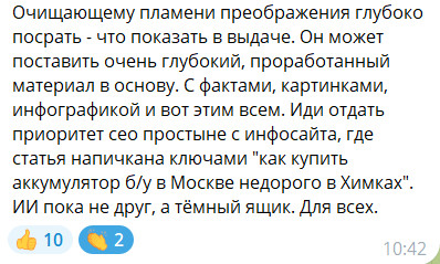 Не скажу, что я это приветствую, я против создания огромного потока «нейрохрючева», но есть и польза. Например, мы можем закрывать спрос гораздо быстрее. При появлении нового инфоповода, мы гораздо быстрее его отработатаем и выдадим нужный контент пользователям.