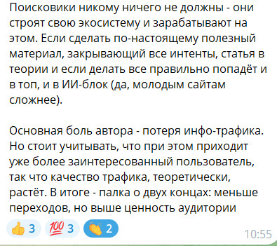 Второй нюанс. Трафика из саммари, конечно, становится меньше. Но, как говорил Шариков, «у самих револьверы найдутся»: поиск сейчас оборудован ИИ, но и создатели контента им тоже оборудованы. Производство контента ускорилось.
