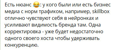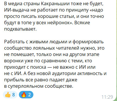 Задолго до появления нейросетей мы обсуждали на одном из эфиров, что медиа, да и в принципе бизнесу, не стоит зависеть от одного источника трафика. Даже в «золотые годы», когда мы росли на SEO-трафике, нельзя было допускать, чтобы он доминировал. Всегда нужна была и дистрибуция, и пиар.