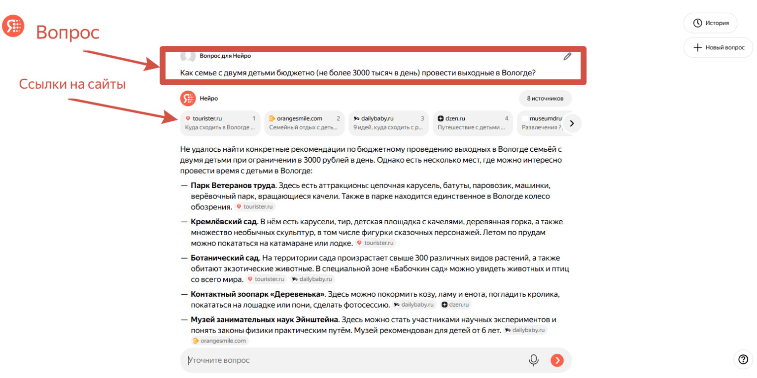 Поисковый интерфейс представляет собой симбиоз: это и диалог с нейросетью, и ссылки на сайты. Примерно как сейчас выглядит Perplexity — диалоговый чат, где можно переходить по ссылкам, продолжать обсуждение или уточнять вопрос.