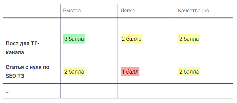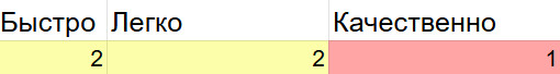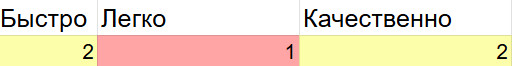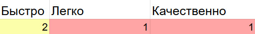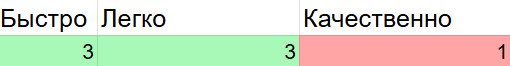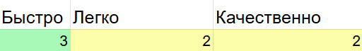 1 балл 2 балла 3 балла Быстро требуется много итераций что-то среднее готово после одной итерации Легко нужна большая вовлечённость: много правок/уточнений что-то среднее почти без моей вовлечённости Качественно приходится проверять каждый момент и переделывать что-то среднее не требует тщательной проверки