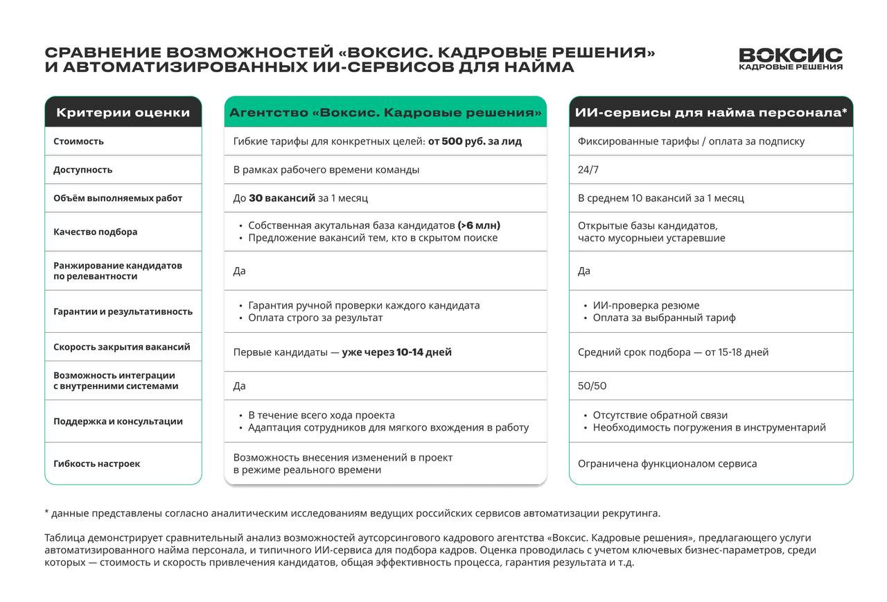 Если нужно быстро масштабировать подбор или найти редких специалистов, возможностей сервиса может быть недостаточно. Это не делает такие решения плохими. Просто важно понимать, где заканчивается их зона эффективности. В проектах, которые мы ведем в «Воксис. Кадровые решения» регулярно сталкиваемся с этой границей: сервисы отлично ускоряют первичный поиск, но дальше требуется гибкая работа рекрутера с кандидатом и задачей бизнеса.