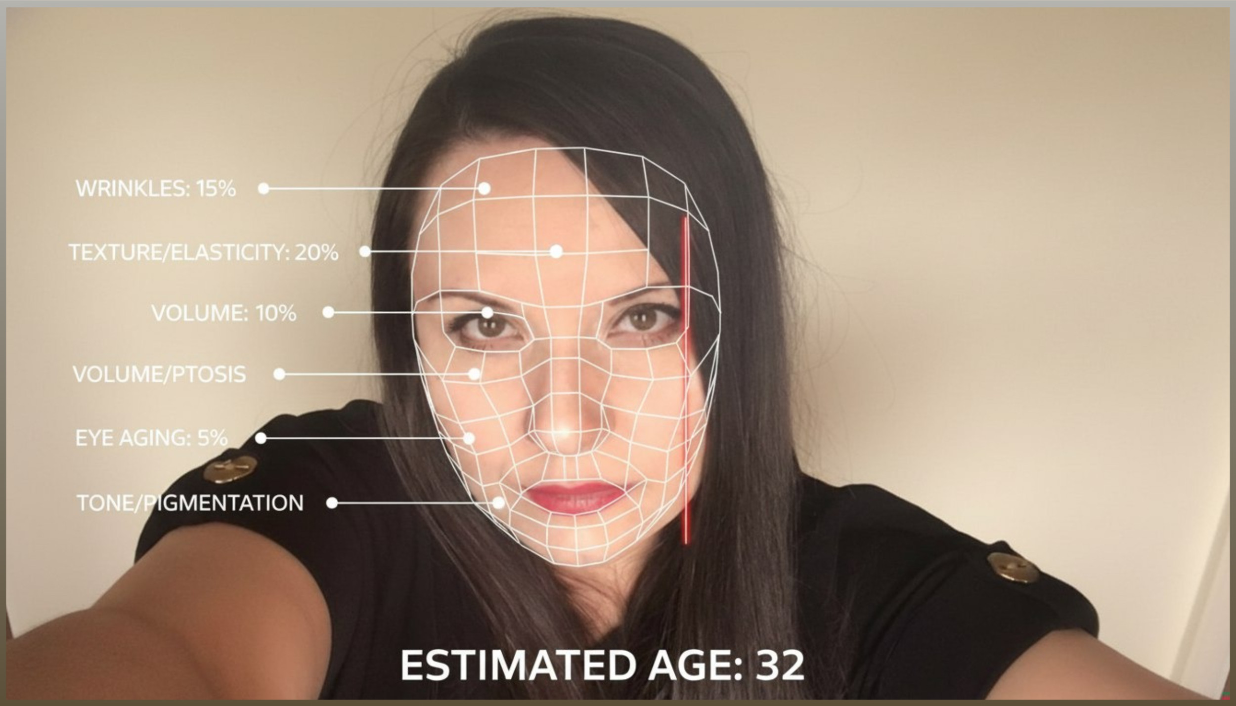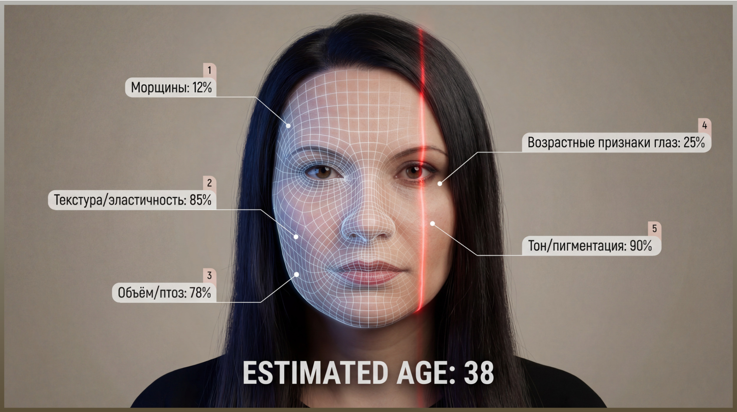 Гиперреалистичный портрет-инфографика по (вашему фото). Сохранить лицо, черты, прическу, одежду и естественный тон кожи; нейтральный студийный фон. Наложить лёгкую полупрозрачную сетку анализа лица, как 3D-скан: тонкие мягкие белые линии по контурам, слегка светящиеся. Добавить одну вертикальную красную лазерную линию сбоку лица, как футуристический скан. Инфографика оценивает 5 факторов старения с процентами: 1) морщины, 2) текстура/эластичность, 3) объем/птоз, 4) возрастные признаки глаз, 5) тон/пигментация. У каждого — маленькая метка, линия к зоне и короткий текст с реалистическим процентом (0–100%). Шрифт — чистый современный техно-sans. Внизу по центру крупный текст: «ESTIMATED AGE: (число)». Стиль футуристического AI-сканирования кожи, минимализм, премиальное световое оформление.