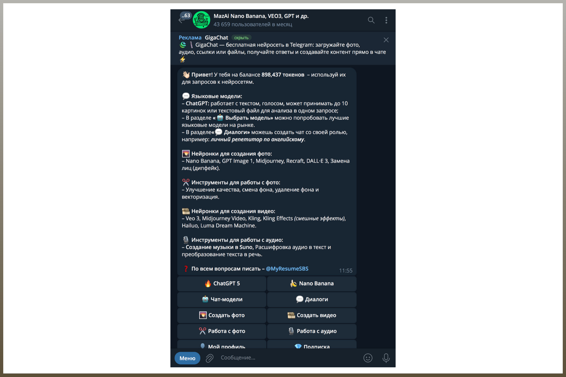 4.2 ⭐️ ChatGPT & Nano Banana — простенький сервис, который позволяет сгенерировать пробную фотографию для ознакомления с функционалом и каждый день дарит 10 запросов к GPT-4o. Минусы: нет партнерской программы, много рекламы, принудительная подписка на два телеграм-канала.