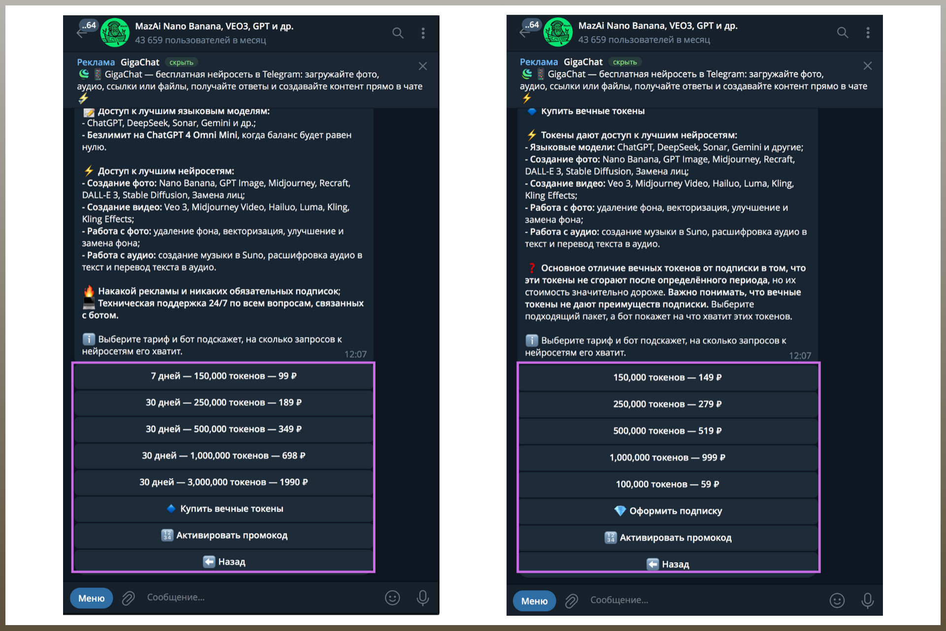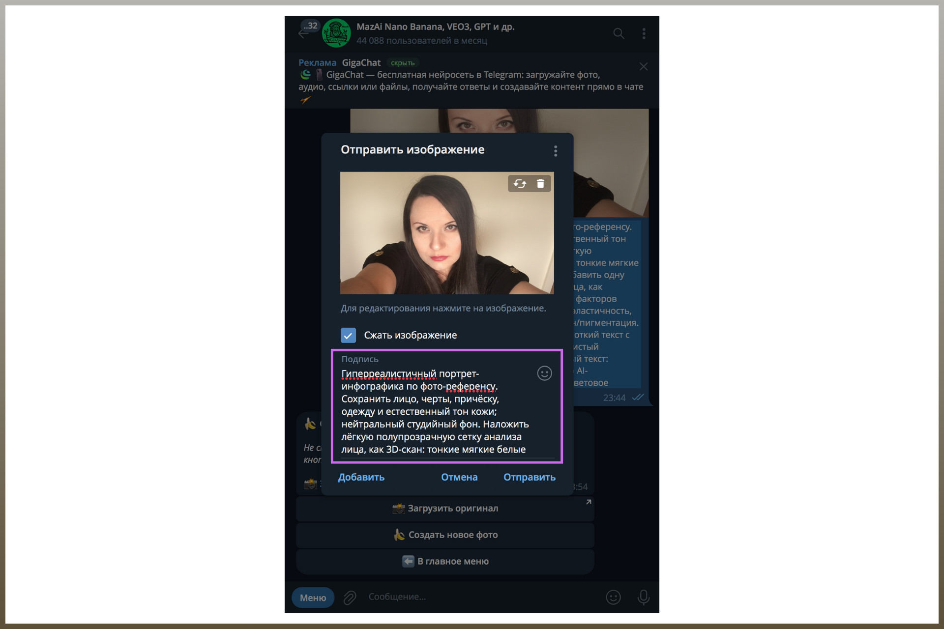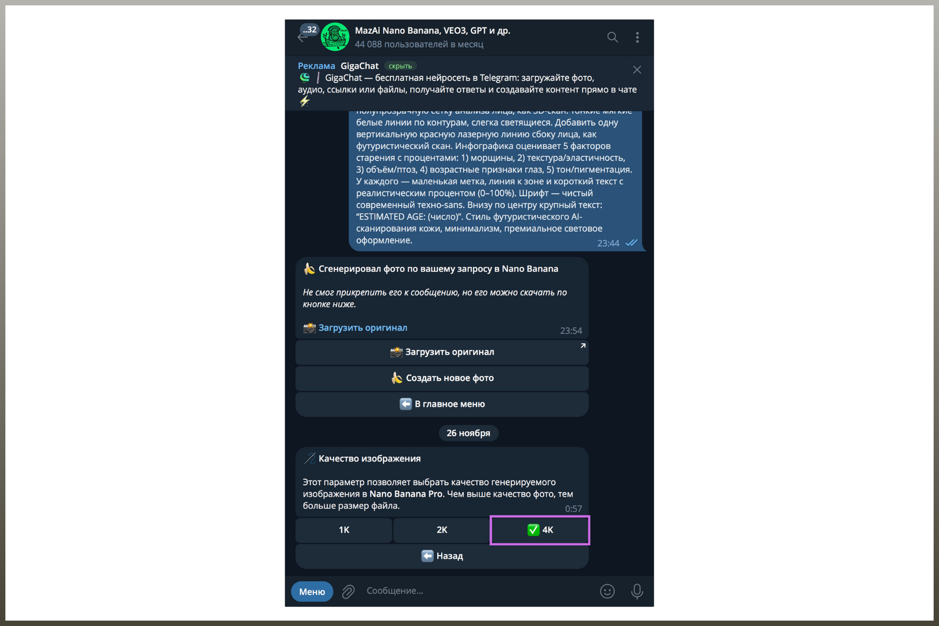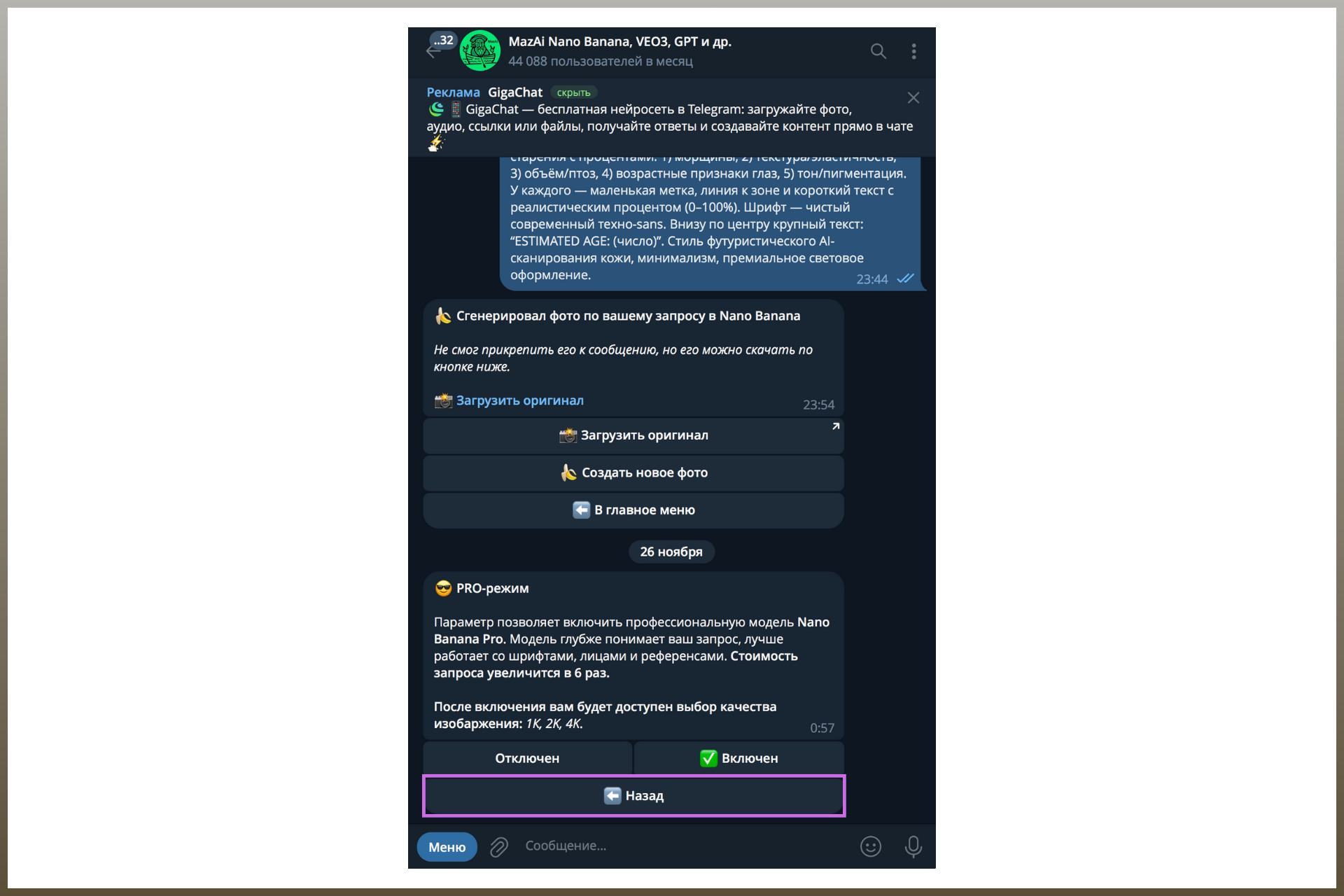 Как сэкономить: выберите тариф за 99 рублей в боте MazAi — это подписка на неделю и целых 150 000 токенов, которых хватит на 4 генерации в Nano Banana PRO (если добавить к ним бонусные 10 000 токенов): Сначала покажу, как сделать ИИ фото бесплатно, а потом — в лучшем качестве за 39 000 токенов (26 рублей, если взять подписку за 99 рублей). Откройте мессенджер Telegram — на телефоне или в браузере. А дальше — следуйте инструкции: Этап 1. Перейдите по ссылке https://t.me/Ai_dai_bot: Если пользуетесь ботом в первый раз, введите свое имя — и на балансе появятся 10 000 токенов (как рубли, только виртуальные). Один снимок, сделанный с помощью Nano Banana, стоит 5300 «монет». Этап 2. Нажмите на кнопку «Меню» и найдите запись Nano Banana — со значком банана: Этап 3. Возле «Меню» есть изображение серой скрепки — кликните по нему и выберите пункт «Фото и видео»: Этап 4. Добавьте фото, на котором четко видно ваше лицо — чем качественнее снимок, тем лучше результат: Этап 5. В подписи вставьте текст, который видели под моей фотографией выше (готовый промпт): Отправьте сообщение — и дождитесь ответа. Иногда на создание снимка уходит минута, но чаще — пара секунд. Получится примерно такой результат: Как видите, разница между этим фото и тем, что был в начале статьи, — колоссальная. Из приятного — комплимент по поводу того, что я выгляжу моложе своего реального возраста. А теперь сделаем вау-инфографику с более точным анализом кожи — в Nano Banana PRO. 1. Снова откройте диалог с Nano Banana через «Меню»: 2. Нажмите «Настройки»: 3. Выберите «PRO-режим»: 4. Поставьте галочку на «Включен»: 5. Вернитесь назад: 6. Кликните по разделу «Качество»: 7. Убедитесь, что галочка стоит возле записи «4К»: Вернитесь назад, нажмите «Создать новое фото» — и сделайте всё по инструкции, которая была выше. Дождитесь ответного сообщения «Сгенерировал фото по вашему запросу в Nano Banana» → нажмите «Загрузить оригинал». А у вас совпали реальный и биологический возраст? Удивлены? Согласны с результатом? Поделитесь впечатлениями в комментариях ❤️ Больше идей и готовых промптов >>> в телеграм-канале Banana Promt