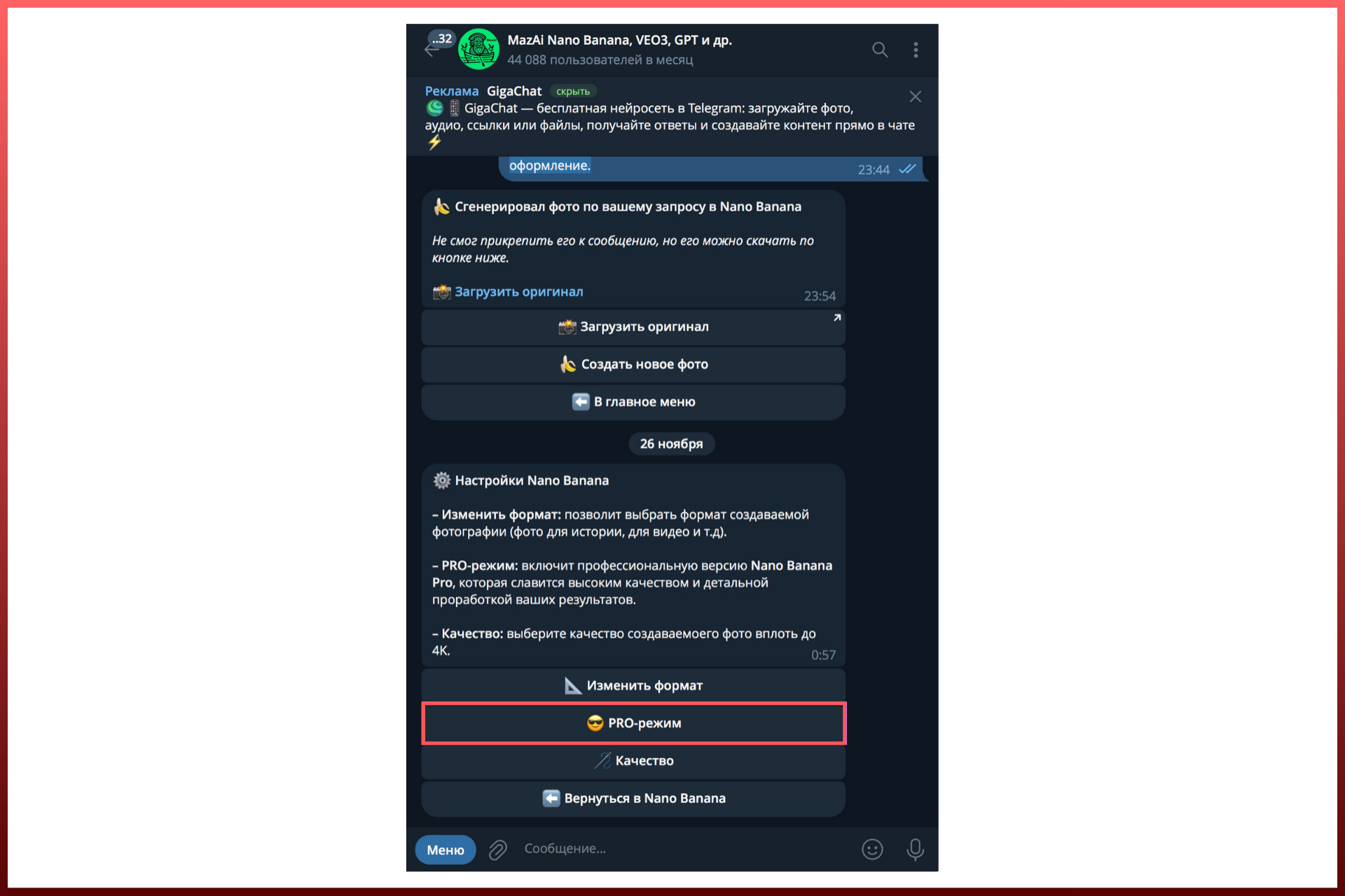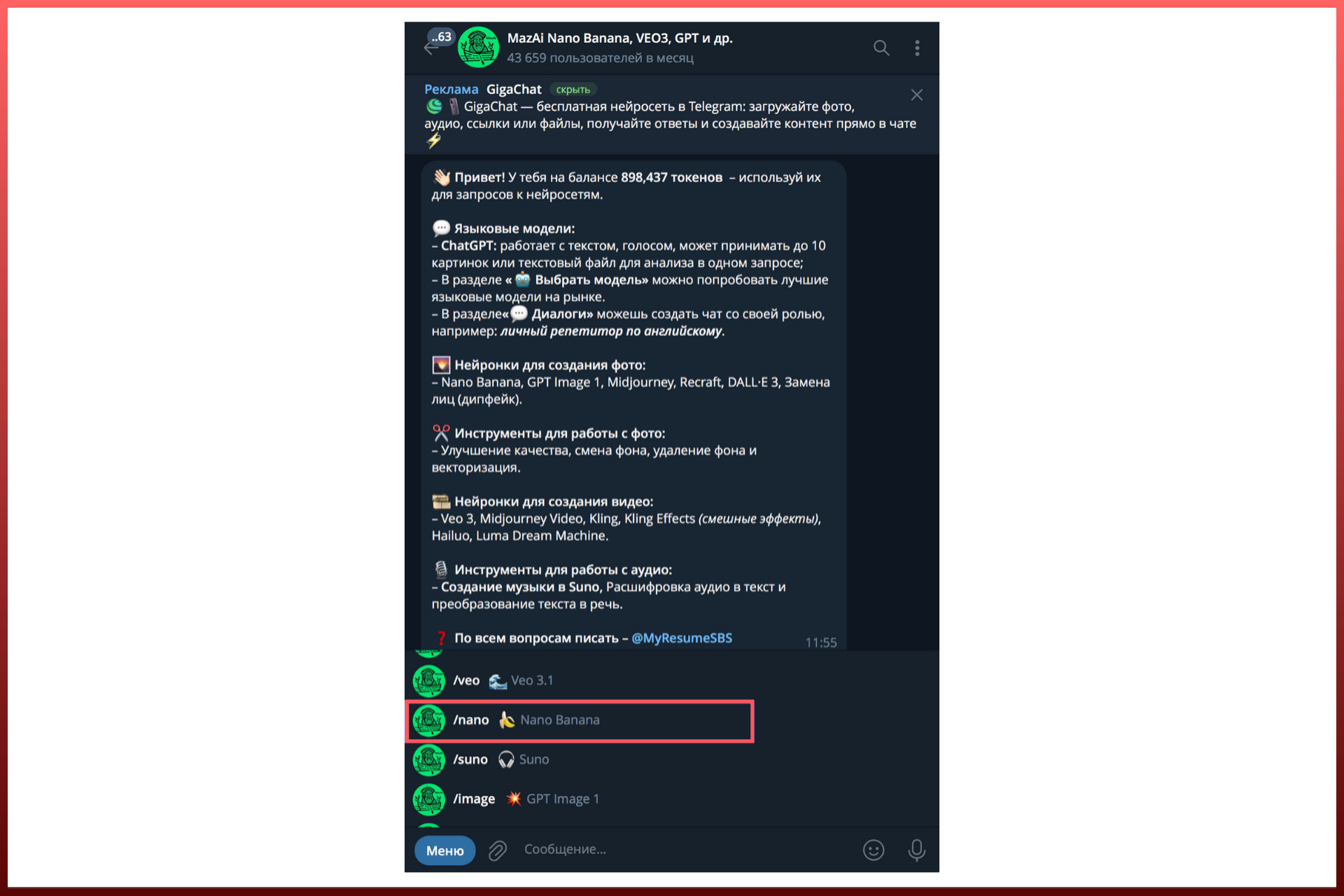 Каждый из этих ботов предлагает новым пользователям одну или несколько бесплатных генераций в Nano Banana — но не в режиме PRO.