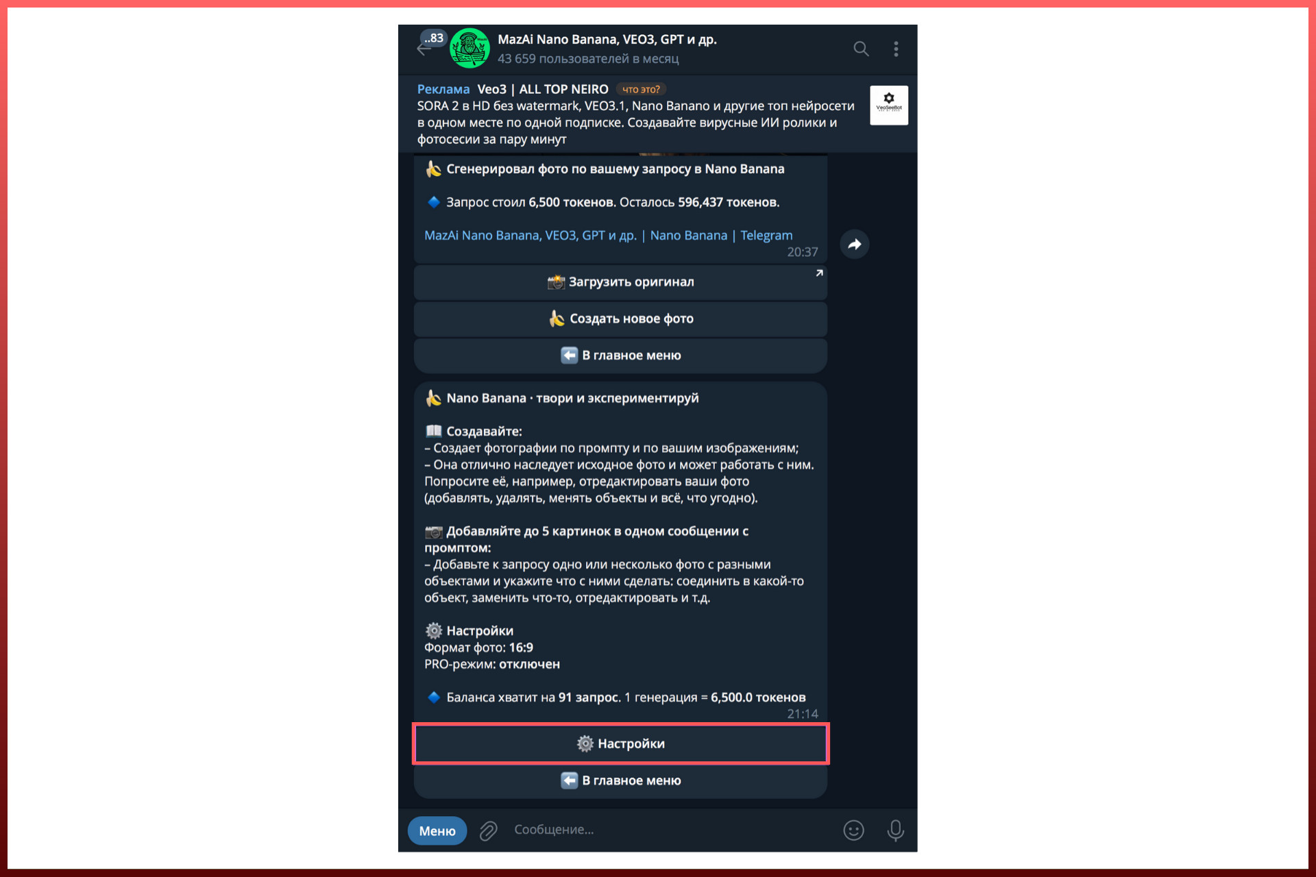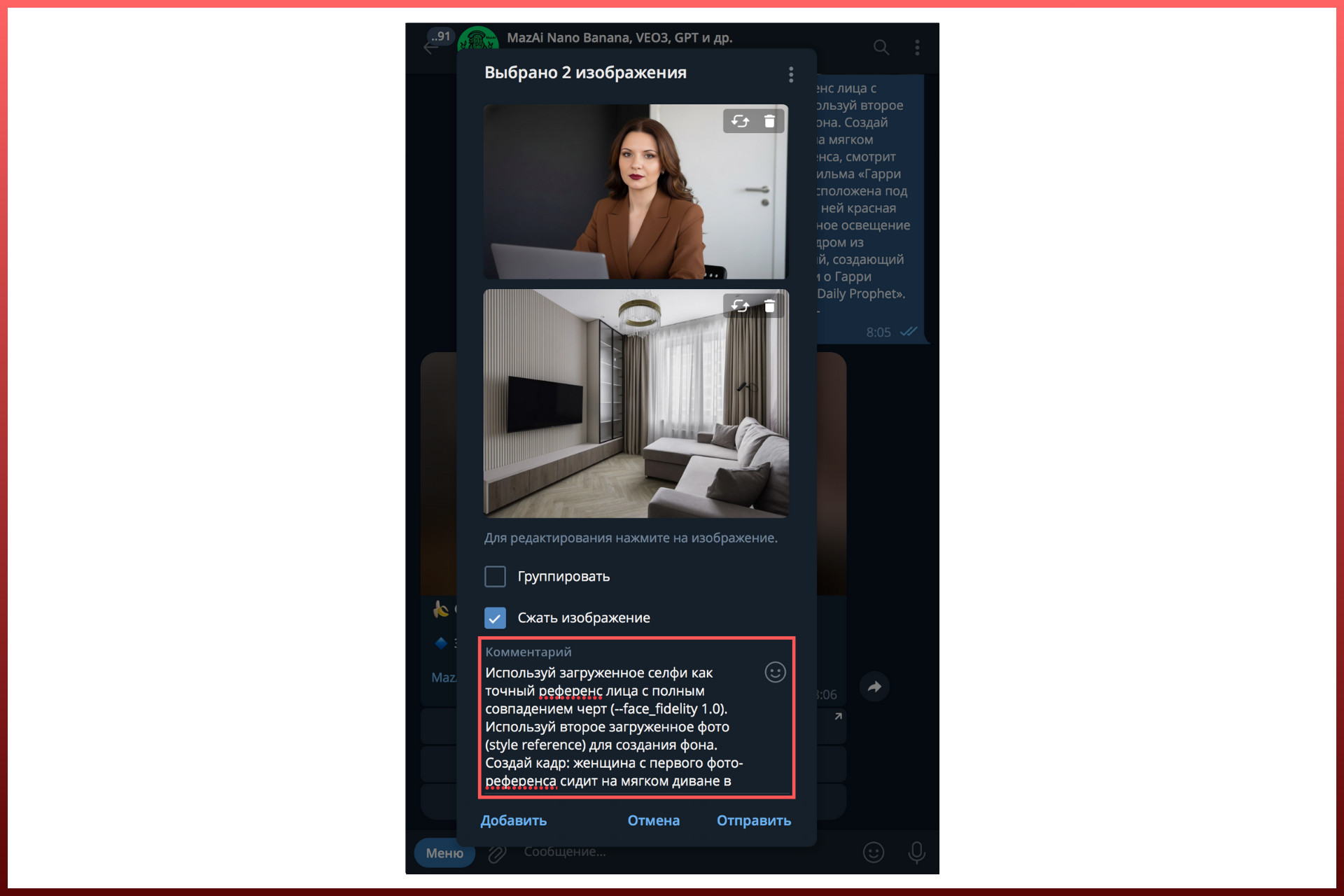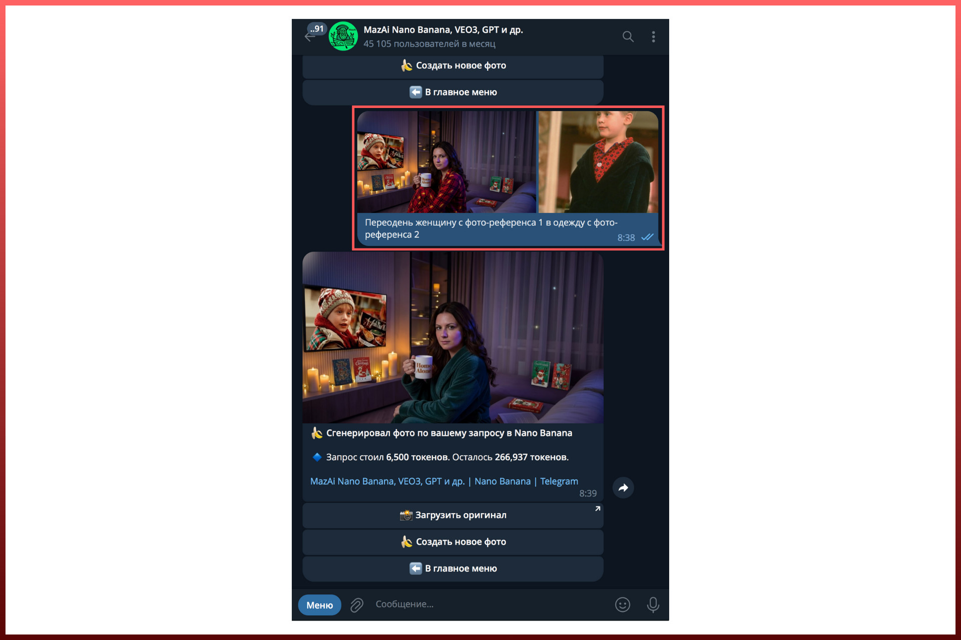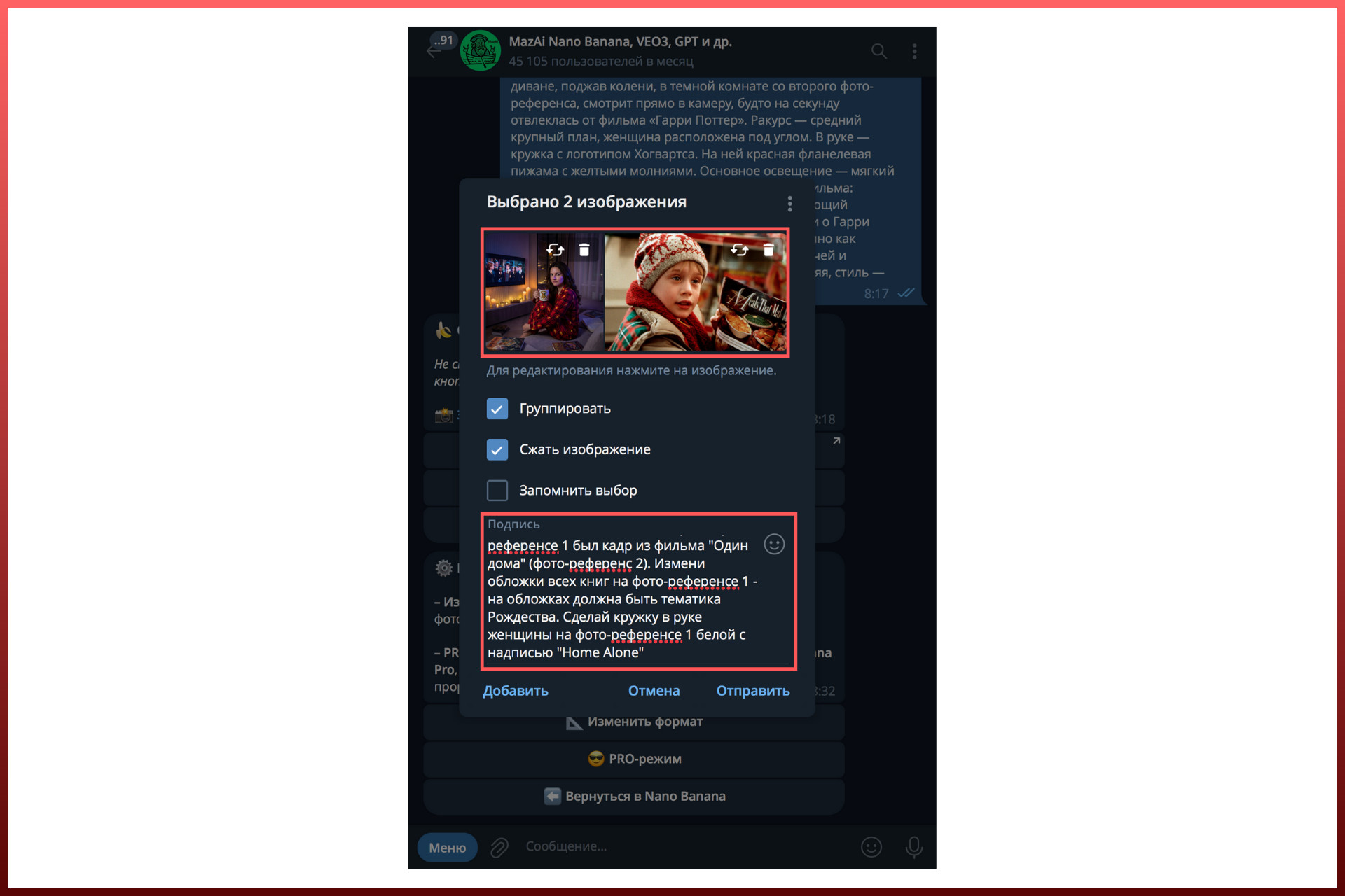 Важно: сгенерировать фото надо в течение 7 дней, иначе токены «сгорят». Если не хотите, чтобы баланс обнулялся спустя неделю, месяц или год (в зависимости от подписки), приобретайте «вечные токены». Можете прямо сейчас открыть Telegram и повторить за мной: Вариант 1. Приобрести подписку и сразу сгенерировать фото в Nano Banana PRO. Вариант 2. Сначала создать снимок в Nano Banana (не PRO) бесплатно. Вот как поэкспериментировать, не пополняя баланса: Шаг 1. Перейдите по ссылке https://t.me/Ai_dai_bot и нажмите «Старт»: Добавьте свое имя — и получите на баланс 10 000 токенов. Запрос к «обычному» Nano Banana (не PRO) стоит 5300. Шаг 2. Откройте «Меню» и найдите Nano Banana: Шаг 3. Загрузите две фотографии хорошего качества: первое — селфи, второе — снимок комнаты для фона. Для этого кликните по скрепке возле «Меню» и выберите опцию «Фото или видео»: Шаг 4. Убедитесь, что поставили галочки напротив надписей «Группировать» и «Сжать изображение» — если этого не сделать, фотографии будут отправлены в двух сообщениях, и нейросеть не поймет запроса: Шаг 5. Скопируйте этот готовый промпт и вставьте его как подпись к фотографии: Используй загруженное селфи как точный референс лица с полным совпадением черт (—face_fidelity 1.0). Используй второе загруженное фото (style reference) для создания фона. Создай кадр: женщина с первого фото-референса сидит на мягком диване, поджав колени, в темной комнате со второго фото-референса, смотрит прямо в камеру, будто на секунду отвлеклась от фильма «Гарри Поттер». Ракурс — средний крупный план, женщина расположена под углом. В руке — кружка с логотипом Хогвартса. На ней красная фланелевая пижама с желтыми молниями. Основное освещение — мягкий мерцающий свет большого экрана с кадром из фильма: синевато-фиолетовый или теплый желтый, создающий контрастные тени и киноэффект. На фоне — книги о Гарри Поттере, большие свечи, гирлянда. В комнате темно как поздним вечером, свет только от телевизора, свечей и гирлянды. Атмосфера теплая, магическая, вечерняя, стиль — профессиональное кинематографическое фото. Шаг 6. Нажмите «Отправить» — снимок будет готов примерно через 1 минуту. Nano Banana (не PRO-версия) выдаст результат, похожий на этот: А чтобы сделать более качественное фото с максимальным сохранением черт лица, проработкой деталей и умной цветокоррекцией, тот же запрос надо адресовать более совершенной версии Nano Banana PRO: Шаг 1. Запустите диалоговое окно с Nano Banana как в инструкции выше и перейдите в «Настройки»: Шаг 2. Активируйте PRO-режим: Шаг 3. Кликните «Включен»: Шаг 4. Нажмите «Назад»: Шаг 5. Откройте раздел «Качество»: Шаг 6. Выберите разрешение 1К, 2К или 4К: Шаг 7. Нажмите «Назад» и «Создать новое фото». А дальше — по инструкции, которая была выше. Через 3–5 минут появятся вы получите ссылку «Загрузить оригинал». Кликните по ней, и начнется скачивание: Если хотите что-то изменить, переписывать промпт не нужно — просто загрузите только что сгенерированное фото и напишите короткий запрос. Например, вместо «Гарри Поттера» переключимся на «Один дома»: Результат: И переоденемся в пижаму и халат Кевина :) Готово! Покажите в комментариях, у кого что получилось 📷✨