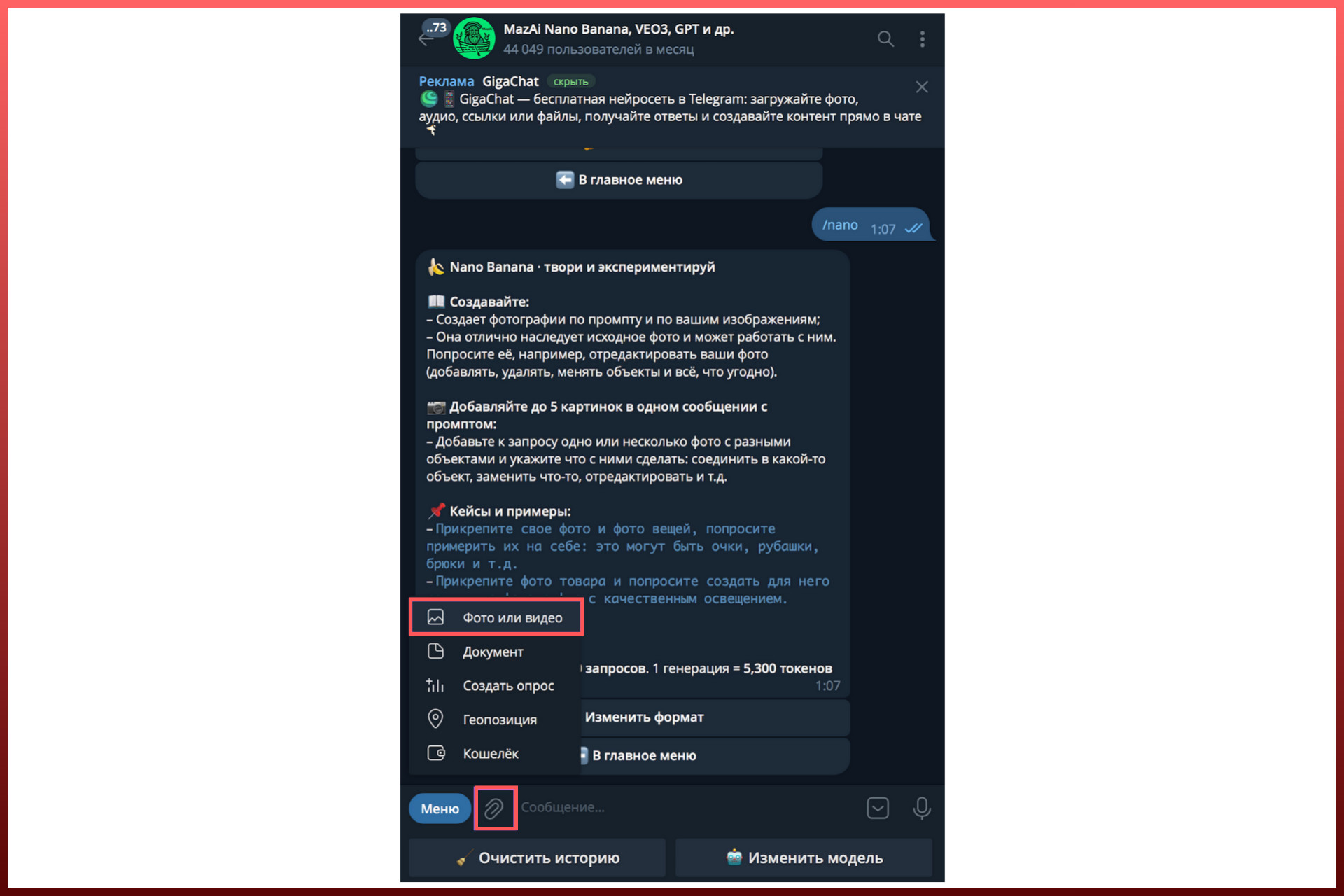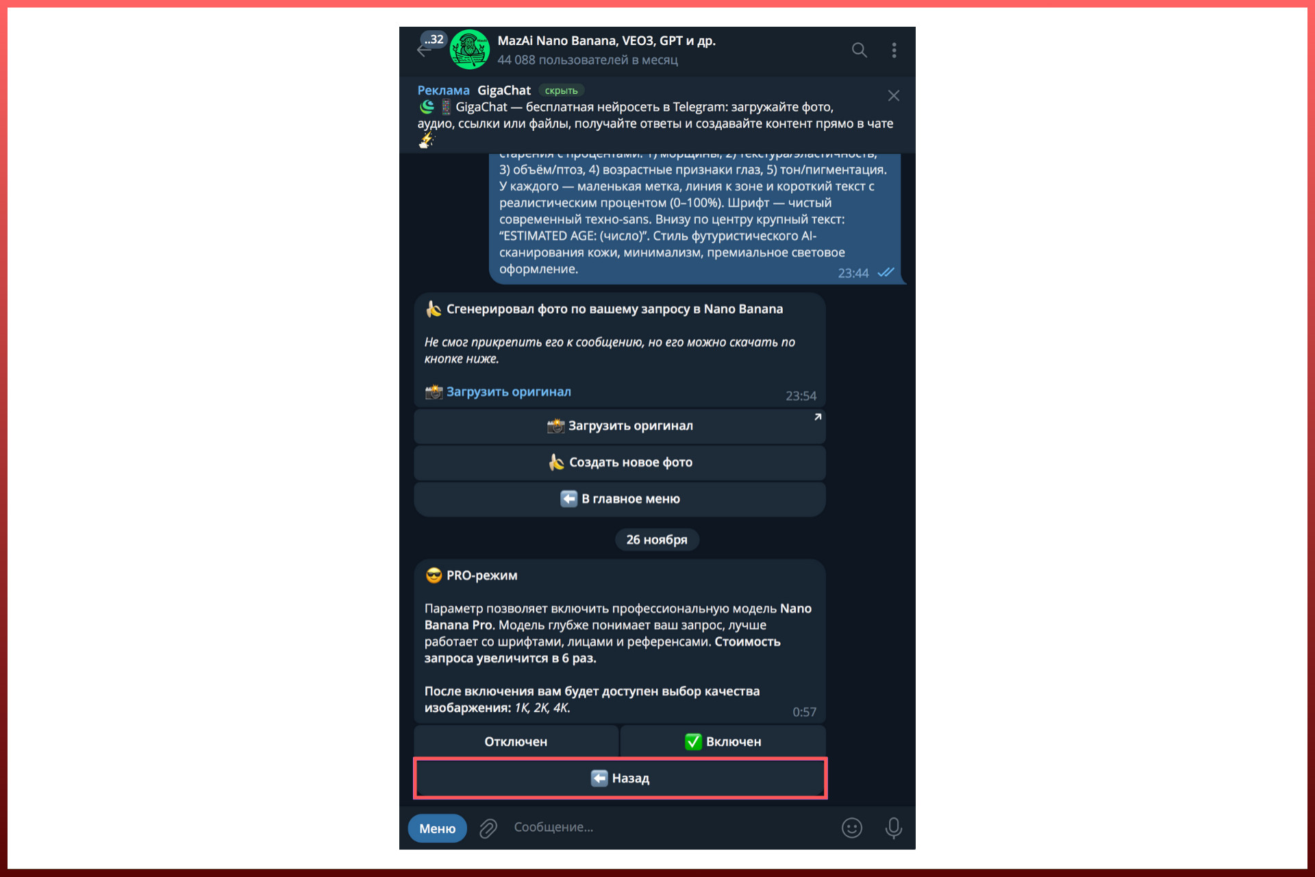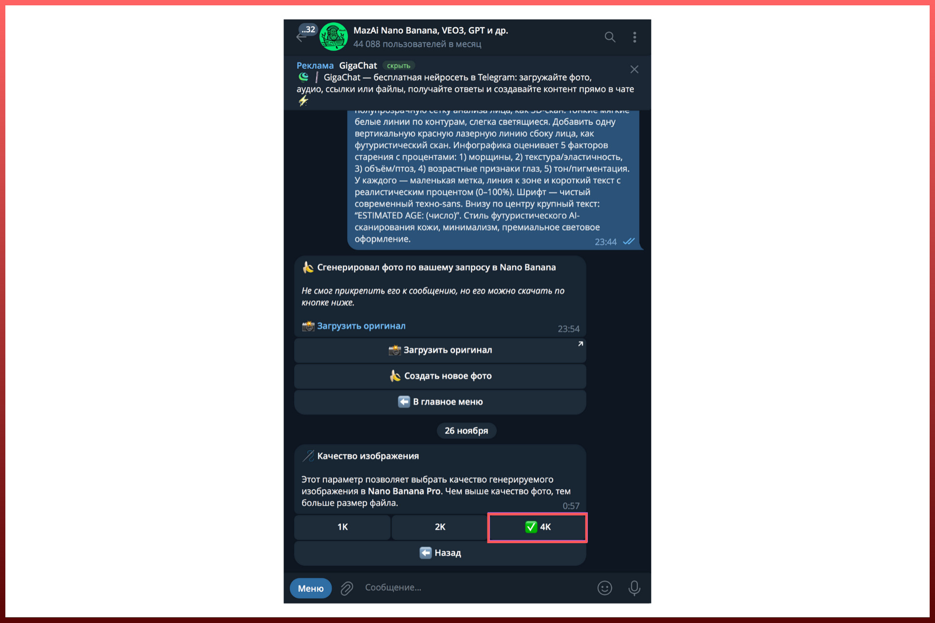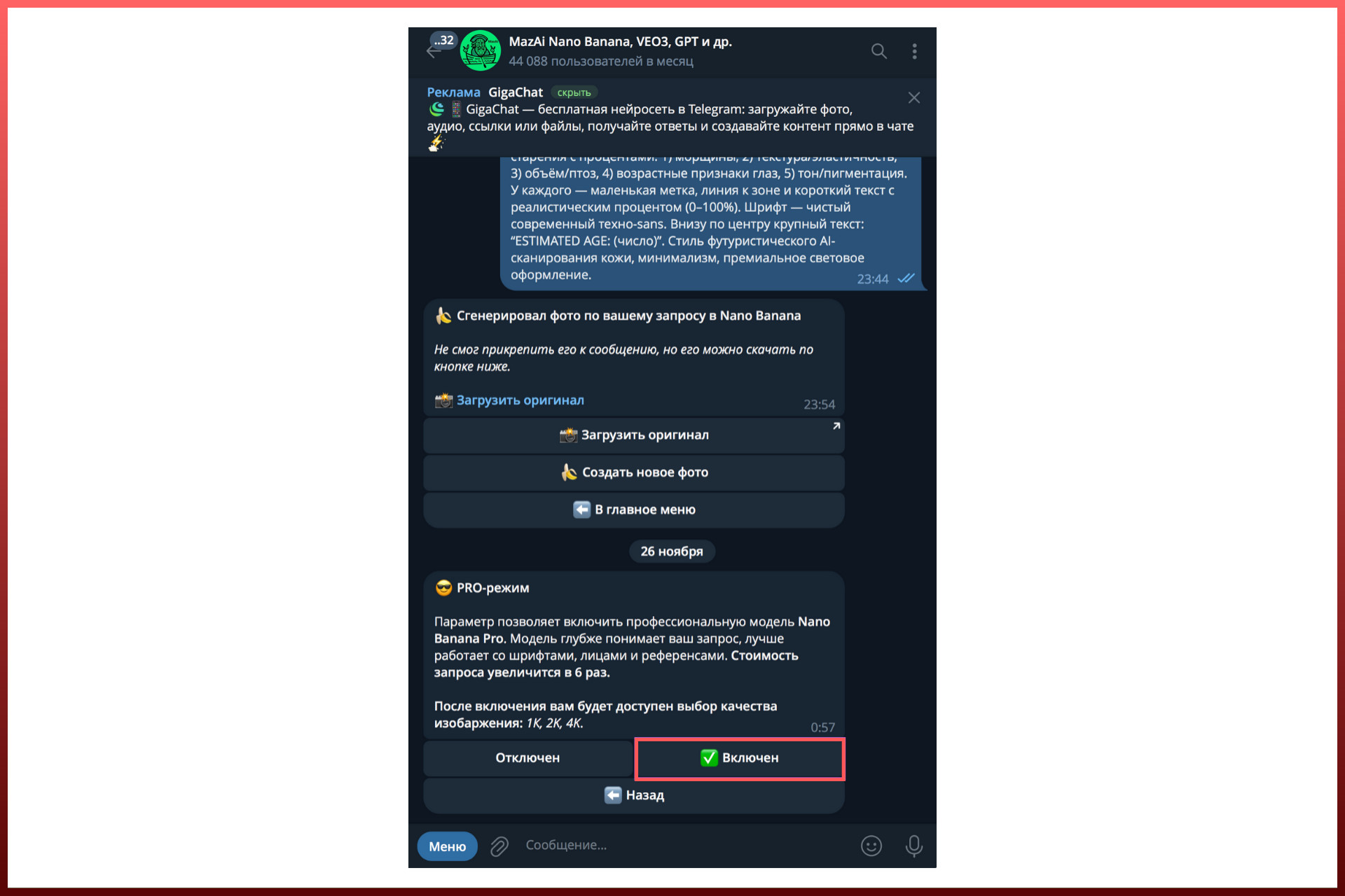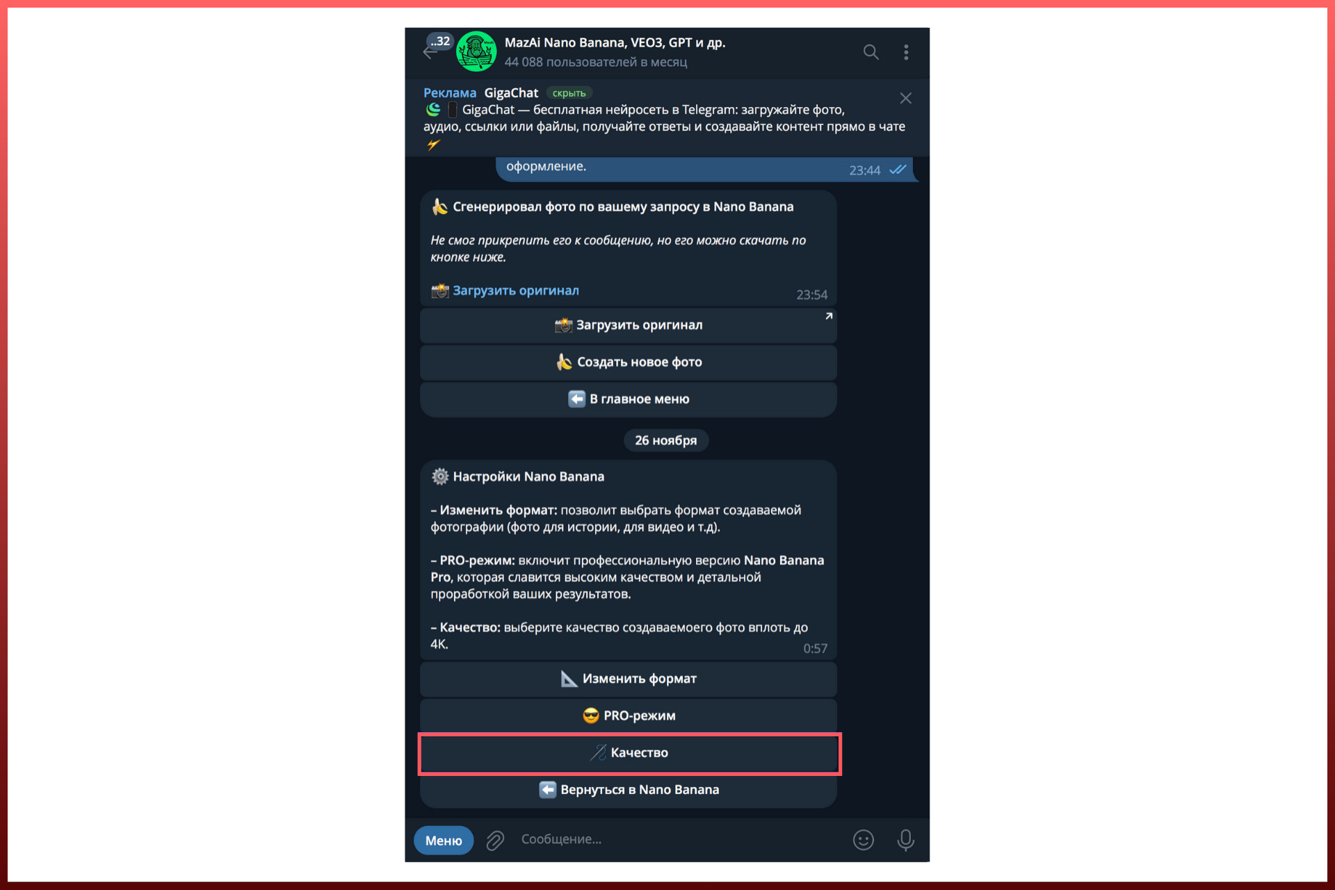 Важно: сгенерировать фото надо в течение 7 дней, иначе токены «сгорят». Если не хотите, чтобы баланс обнулялся спустя неделю, месяц или год (в зависимости от подписки), приобретайте «вечные токены». Можете прямо сейчас открыть Telegram и повторить за мной: Вариант 1. Приобрести подписку и сразу сгенерировать фото в Nano Banana PRO. Вариант 2. Сначала создать снимок в Nano Banana (не PRO) бесплатно. Вот как поэкспериментировать, не пополняя баланса: Шаг 1. Перейдите по ссылке https://t.me/Ai_dai_bot и нажмите «Старт»: Добавьте свое имя — и получите на баланс 10 000 токенов. Запрос к «обычному» Nano Banana (не PRO) стоит 5300. Шаг 2. Откройте «Меню» и найдите Nano Banana: Шаг 3. Загрузите две фотографии хорошего качества: первое — селфи, второе — снимок комнаты для фона. Для этого кликните по скрепке возле «Меню» и выберите опцию «Фото или видео»: Шаг 4. Убедитесь, что поставили галочки напротив надписей «Группировать» и «Сжать изображение» — если этого не сделать, фотографии будут отправлены в двух сообщениях, и нейросеть не поймет запроса: Шаг 5. Скопируйте этот готовый промпт и вставьте его как подпись к фотографии: Используй загруженное селфи как точный референс лица с полным совпадением черт (—face_fidelity 1.0). Используй второе загруженное фото (style reference) для создания фона. Создай кадр: женщина с первого фото-референса сидит на мягком диване, поджав колени, в темной комнате со второго фото-референса, смотрит прямо в камеру, будто на секунду отвлеклась от фильма «Гарри Поттер». Ракурс — средний крупный план, женщина расположена под углом. В руке — кружка с логотипом Хогвартса. На ней красная фланелевая пижама с желтыми молниями. Основное освещение — мягкий мерцающий свет большого экрана с кадром из фильма: синевато-фиолетовый или теплый желтый, создающий контрастные тени и киноэффект. На фоне — книги о Гарри Поттере, большие свечи, гирлянда. В комнате темно как поздним вечером, свет только от телевизора, свечей и гирлянды. Атмосфера теплая, магическая, вечерняя, стиль — профессиональное кинематографическое фото. Шаг 6. Нажмите «Отправить» — снимок будет готов примерно через 1 минуту. Nano Banana (не PRO-версия) выдаст результат, похожий на этот: А чтобы сделать более качественное фото с максимальным сохранением черт лица, проработкой деталей и умной цветокоррекцией, тот же запрос надо адресовать более совершенной версии Nano Banana PRO: Шаг 1. Запустите диалоговое окно с Nano Banana как в инструкции выше и перейдите в «Настройки»: Шаг 2. Активируйте PRO-режим: Шаг 3. Кликните «Включен»: Шаг 4. Нажмите «Назад»: Шаг 5. Откройте раздел «Качество»: Шаг 6. Выберите разрешение 1К, 2К или 4К: Шаг 7. Нажмите «Назад» и «Создать новое фото». А дальше — по инструкции, которая была выше. Через 3–5 минут появятся вы получите ссылку «Загрузить оригинал». Кликните по ней, и начнется скачивание: Если хотите что-то изменить, переписывать промпт не нужно — просто загрузите только что сгенерированное фото и напишите короткий запрос. Например, вместо «Гарри Поттера» переключимся на «Один дома»: Результат: И переоденемся в пижаму и халат Кевина :) Готово! Покажите в комментариях, у кого что получилось 📷✨