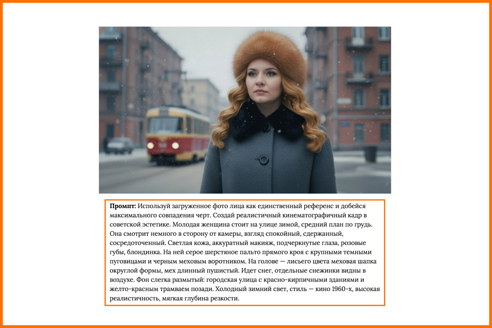 Я выбрала этот кадр из фильма — у меня, по крайней мере, он вызывает много ностальгических чувств. Если действовать по инструкции, которая будет в конце статьи, получится такая фотография (но, конечно же, с вашим лицом) — эдакая современная версия Нади. Промпт: Используй загруженное фото лица как единственный референс и добейся максимального совпадения черт. Создай реалистичный кинематографичный кадр в советской эстетике. Молодая женщина стоит на улице зимой, средний план по грудь. Она смотрит немного в сторону от камеры, взгляд спокойный, сдержанный, сосредоточенный. Светлая кожа, аккуратный макияж, подчеркнутые глаза, розовые губы, блондинка. На ней серое шерстяное пальто прямого кроя с крупными темными пуговицами и черным меховым воротником. На голове — лисьего цвета меховая шапка округлой формы, мех длинный пушистый. Идет снег, отдельные снежинки видны в воздухе. Фон слегка размытый: городская улица с красно-кирпичными зданиями и желто-красным трамваем позади. Холодный зимний свет, стиль — кино 1960-х, высокая реалистичность, мягкая глубина резкости. *** А если вы хотите в точности повторить кадр из фильма, воспользуйтесь не Nano Banana, а FaceSwap — функция замены лиц есть, например, в боте MazAi: Самый запоминающийся момент, на мой взгляд, — сцена с Ипполитом в ванне. Культовую фразу «О, тепленькая пошла» не цитировал разве что ленивый) Чтобы получить такой снимок, я использовала фотографию мужа и действовала по инструкции, которая будет в конце статьи: Промпт: Используй загруженное селфи как точную визуальную основу. Ультрареалистичная кинематографическая сцена в стилистике «Ирония судьбы»: советская маленькая ванная 70-х, белая плитка, желтые швы, хромированный душ, старый смеситель, эмалированная ванна, мыльница, висит простое полотенце и советская шторка. Герой с лицом 1:1 как на референсе стоит боком полностью одетый в ванне под душем: темное советское пальто, строгий костюм, белая рубашка, галстук, мокрая меховая шапка. Одежда промокла, с нее капает вода, струи стекают по пальто. Поза неловкая и комичная, взгляд вверх в замешательстве, лицо слегка устало-ироничное. Стоит в профиль. Свет мягкий, холодный, немного плоский, как в старых советских фильмах; цвета приглушенные, ретро-палитра, текстуры реалистичные: мокрая ткань пальто, капли воды, блеск на плитке. Камера статичная, фронтальный ракурс, кадр чуть широкоугольный. Ultra realistic 8K, film-grain, soft retro lighting, muted tones, 1970s color palette, lens 35mm, f/2.8. В мою подборку вошли только Telegram-боты: > MazAi (оценка 5.0) — крупный российский агрегатор нейросетей с понятной навигацией, демократичными ценами и поддержкой 24/7. Преимущество: Проект ведет собственный Telegram-канал с готовыми промптами для ИИ-фотосессий (ссылка), что упрощает старт новичкам. Недостаток: При этом собственного сообщества пользователей у платформы пока нет. > Nano Banana 2 (оценка 4.8) — лаконичный инструмент, работающий с одной нейросетью и ориентированный на быстрый результат. Преимущество: Разработчики часто публикуют идеи, примеры и готовые промпты для вдохновения. Недостаток: Встроенная реклама и отсутствие партнерской программы. > Syntx Ai (оценка 4.7) — мощный мультисервис, в котором собрано свыше сотни ИИ-моделей под одной оболочкой. Преимущество: Активное сообщество, доступ через браузер и регулярные апдейты. Недостаток: Существенный минус — дорогие по