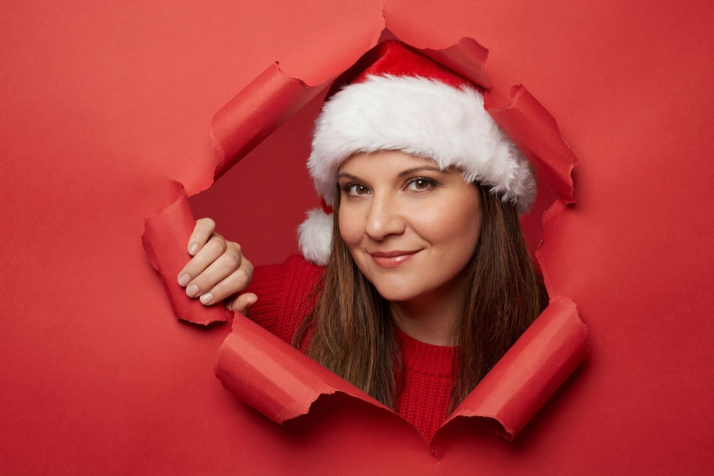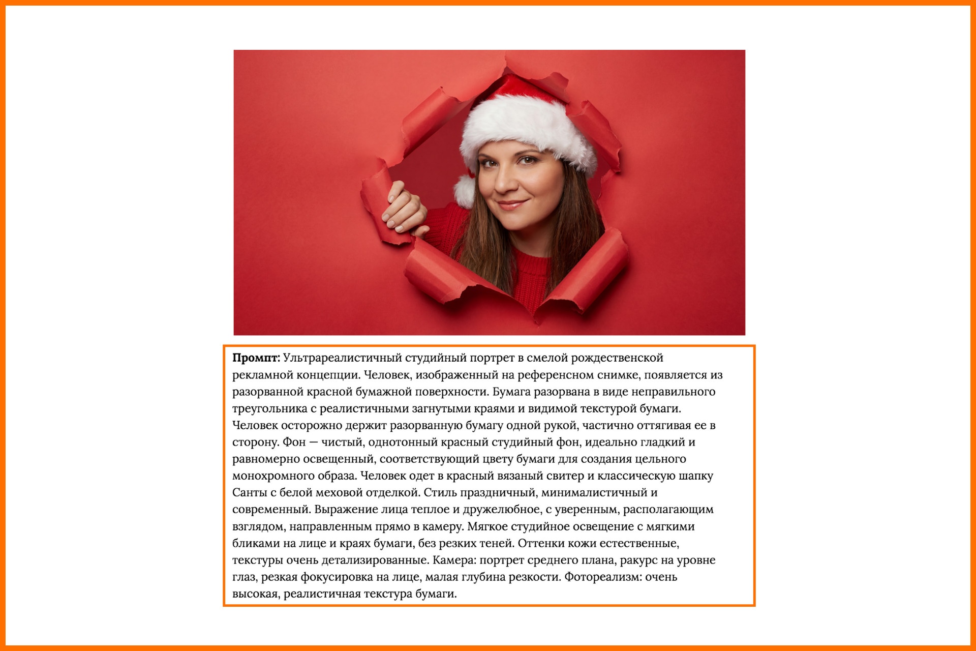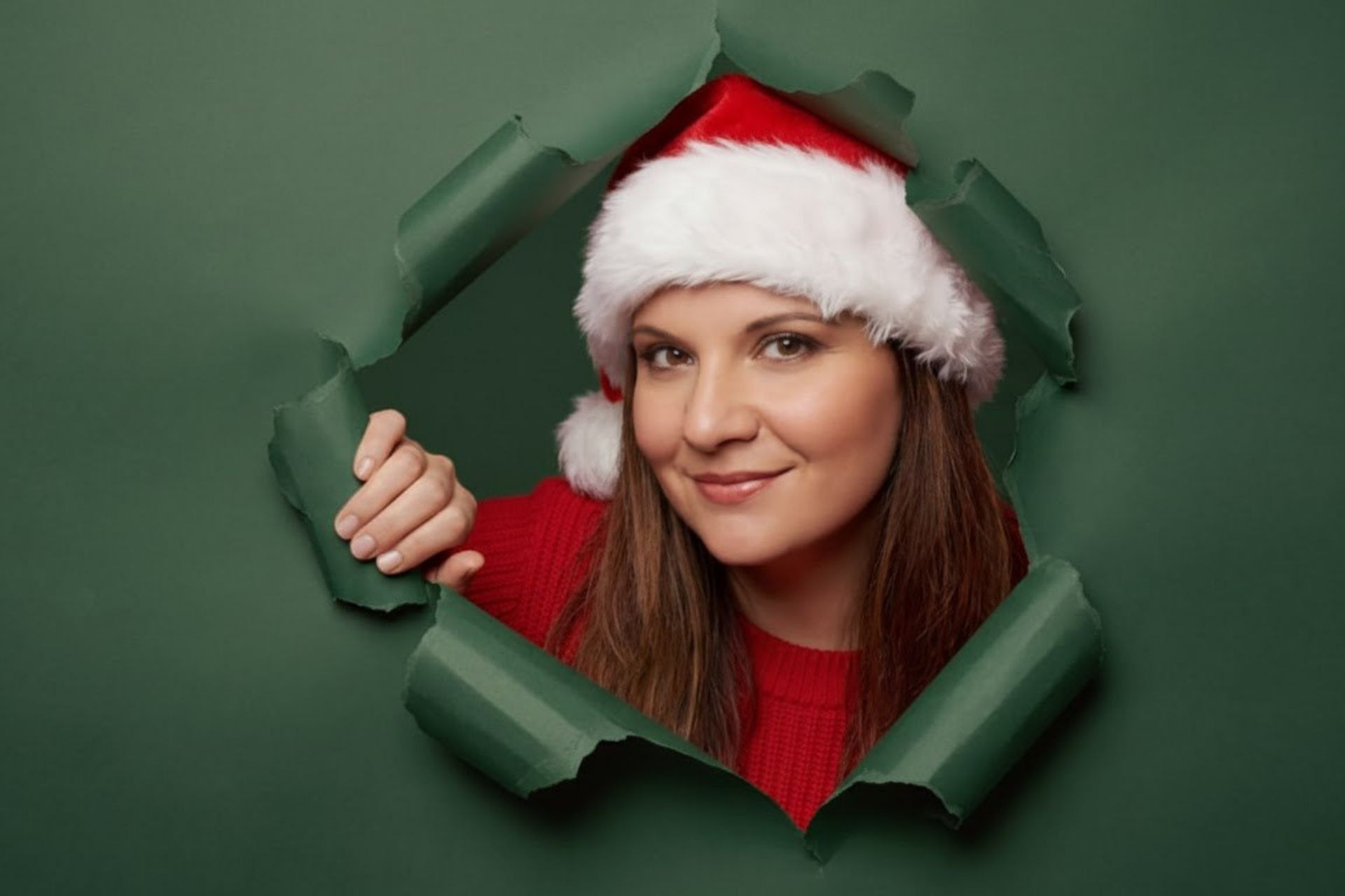 Промпт: Ультрареалистичный студийный портрет в смелой рождественской рекламной концепции. Человек, изображенный на референсном снимке, появляется из разорванной красной бумажной поверхности. Бумага разорвана в виде неправильного треугольника с реалистичными загнутыми краями и видимой текстурой бумаги. Человек осторожно держит разорванную бумагу одной рукой, частично оттягивая ее в сторону. Фон — чистый, однотонный красный студийный фон, идеально гладкий и равномерно освещенный, соответствующий цвету бумаги для создания цельного монохромного образа. Человек одет в красный вязаный свитер и классическую шапку Санты с белой меховой отделкой. Стиль праздничный, минималистичный и современный. Выражение лица теплое и дружелюбное, с уверенным, располагающим взглядом, направленным прямо в камеру. Мягкое студийное освещение с мягкими бликами на лице и краях бумаги, без резких теней. Оттенки кожи естественные, текстуры очень детализированные. Камера: портрет среднего плана, ракурс на уровне глаз, резкая фокусировка на лице, малая глубина резкости. Фотореализм: очень высокая, реалистичная текстура бумаги.