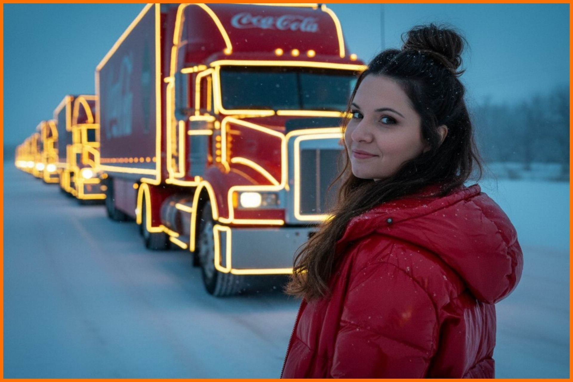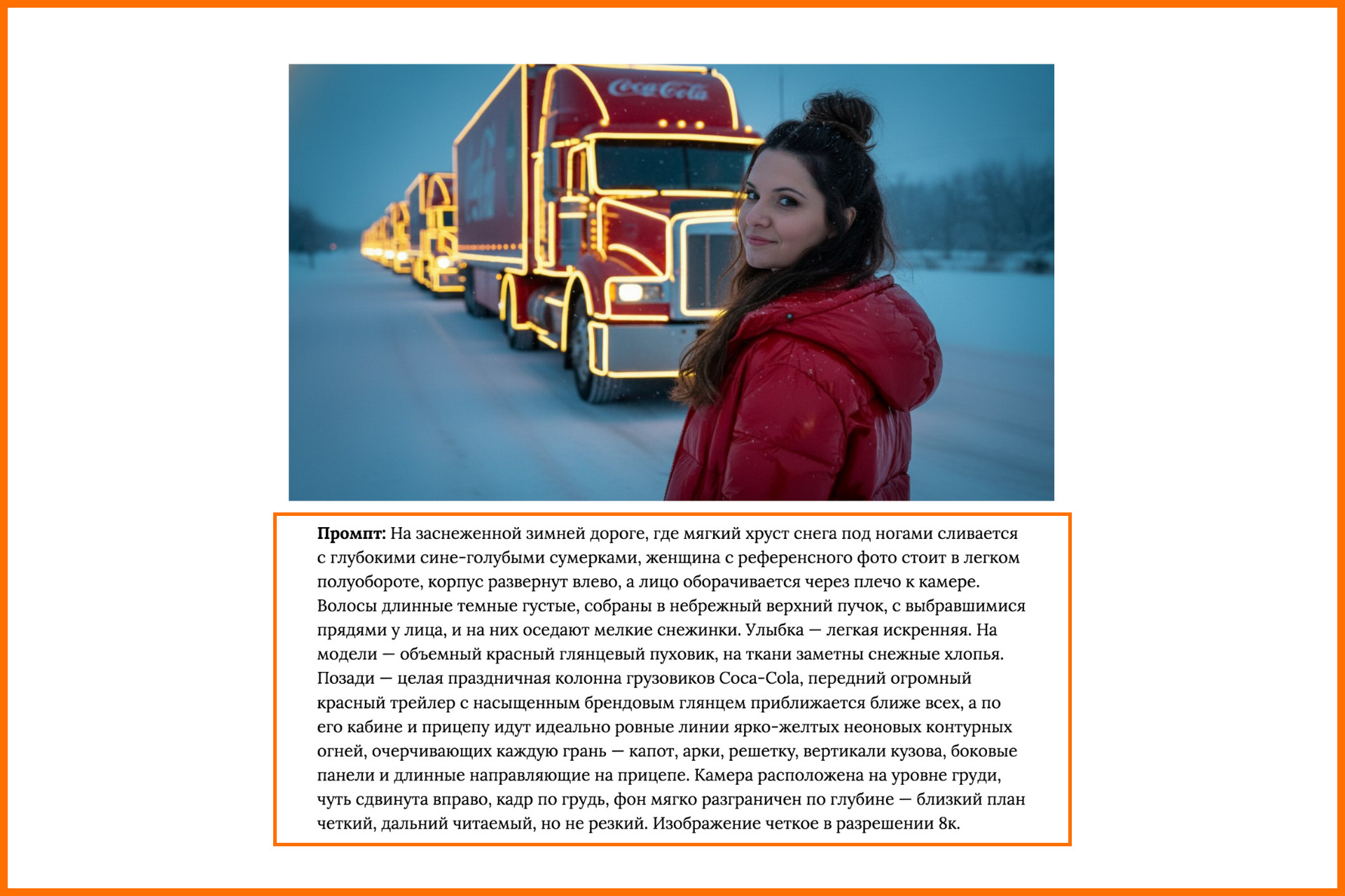 Промпт: На заснеженной зимней дороге, где мягкий хруст снега под ногами сливается с глубокими сине-голубыми сумерками, женщина с референсного фото стоит в легком полуобороте, корпус развернут влево, а лицо оборачивается через плечо к камере. Волосы длинные темные густые, собраны в небрежный верхний пучок, с выбравшимися прядями у лица, и на них оседают мелкие снежинки. Улыбка — легкая искренняя. На модели — объемный красный глянцевый пуховик, на ткани заметны снежные хлопья. Позади — целая праздничная колонна грузовиков Coca-Cola, передний огромный красный трейлер с насыщенным брендовым глянцем приближается ближе всех, а по его кабине и прицепу идут идеально ровные линии ярко-желтых неоновых контурных огней, очерчивающих каждую грань — капот, арки, решетку, вертикали кузова, боковые панели и длинные направляющие на прицепе. Камера расположена на уровне груди, чуть сдвинута вправо, кадр по грудь, фон мягко разграничен по глубине — близкий план четкий, дальний читаемый, но не резкий. Изображение четкое в разрешении 8к.