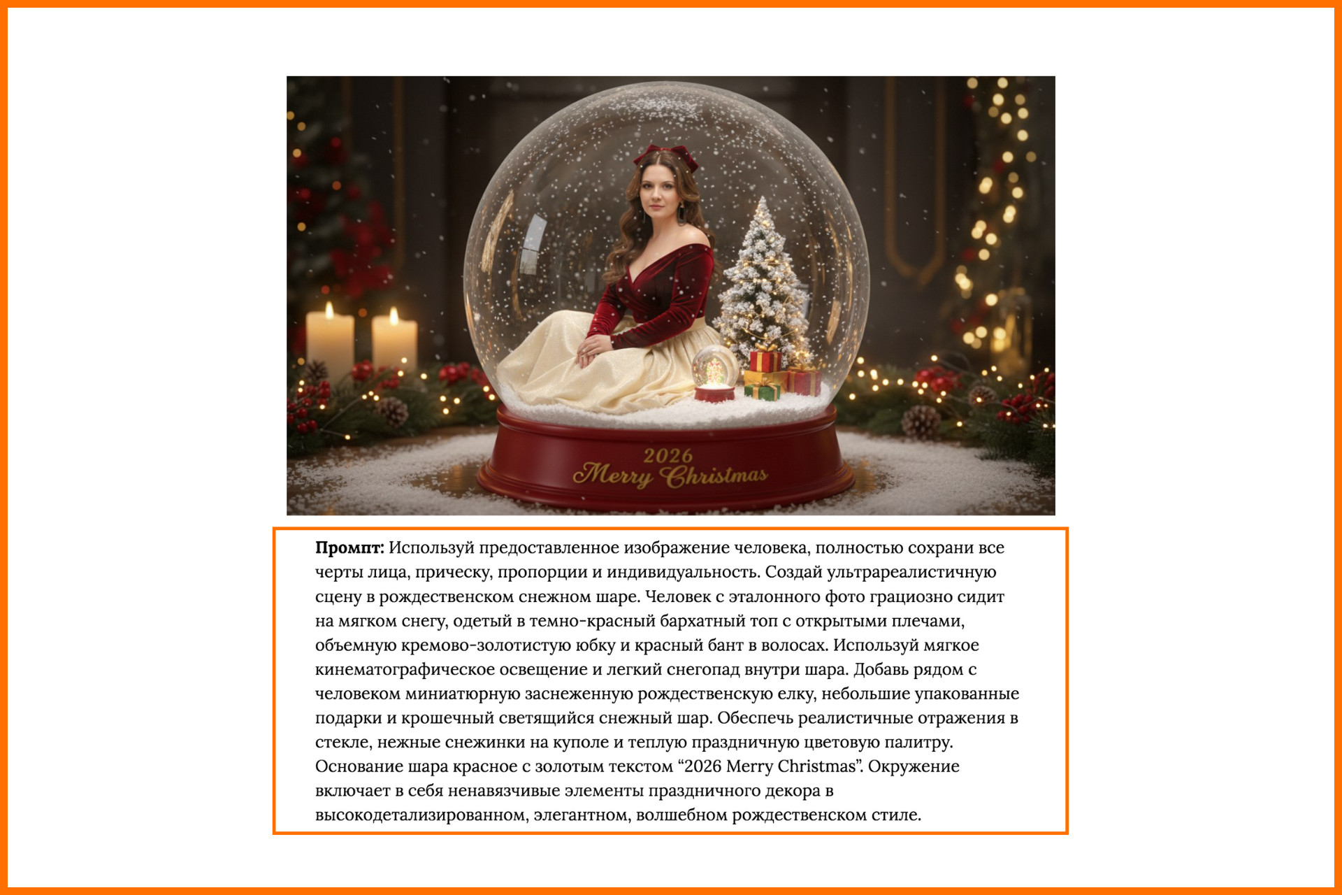 Промпт: Используй предоставленное изображение человека, полностью сохрани все черты лица, прическу, пропорции и индивидуальность. Создай ультрареалистичную сцену в рождественском снежном шаре. Человек с эталонного фото грациозно сидит на мягком снегу, одетый в темно-красный бархатный топ с открытыми плечами, объемную кремово-золотистую юбку и красный бант в волосах. Используй мягкое кинематографическое освещение и легкий снегопад внутри шара. Добавь рядом с человеком миниатюрную заснеженную рождественскую елку, небольшие упакованные подарки и крошечный светящийся снежный шар. Обеспечь реалистичные отражения в стекле, нежные снежинки на куполе и теплую праздничную цветовую палитру. Основание шара красное с золотым текстом «2026 Merry Christmas». Окружение включает в себя ненавязчивые элементы праздничного декора в высокодетализированном, элегантном, волшебном рождественском стиле. Промпт: Создай изображение женщины с фото-референса: женщина с длинными распущенными волосами позирует внутри гигантского снежного шара. На ней белый корсет, прозрачная белая мини-юбка и белые перчатки. Она стоит на коленях и держит горсть искусственного снега. Внутри шара видна маленькая рождественская елка и падающие снежинки, а у основания светящимися буквами написано «С Новым 2026 годом!» Во все сервисы из этой подборки уже добавили Nano Banana PRO — самую совершенную модель для ИИ фотосессий от Google. А еще админы каждого из перечисленных ботов предоставляют новым пользователям одну или несколько бесплатных генераций (но только в быстрой версии «Нано Банана»): 1. MazAi — один из крупнейших в России хабов нейросетей с дружелюбным интерфейсом, доступными тарифами и круглосуточной службой поддержки. Плюс: У сервиса есть собственный Telegram-канал, где регулярно публикуют готовые промпты для ИИ-фотосессий (ссылка). Минус: Пользовательскому сообществу пока не предоставили площадки для общения и обмена опытом. 2. Syntx Ai — масштабная экосистема, объединившая более 100 ИИ-моделей в едином интерфейсе. Плюс: К сильным сторонам относятся активное комьюнити, наличие веб-версии и частые функциональные обновления. Минус: Основной недостаток — высокая стоимость подписок и токенов, которые используются как внутренняя валюта сервиса. 3. Nano Banana 2 — минималистичный сервис, построенный вокруг одной ИИ-модели. Он не перегружен лишними инструментами и подойдет тем, кто ценит простоту. Плюс: Команда регулярно делится идеями для генераций и готовыми промптами. Минус: Рекламные блоки и отсутствие партнерской программы. 4. NanoBanana — НейроФотошоп — понятный и логично устроенный сервис с одной ИИ-моделью. Плюс: Внутри постоянно появляются подборки трендовых генераций, актуальные промпты и примеры работ. Минус: Для использования нейросети необходимо перейти в отдельное приложение. 5. ChatGPT & Nano Banana — практичное решение для пользователей, которые создают промпты с помощью ChatGPT. Плюс: Ежедневно сервис начисляет 10 бесплатных запросов к GPT-4o. Минус: Отсутствие реферальной системы, наличие рекламы и обязательная подписка на Telegram-канал. Вариант № 1 — для тех, кто хочет получить первую ИИ фотографию бесплатно в быстрой версии Nano Banana (она делает кадры с меньшей детализацией, но по качеству все равно превосходит большинство других нейросетей): Шаг 1. Перейдите по ссылке, откройте бота и нажмите к