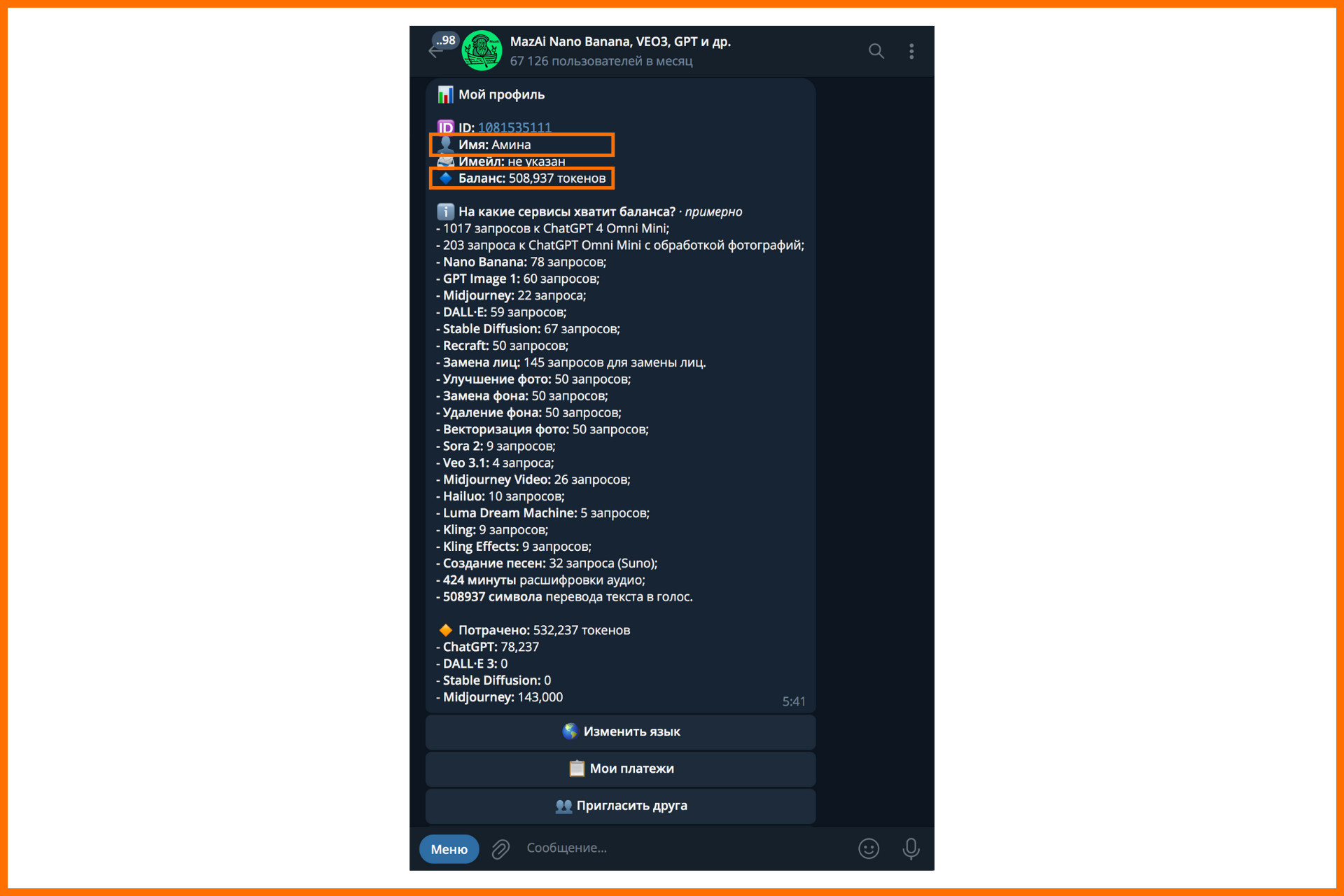 > ChatGPT & Nano Banana (4.4) — удобный бот для тех, кто комбинирует генерацию изображений с созданием промптов через ChatGPT.