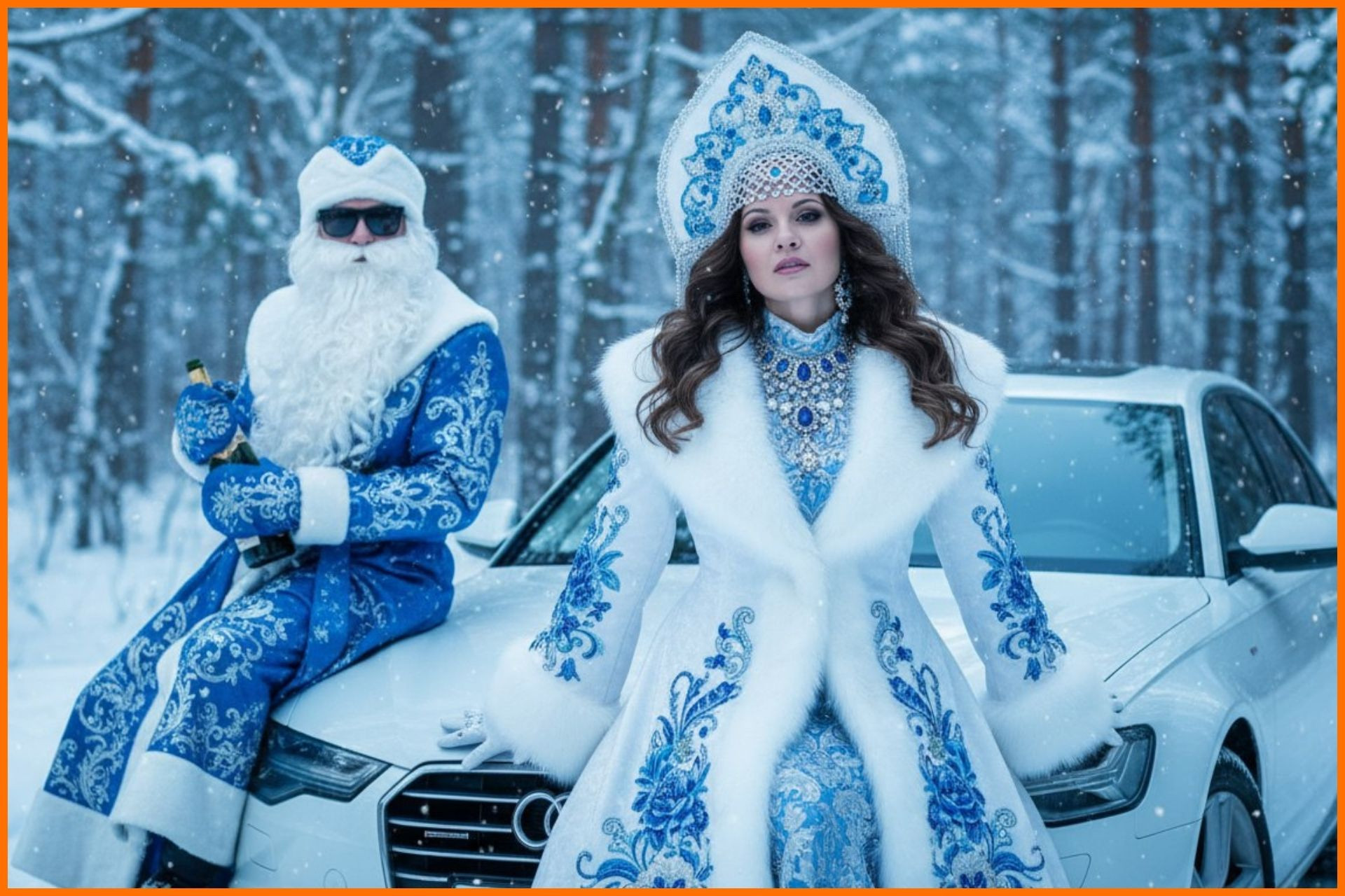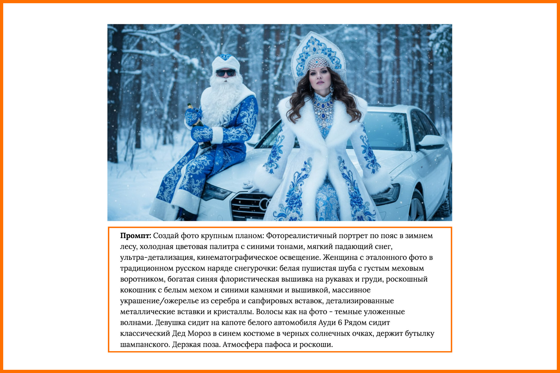 Промпт: Крупный портрет женщины с фото-референса в образе русской Снегурочки, стоящей в заснеженном лесу. Волосы заплетены в косы с жемчужными нитями, вплетенными в волосы. На голове великолепный высокий кокошник или корона, отделанный синими и бирюзовыми драгоценными камнями, жемчугом и серебром. Одета в изысканное, богато украшенное зимнее пальто или шубу королевского синего цвета, расшитое серебряными узорами и инкрустациями, отороченное роскошным белым мехом на воротнике, манжетах и подоле. На шее многослойное жемчужное ожерелье. Поза царственная: женщина стоит, корпус прямой, взгляд направлен в камеру или слегка в сторону. Фон: заснеженный зимний лес с деревьями, покрытыми снегом и инеем, на заднем плане видно стадо северных оленей, размытых эффектом боке. В воздухе легкое сияние, мерцание снежинок или магического света, создающее ощущение волшебства и холода. Освещение мягкое, кинематографическое, возможно, золотой час или рассеянный дневной свет, подчеркивающее блеск драгоценностей, жемчуга. Промпт: Создай фото крупным планом: Фотореалистичный портрет по пояс в зимнем лесу, холодная цветовая палитра с синими тонами, мягкий падающий снег, ультра-детализация, кинематографическое освещение. Женщина с эталонного фото в традиционном русском наряде снегурочки: белая пушистая шуба с густым меховым воротником, богатая синяя флористическая вышивка на рукавах и груди, роскошный кокошник с белым мехом и синими камнями и вышивкой, массивное украшение/ожерелье из серебра и сапфировых вставок, детализированные металлические вставки и кристаллы. Волосы как на фото — темные уложенные волнами. Девушка сидит на капоте белого автомобиля Ауди 6 Рядом сидит классический Дед Мороз в синем костюме в черных солнечных очках, держит бутылку шампанского. Дерзкая поза. Атмосфера пафоса и роскоши. В мою подборку вошли только Telegram-боты: > MazAi (оценка 5.0) — крупный российский агрегатор нейросетей с понятной навигацией, демократичными ценами и поддержкой 24/7. Преимущество: Проект ведет собственный Telegram-канал с готовыми промптами для ИИ-фотосессий (ссылка), что упрощает старт новичкам. Недостаток: При этом собственного сообщества пользователей у платформы пока нет. > Nano Banana 2 (оценка 4.8) — лаконичный инструмент, работающий с одной нейросетью и ориентированный на быстрый результат. Преимущество: Разработчики часто публикуют идеи, примеры и готовые промпты для вдохновения. Недостаток: Встроенная реклама и отсутствие партнерской программы. > Syntx Ai (оценка 4.7) — мощный мультисервис, в котором собрано свыше сотни ИИ-моделей под одной оболочкой. Преимущество: Активное сообщество, доступ через браузер и регулярные апдейты. Недостаток: Существенный минус — дорогие подписки и высокая стоимость токенов для генераций. > ChatGPT & Nano Banana (4.4) — удобный бот для тех, кто комбинирует генерацию изображений с созданием промптов через ChatGPT. Преимущество: Каждый день на баланс начисляется 10 бесплатных запросов к GPT-4o. Недостаток: Реклама, отсутствие реферальной программы и обязательная подписка на Telegram-канал сервиса. > NanoBanana — НейроФотошоп (4.3) — простой и интуитивный сервис, сосредоточенный на одной ИИ-модели. Преимущество: Пользователям регулярно предлагают свежие промпты, тренды и подборки удачных генераций. Недостаток: Для работы с нейросетью требуется переход 