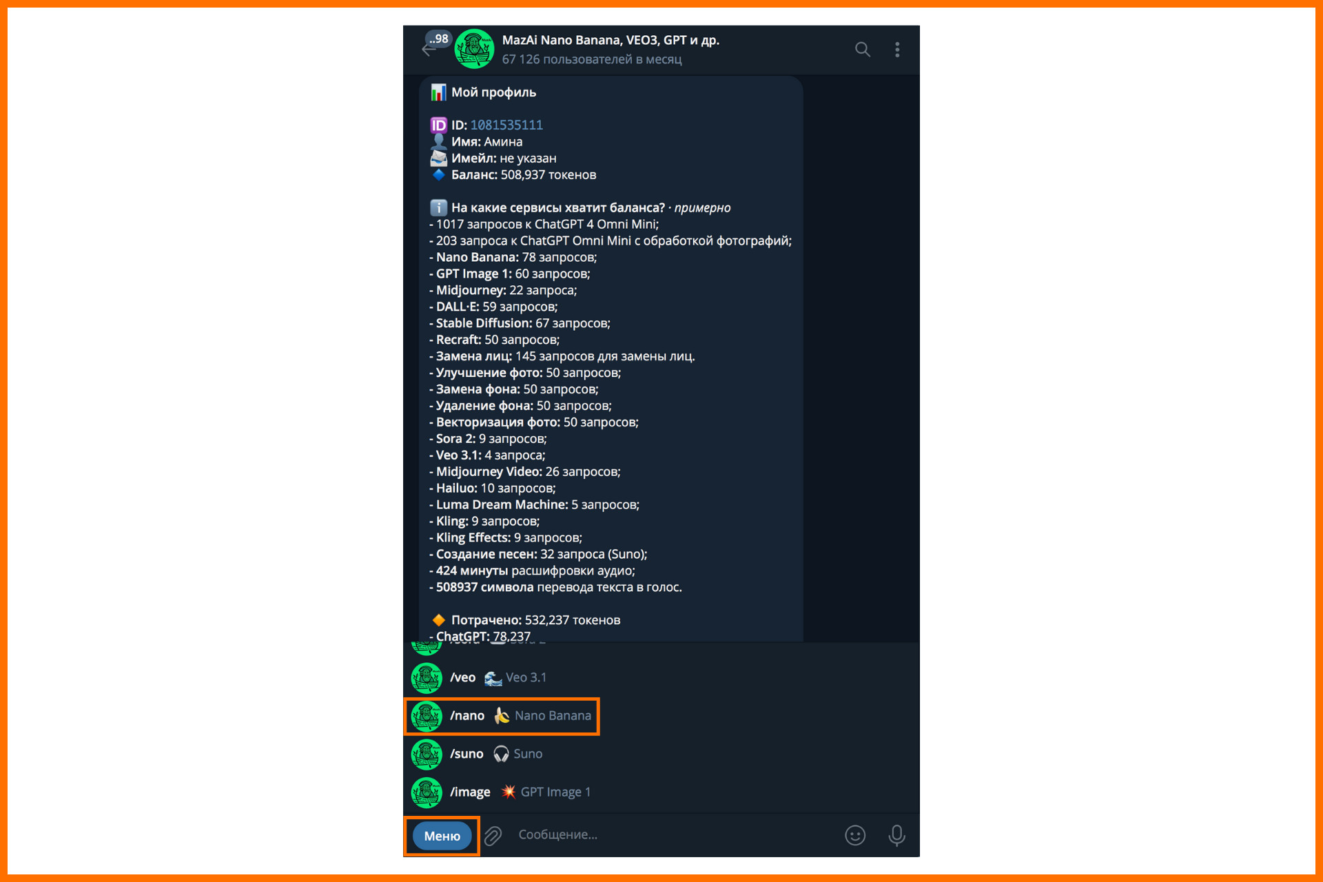 > ChatGPT & Nano Banana (4.4) — удобный бот для тех, кто комбинирует генерацию изображений с созданием промптов через ChatGPT.