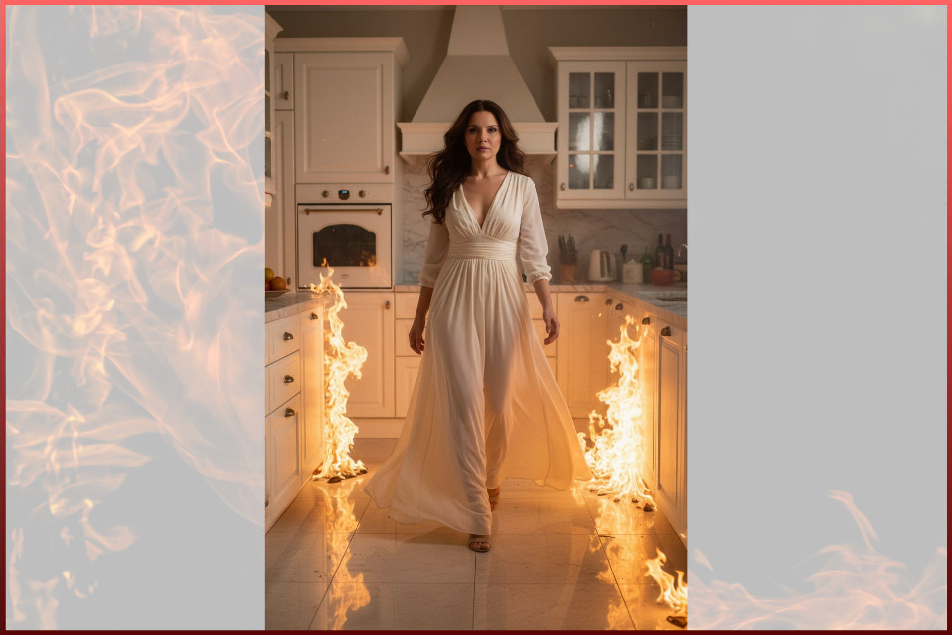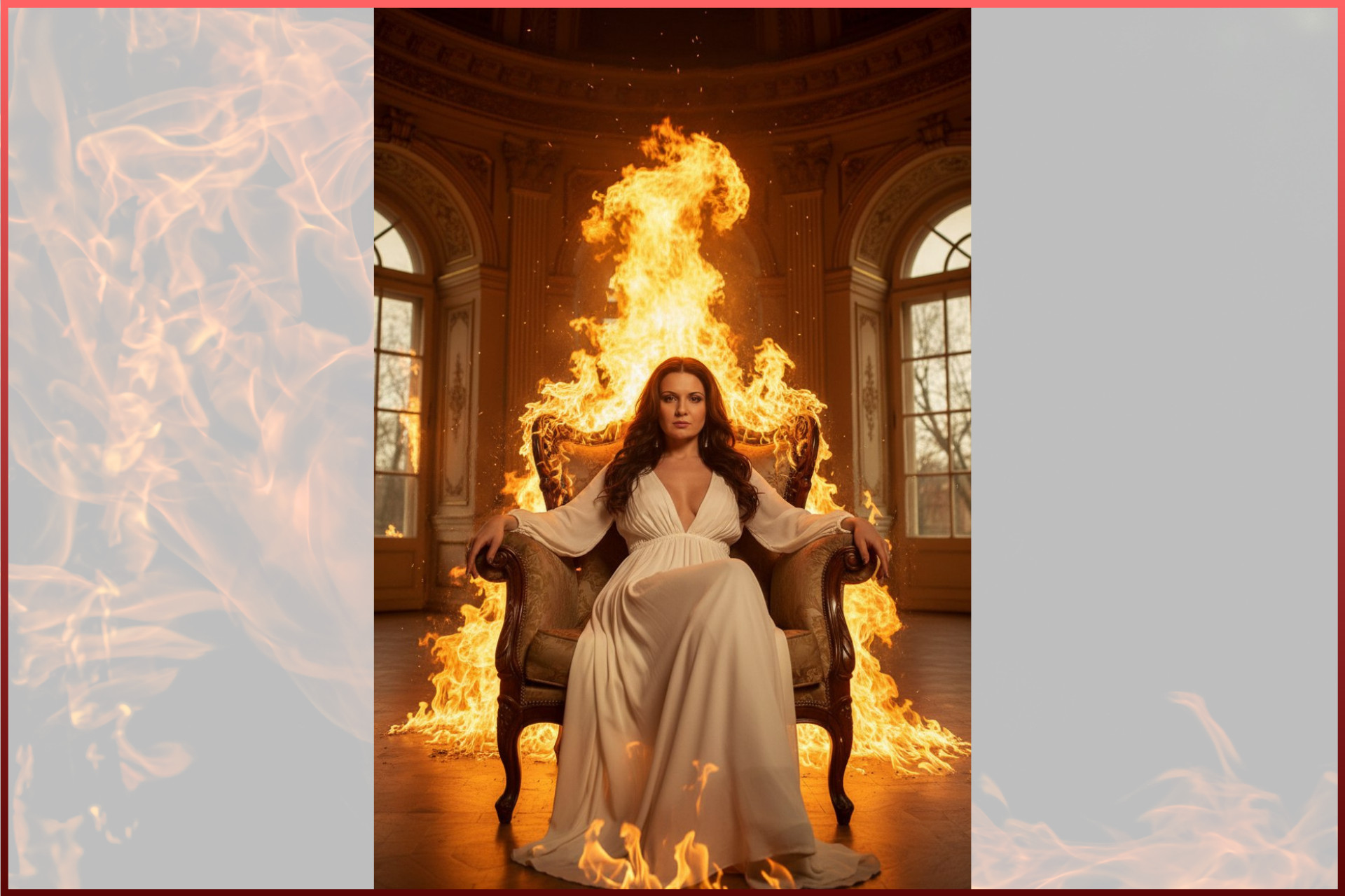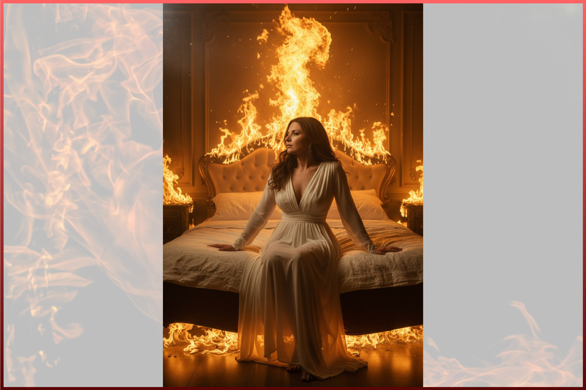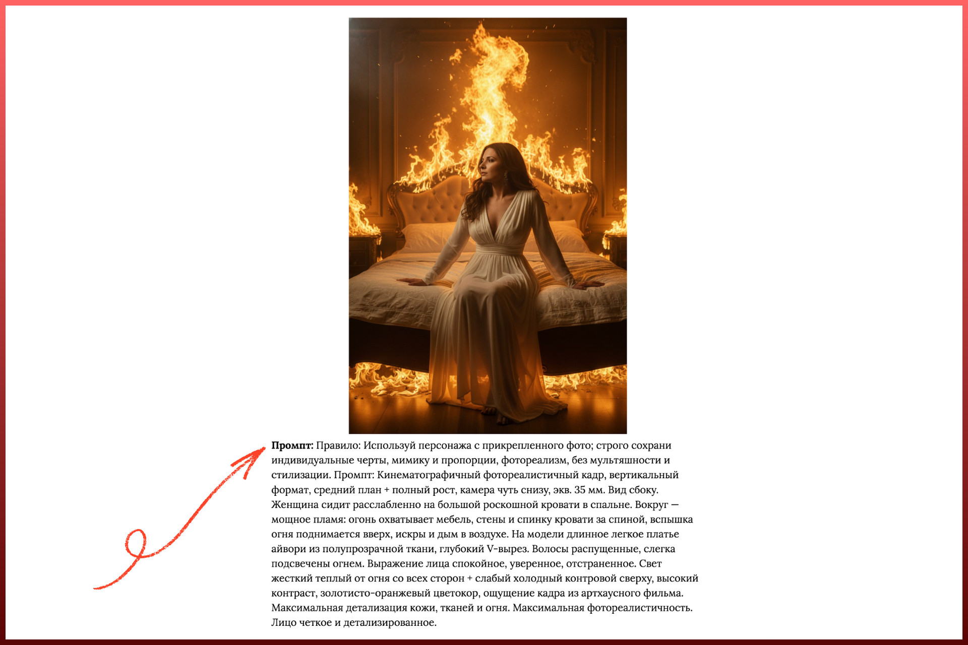Промпт женский: Правило: Используй персонажа с прикрепленного фото; строго сохрани индивидуальные черты, мимику и пропорции, фотореализм, без мультяшности и стилизации. Промпт: Кинематографичный фотореалистичный кадр, вертикальный формат, средний план + полный рост, камера чуть снизу, экв. 35 мм. Вид сбоку. Женщина сидит расслабленно на большой роскошной кровати в спальне. Вокруг — мощное пламя: огонь охватывает мебель, стены и спинку кровати за спиной, вспышка огня поднимается вверх, искры и дым в воздухе. На модели длинное легкое платье айвори из полупрозрачной ткани, глубокий V-вырез. Волосы распущенные, слегка подсвечены огнем. Выражение лица спокойное, уверенное, отстраненное. Свет жесткий теплый от огня со всех сторон + слабый холодный контровой сверху, высокий контраст, золотисто-оранжевый цветокор, ощущение кадра из артхаусного фильма. Максимальная детализация кожи, тканей и огня. Максимальная фотореалистичность. Лицо четкое и детализированное.