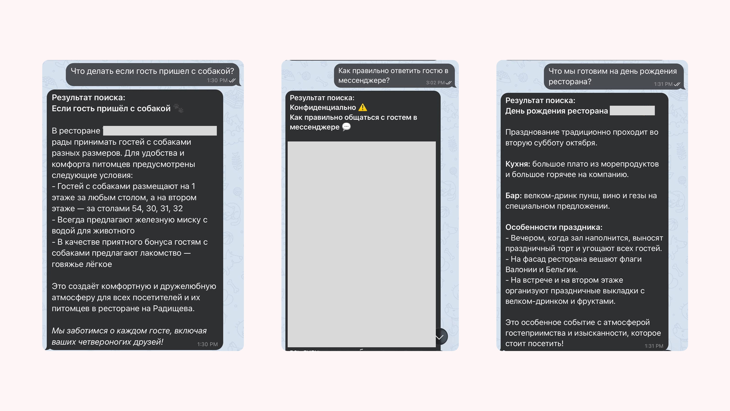И самое главное — бот понимает смысл вопроса, а не ключевые слова. Он знает, кто спрашивает, и показывает только ту информацию, которую разрешено видеть: стандарты, описания ресторанов, контактные данные коллег, корпоративные политики, справки и документы.