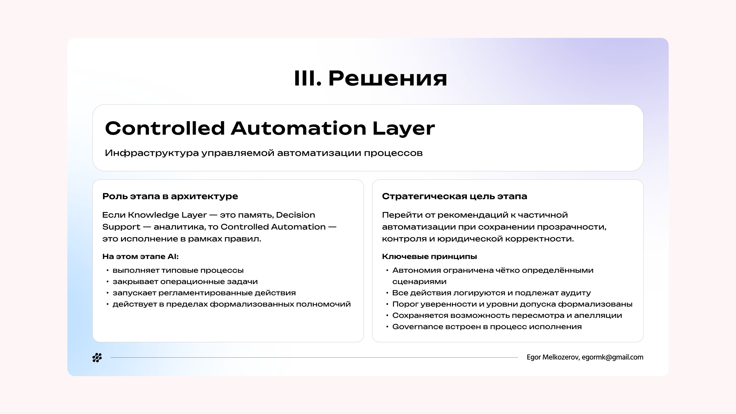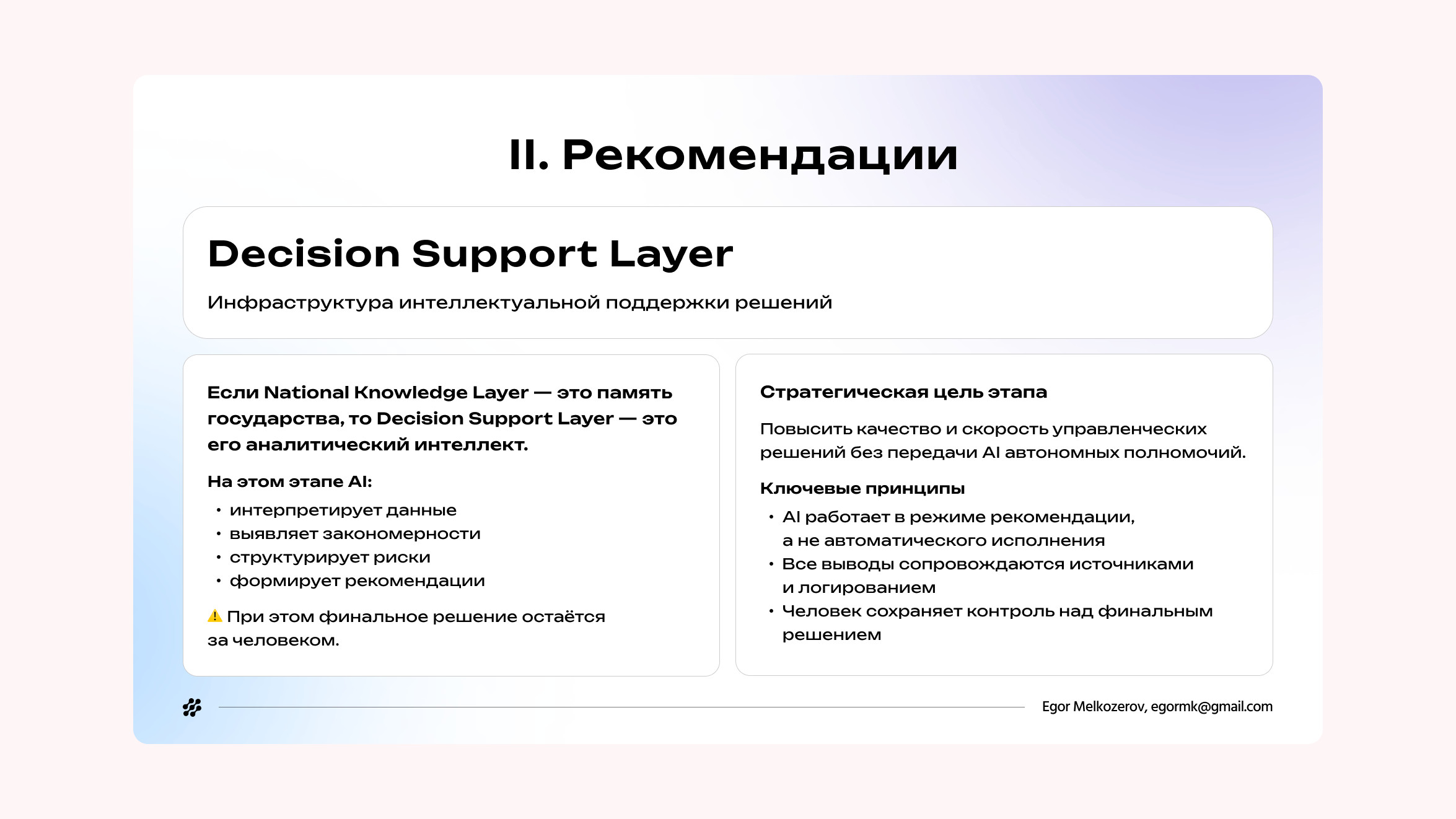 Я бы делал такую трансформацию в 3 этапа. Я бы начинал с создания AI Knowledge Layer — единого слоя знаний, на который потом сможет опираться вся AI-инфраструктура республики. На этом этапе мы оцифровываем регламенты, документы и стандарты, определяем роли доступа, загружаем всю информацию в специальную базу и строим RAG-слой как универсальный API-контур. Дальше к нему уже могут подключаться разные AI-агенты и сервисы. По сути, сначала AI должен стать цифровым справочником государства: надежным интеллектуальным слоем, который умеет находить нужную информацию и отдавать ее в разные каналы — внутренним помощникам, внешним консультантам и отраслевым AI-сервисам. Архитектура здесь должна быть выстроена так, чтобы при любом изменении документов новая информация сразу попадала в общий knowledge layer и автоматически становилась доступной всем подключенным AI-агентам, без ручного обновления каждого решения по отдельности. Итого получается один слой знаний и много интерфейсов и сервисов поверх него. У этого этапа уже есть вполне конкретные прикладные кейсы. Внутренний помощник, который отвечает на вопросы сотрудников в свободной форме, находит релевантные нормы, регламенты и внутренние документы с указанием источников. Такой сервис сокращает время поиска информации, снижает ошибки в трактовке и ускоряет принятие решений. Единая точка входа для граждан и бизнеса на базе общего Knowledge Layer. Такой консультант может объяснять процедуры, подсказывать порядок действий и помогать ориентироваться в государственных сервисах. При этом для отдельных ведомств могут работать свои специализированные AI-консультанты на том же общем слое знаний. Отдельный помощник для туристического контура: он может собирать информацию о стране в одном интерфейсе, помогать с маршрутами, объектами, событиями, транспортом и правилами посещения. Для Сан-Марино это хороший пример того, как единый knowledge layer может работать еще и на внешний пользовательский опыт страны. Помогает компаниям понять, какие программы поддержки, режимы и инициативы им подходят. Это упрощает доступ к возможностям и делает саму экосистему понятнее для пользователя. Объясняет, как должна быть устроена заявка, какие требования к ней предъявляются и на что опираться при подготовке. Такой сервис снижает число неполных и некорректных заявок еще до того, как они попадают на рассмотрение. Если смотреть шире, смысл первого этапа в том, что сначала республика собирает и структурирует знания, превращает их в общий AI-слой, и только потом строит поверх него следующие сервисы. Это самый фундаментальный этап, потому что без него все остальное придется каждый раз собирать заново. Когда единый слой знаний уже собран, можно переходить ко второму этапу — Decision Support Layer. Здесь AI уже работает как интеллектуальный помощник для анализа и поддержки решений. Он помогает интерпретировать данные, видеть закономерности, находить риски и быстрее готовить выводы, но не забирает у человека право финального решения. На этом этапе AI уже можно встраивать в реальные прикладные сценарии, где важны не только ответы по базе знаний, но и аналитика. Инструмент, который анализирует законопроекты и внутренние документы на соответствие действующей нормативной базе, выявляет потенциальные противоречия, дублирование и регуляторные риски. Такой кей