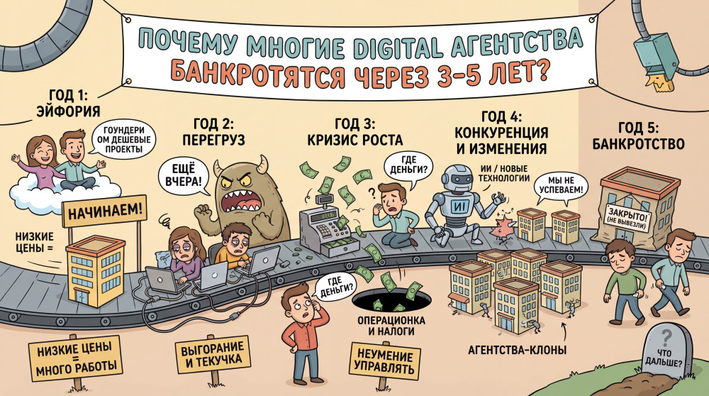 Почему digital-агентства закрываются на 3–5 году: юнит-экономика, хаос процессов и кассовые разрывы
