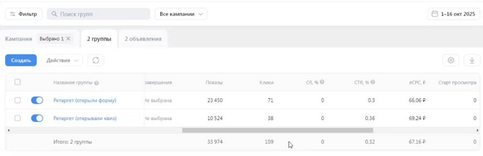Дальше запускаю объявления на каждую группу, потом смотрю цифры. Что работает — масштабируем, что нет — отключаем.