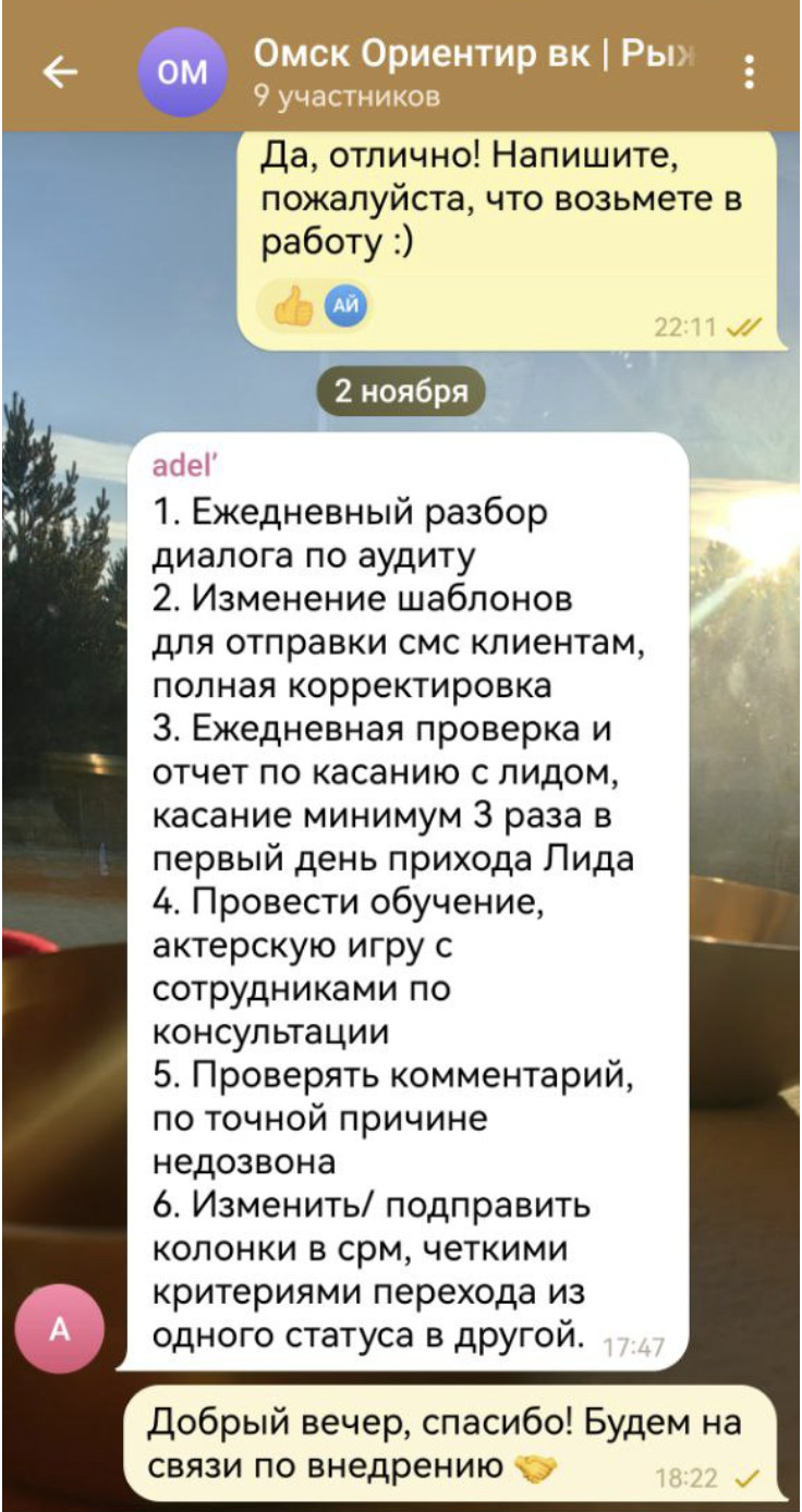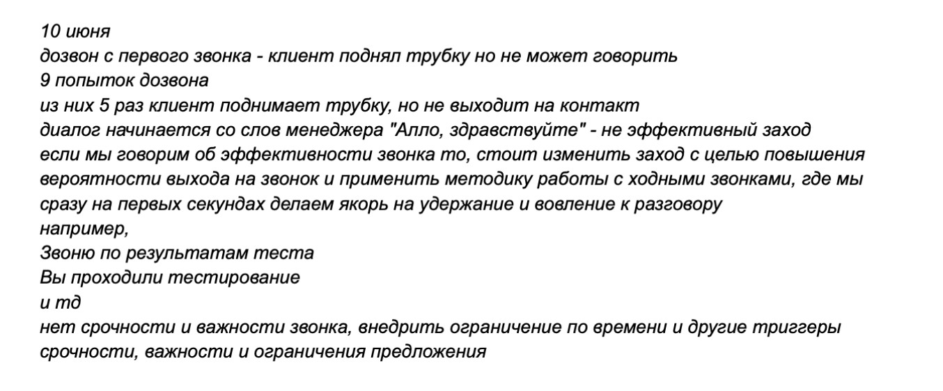Как это выглядит, смотрите на скрине из нашего отчета по аудиту обработки лидов и обновлению воронки: Наш подход состоит из нескольких этапов: Ответственность за результат делится пополам. Мы отвечаем за качество трафика, а клиент за работу менеджеров. Если кто-то халтурит, то деньги теряются. Так мы помогаем улучшать работу менеджеров: Да, есть AI-сервисы для анализа звонков, но они не чувствуют тон of voice, настроение менеджера и сложные человеческие нюансы. Особенно в нашей нише, где люди готовы «отдать последнюю почку», ошибки критичны. AI подходит, когда есть четкий скрипт и конечная цель звонка. Но оценить активность, эмоциональный контакт, умение вести переговоры может только человек. После проведения аудита мы не исчезаем и не оставляем клиента наедине с отчетом. Мы постоянно переписываемся, обсуждаем внедрение рекомендаций и корректируем действия по ходу работы. Такой живой контакт позволяет сразу видеть, что сработало, а что нет, и вовремя подсказывать, как исправить ситуацию. Конкретно мы делаем так: Динамику развития компании можно посмотреть на скрине: В нашей практике был кейс, когда, в одной компании после внедрения отчета контроля качества 3 из 10 компаний полностью пересмотрели работу с менеджерами: кого-то сократили, кого-то обучили. В другом случае динамика нового сотрудника показала рост эффективности: с 72 до 95 баллов по нашему чек-листу оценки звонков. Это доказывает, что регулярный контроль и обучение реально увеличивают конверсию и прибыль. Еще один важный момент: регулярность. Когда отчеты делались раз в две недели вместо еженедельно, мы сразу наблюдали снижение качества работы сотрудников. Системность критически важна для удержания лидов и повышения конверсии. Наши клиенты быстро достигают результатов. Вот данные за последние 3 месяца проектной работы: Если вы хотите получить подобный аудит для вашей компании, переходите в телеграм-канал! Мы покажем, как исправить недозвоны, повысить конверсию и построить эффективную воронку продаж.