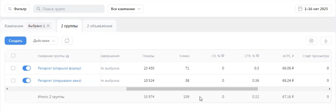 Дальше запускаю объявления на каждую группу, потом смотрю цифры. Что работает — масштабируем, что нет — отключаем.