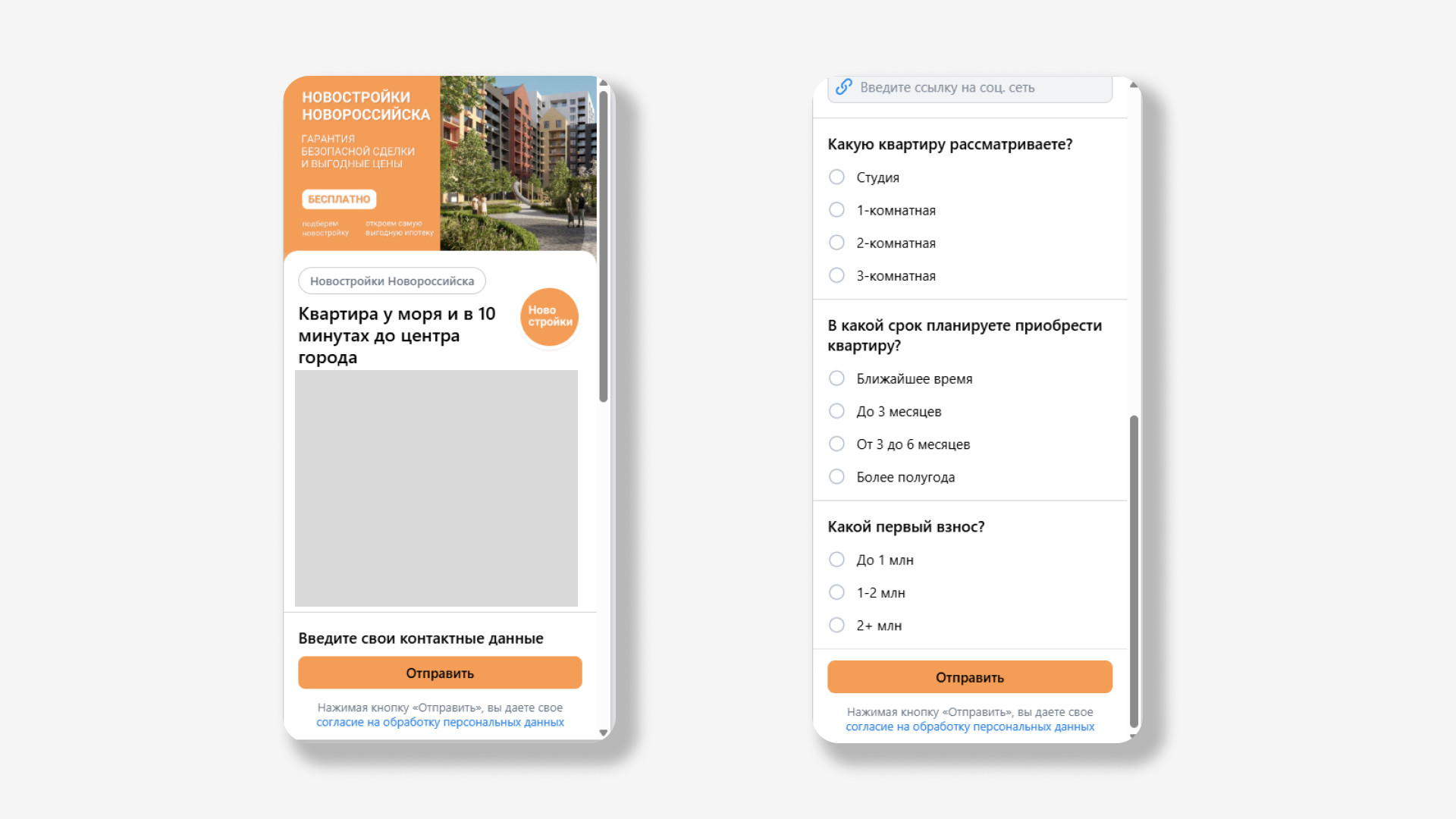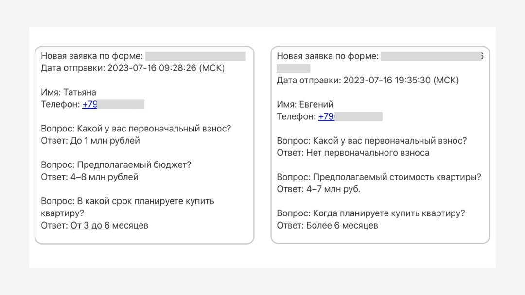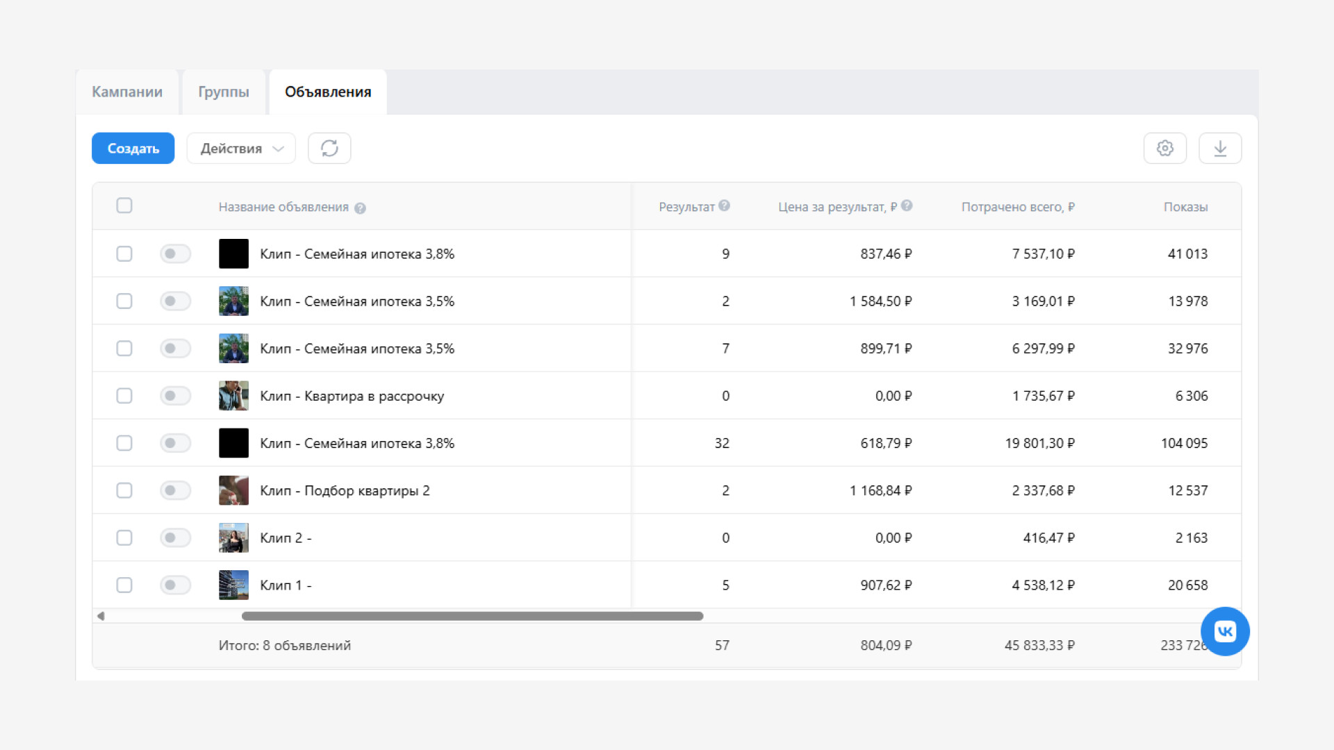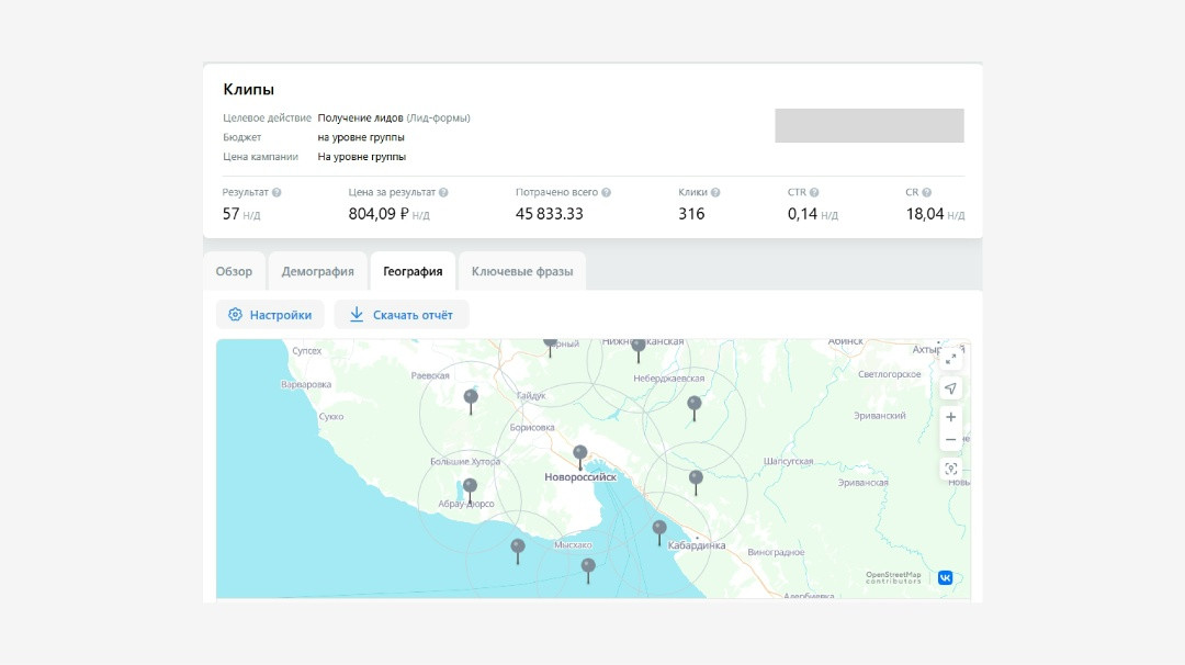 Риэлтор из Новороссийска Новороссийск и вся РФ (для тех, кто хочет купить квартиру в Новороссийске) За 1 месяц получили 57 заявок по 804 руб. На старте не было стабильного канала заявок из ВК, не было чёткого понимания, какие форматы и офферы будут работать именно в этом городе. Не было выстроенной системы тестирования гипотез. Запрос клиента звучал просто и честно: «Нужен поток заявок из ВКонтакте по приемлемой цене». Без завышенных ожиданий, без фантазий про «100 заявок по 200 рублей», а с фокусом на реальный, рабочий результат. Этот проект мы выстраивали как классическую, но глубоко проработанную лидогенерацию под недвижимость, где важна не только цена заявки, но и её качество. Ниже — подробно по каждому этапу работы. Работу начали с создания рабочего чата с клиентом. Для нас это обязательный элемент всех проектов, потому что: На этом этапе мы: Важно: у клиента не было чёткой статистики «до». Поэтому мы изначально выстраивали проект не как оптимизацию старой рекламы, а как запуск с нуля с тестированием гипотез. Следующим важным шагом стало выбор эффективного инструмента для сбора заявок. Мы остановились на лид-формах, так как это наиболее удобный формат для пользователя: оставлять заявку можно было прямо в социальной сети без перехода на сайт. Такой формат значительно повышает конверсию, упрощая процесс взаимодействия. Процесс взаимодействия был максимально простым: Форма содержала минимальное количество полей — только действительно важные вопросы, чтобы не перегружать пользователя на этапе заявки.Запрашивались базовые данные: имя, номер телефона и несколько уточняющих параметров — тип недвижимости, желаемая стоимость квартиры и тп.Мы намеренно не усложняли анкету: задача была — собрать контактные данные быстро, пока мотивация пользователя находилась на пике. Ниже вы можете увидеть пример лид-формы. После того как пользователь отправляет заявку через лид-форму, все его данные автоматически приходят на вашу электронную почту.В письме содержится полная информация о клиенте: его имя, номер телефона, ответы на заданные в форме вопросы и время отправки заявки. Ниже вы можете увидеть пример заявок, которые приходят на почту после того, как человек заполнил лид-форму. Такой формат позволяет обеспечить оперативную обработку заявок: можно быстро связаться с заинтересованным человеком, уточнить детали запроса и предложить наиболее подходящие варианты недвижимости. Тут вы можете увидеть какие бывают заявки с лид-форм. Мы сразу заложили две ключевые географии: Такой подход позволил: Ниже вы можете увидеть скриншот статистики из рекламного кабинета: В этом проекте мы осознанно отказались от статических креативов. Причины простые и подтверждённые практикой: Для недвижимости это критично: человек сначала должен «почувствовать», а уже потом оставить заявку. Поэтому: Тут вы можете увидеть примеры клипов: Мы не использовали абстрактные формулировки вроде «квартиры у моря». Вместо этого сделали упор на конкретные финансовые триггеры, которые реально двигают аудиторию к заявке: В клипах: Это позволило: В течение месяца работа велась в постоянном режиме контроля: Ключевая логика — не держаться за креативы, а держаться за цифры. Тут вы можете увидеть скриншоты из рекламного кабинета: Тестирование гипотез: на старте мы сформировали нес
