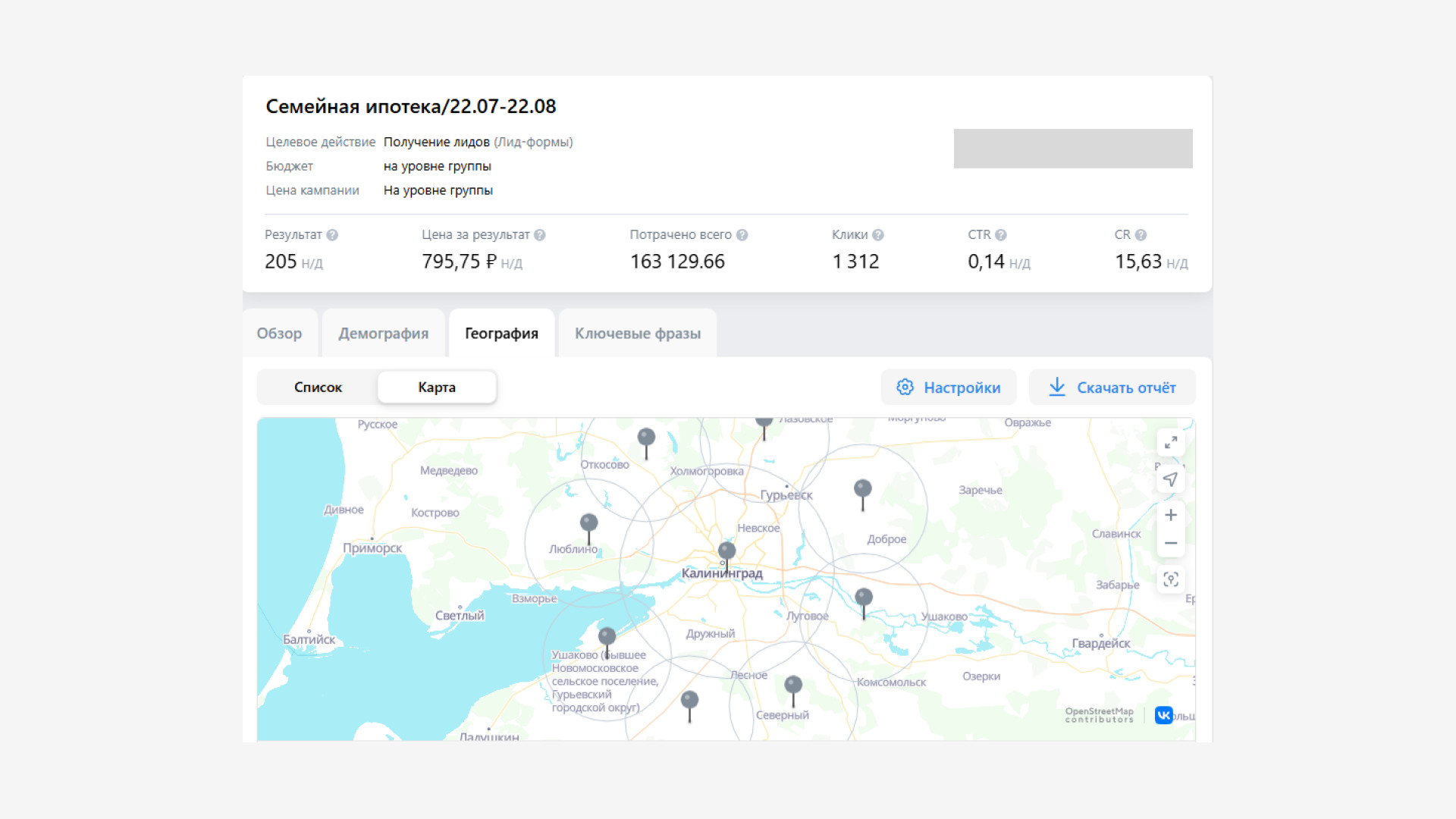 Клиент включился в процесс быстро. Это сильно ускорило тестирование гипотез. В недвижимости скорость реакции часто определяет экономику проекта. Мы не пошли по пути "запустим одну кампанию и посмотрим".С самого начала закладывали масштаб тестирования. За период работы было протестировано: Первоначально реклама запускалась по двум направлениям: новостройки и дома. Однако в процессе анализа спроса и качества лидов стало понятно, что для текущей стратегии клиента новостройки приоритетнее. Дома отключили, чтобы не распылять бюджет. Это важный момент. Мы не держимся за гипотезы из принципа. Если направление не даёт стратегической ценности — его убираем. Тут вы можете увидеть скриншоты из рекламного кабинета: Рекламу вели напрямую на лид-формы ВКонтакте. В недвижимости каждый лишний шаг снижает конверсию. Если отправить человека на сайт, где нужно изучать планировки, читать характеристики, считать ипотеку — часть аудитории просто уйдёт. Лид-форма позволяет: Для регионального рынка это оказалось оптимальным решением. Когда клиент заинтересован в вашем предложении, он может оставить заявку, заполнив форму прямо внутри ВКонтакте — ему не нужно переходить на сайт или открывать дополнительные окна. В этой форме ему будет предложено ответить на несколько вопросов, которые помогут вам лучше понять его потребности. Например, интересующий тип недвижимости, бюджет, местоположение, а также желаемые сроки покупки. Ниже вы можете увидеть пример лид-формы. После того как клиент заполняет и отправляет форму, вы получаете уведомление на свою электронную почту. В этом уведомлении будет содержаться вся необходимая информация: номер телефона клиента, ответы на заданные вопросы, ссылка на его профиль ВКонтакте и время, когда была отправлена заявка. Ниже вы можете увидеть пример заявок, которые приходят на почту после того, как человек заполнил лид-форму. Это позволяет вам оперативно связаться с потенциальным клиентом и начать общение. Чем быстрее вы откликнетесь, тем выше вероятность, что клиента заинтересует ваше предложение и он примет решение о сотрудничестве. Тут вы можете увидеть какие бывают заявки с лид-форм. Мы тестировали два формата: статические изображения и клипы. Статика строилась на понятных триггерах:планировка + минимальный ежемесячный платеж.Аудитория недвижимости мыслит цифрами. «Сколько стоит?» и «Сколько в месяц?» — два главных вопроса. Тут вы можете увидеть пример статических креативов: Видео-контент во ВКонтакте имеет приоритет в алгоритмах. Но важно не просто снять ролик, а выстроить структуру. Мы использовали принцип:оффер в первые 15 секунд. Без длинных вступлений. Без разгона. Сразу конкретика: ипотека, минимальный платеж, район, выгода. Добавляли субтитры — значительная часть пользователей смотрит без звука.В конце — обязательный призыв оставить заявку. Именно клипы начали давать самые дешёвые заявки. Некоторые объявления выходили на стоимость ниже 500 рублей. В результате именно видеоформат был оставлен в качестве основного инструмента масштабирования. Ниже вы можете увидеть пример рекламы на клипы: Самой эффективной стала кампания по семейной ипотеке. Она принесла: 205 заявок по 795 рублей за обращение. Это ниже средней стоимости по проекту.Мы усилили бюджет на эту связку и постепенно масштабировали её. Поче