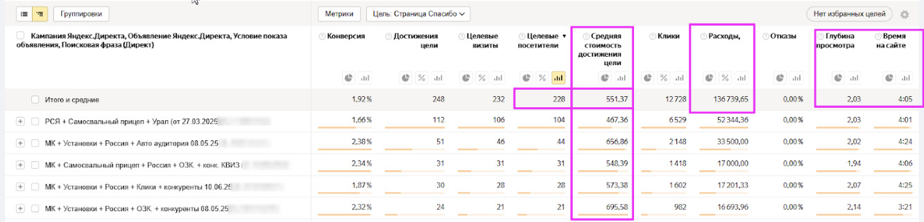 На старте задачей было обеспечить поток заявок на самосвальные прицепы с минимальной стоимостью лида. Изначально цена цели для разгона трафика составляла 1200 ₽, затем поэтапно снижена до 500 ₽. Кампании начали стабильно давать конверсии с выходом на страницу «Спасибо» в рамках KPI.