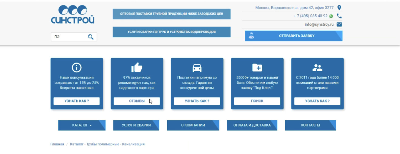 Клиент — компания Синстрой, поставщик инженерного оборудования под ключ для строительных объектов: трубы, фитинги, резиновые прокладки, монтажные элементы и колодцы. Основная задача — увеличить трафик на сайт, повысить количество заявок от юридических лиц и оптовых покупателей, одновременно минимизируя заявки от физических лиц, перекупщиков и «торгашей».