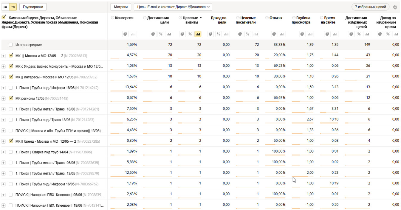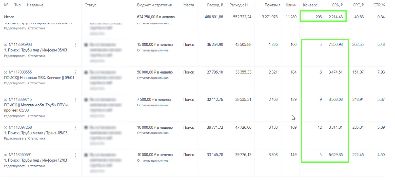 Рекламный бюджет на старт составлял 250 000 ₽ в месяц. Кампании строились на основе семантического ядра по продуктам: транзакционные и общие запросы, включая «трубы ПНД оптом», «трубы ПВХ оптом», «монтаж труб», «сварка труб», «трубы в ППУ изоляции», «гофра труба ПНД», «дренажные трубы», «колодцы из пластика».
