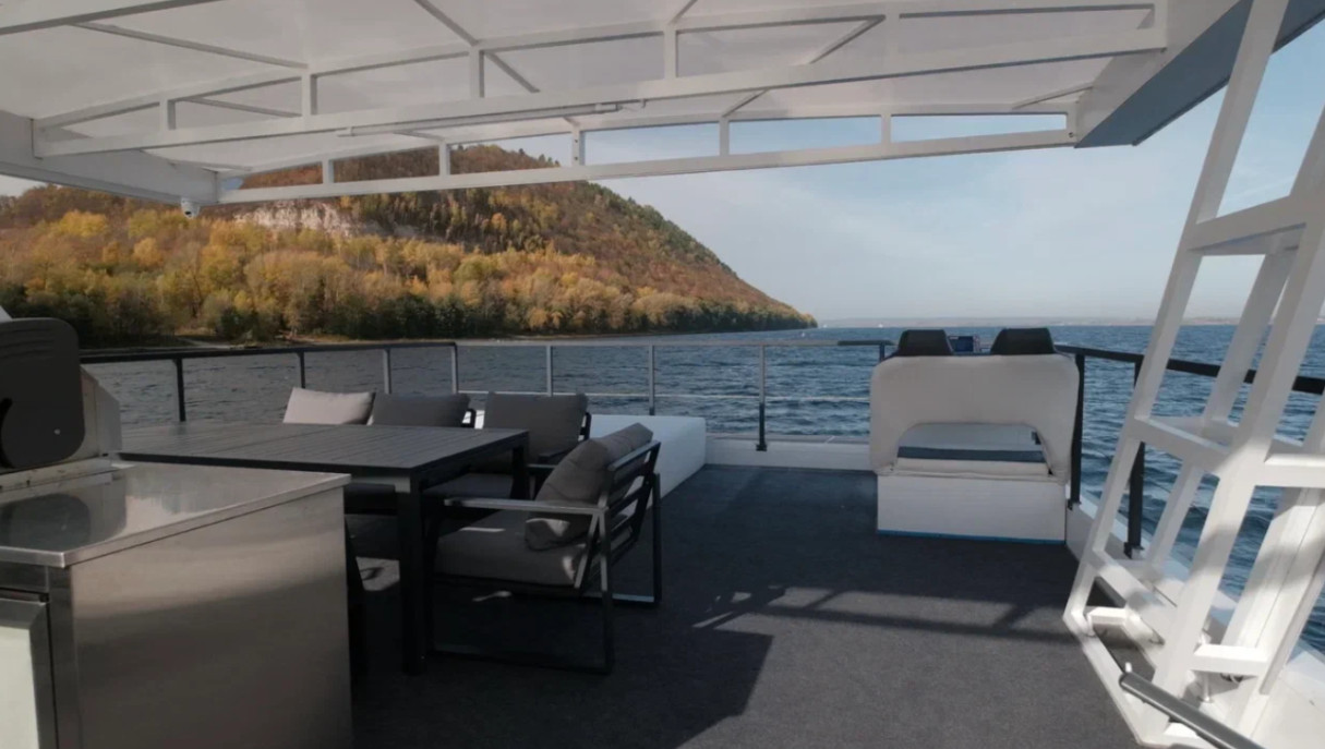 Площадь и планировка подбираются индивидуально. Средний метраж двухэтажного плавучего дома составляет около 108 кв. м. Стандартная планировка включает гостиную, кухню, санузел и спальню. Во всех проектах предусмотрена открытая терраса или веранда. Часто используется эксплуатируемая крыша, где размещают зону отдыха или шезлонги. Панорамные окна обеспечивают максимальный обзор и наполняют пространство естественным светом.